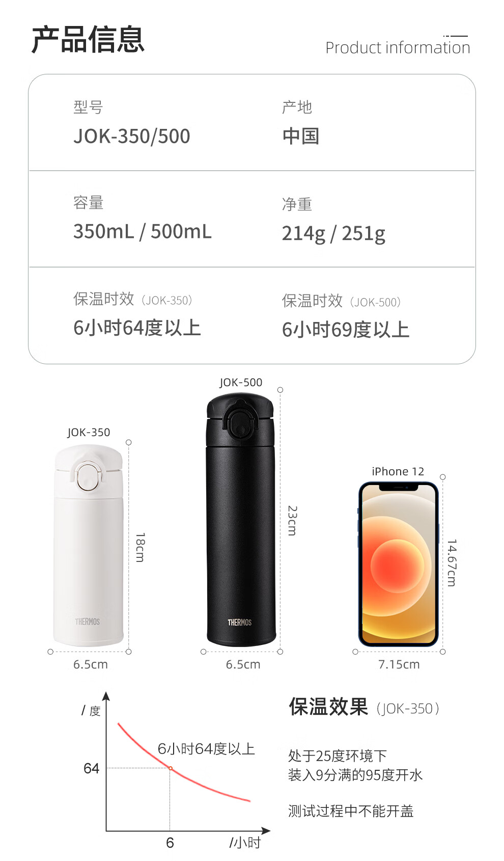 膳魔师(THERMOS)保温杯女新款进口便携保温水杯JOK BK-黑色 350mL