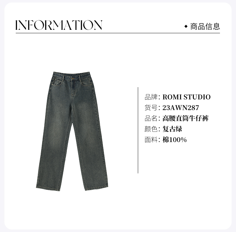 ROMI STUDIO“棕标系列”100%棉腔调穿搭直筒复古绿牛仔裤23AWN287
