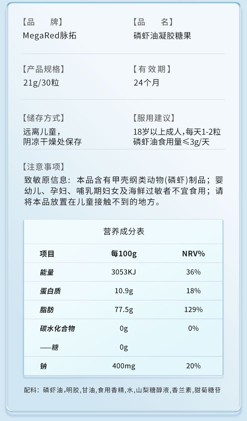 脉拓磷虾油凝胶糖果30粒
