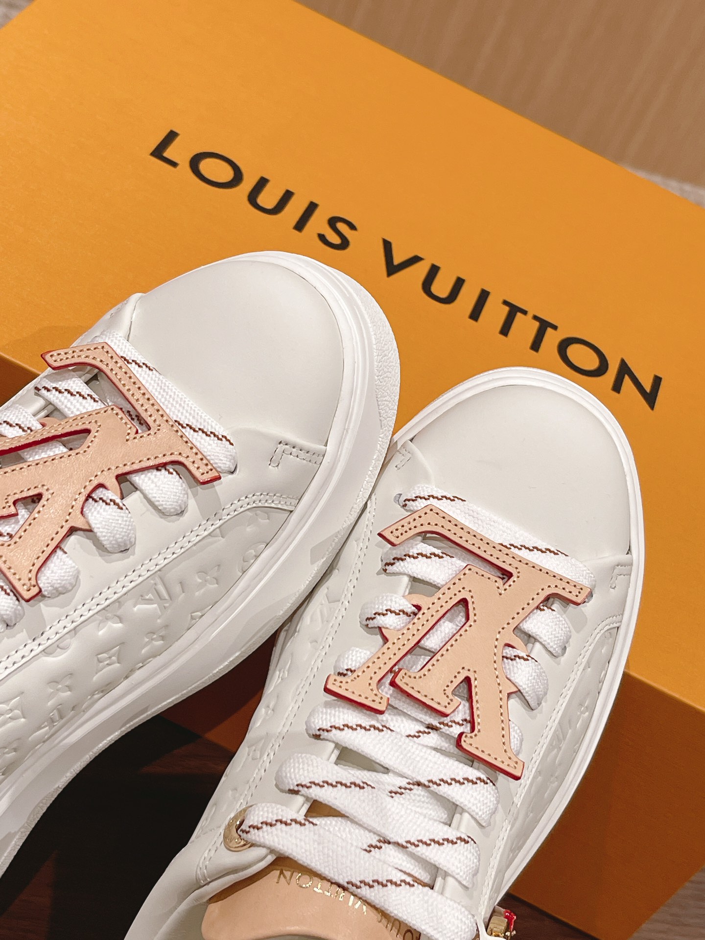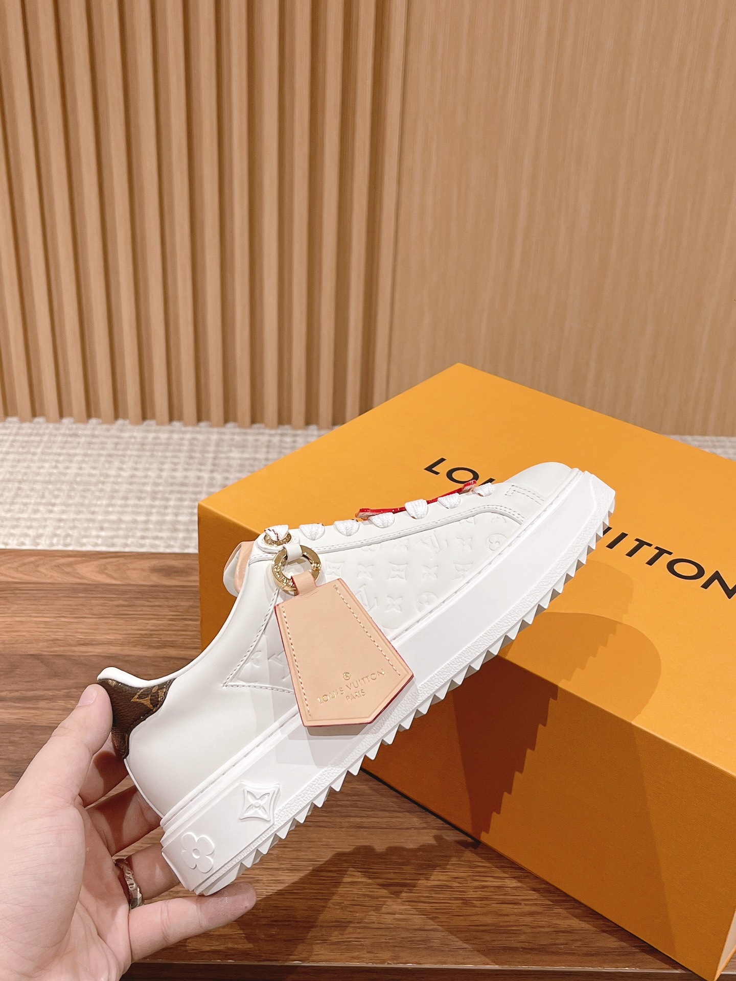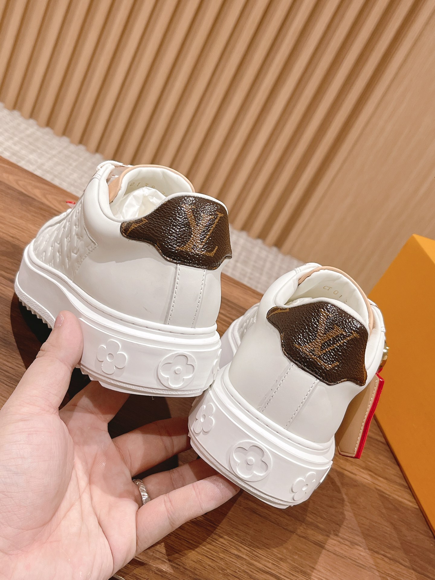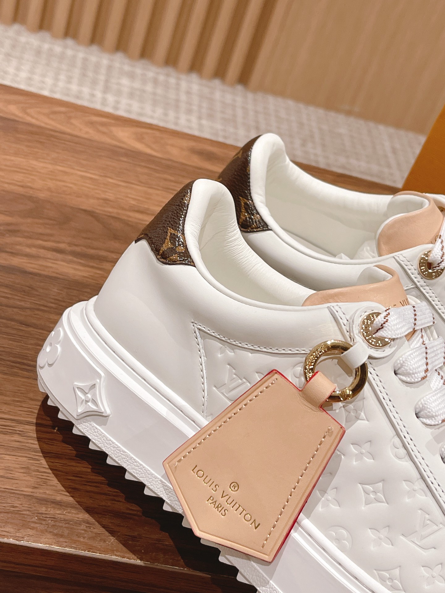 Louis Vuitton 路易威登经典厚底运动鞋2023春夏新版面 老花monogram皮革logo挂饰,精致绝伦! 本款Time Out 运动鞋取材柔软牛皮革,以耀眼光泽点亮侧面心标识。铭纹孔眼和后部金属质感皮革饰边丰富细节,加厚橡胶外底绽放 Monogram 花卉
