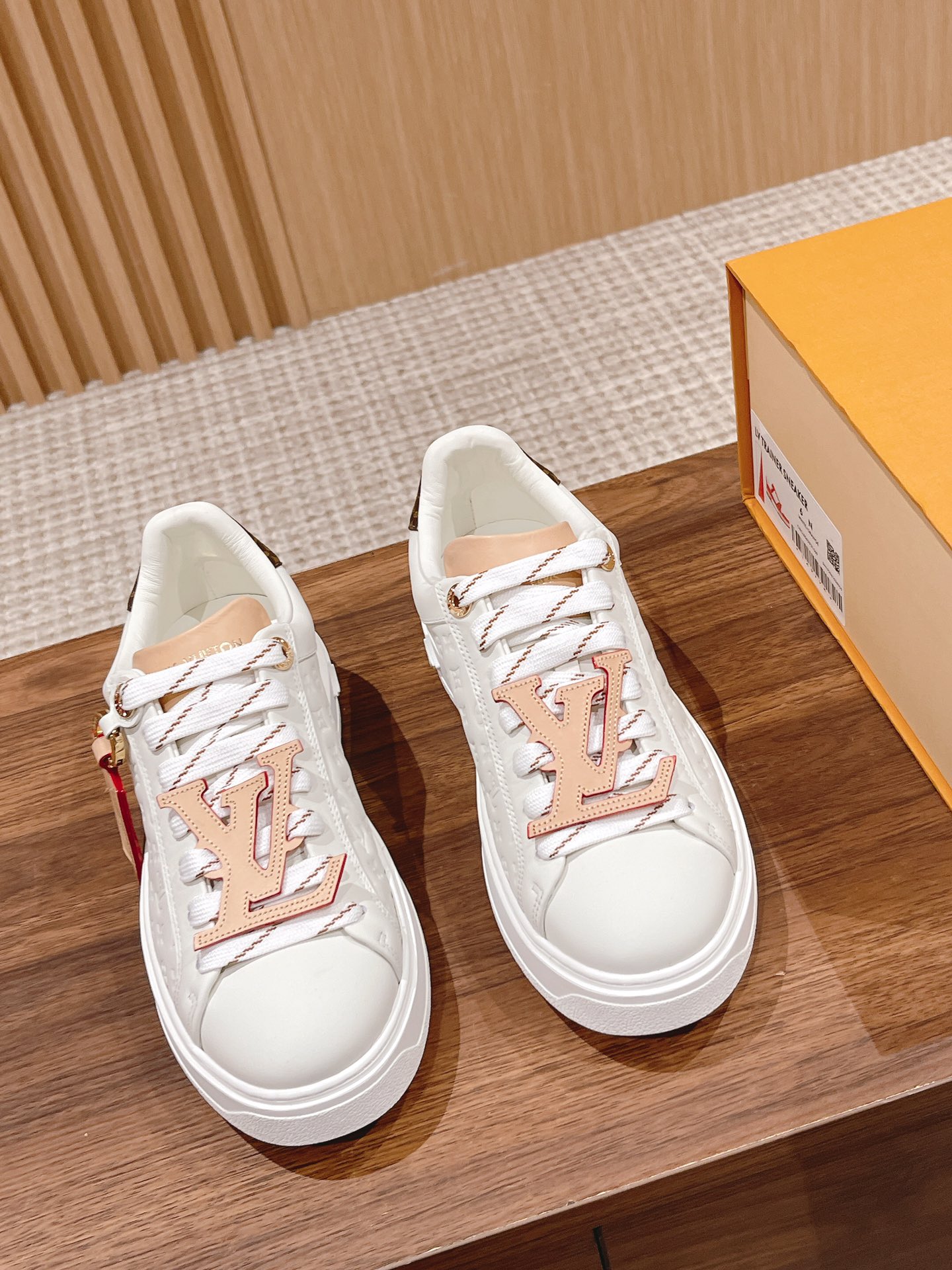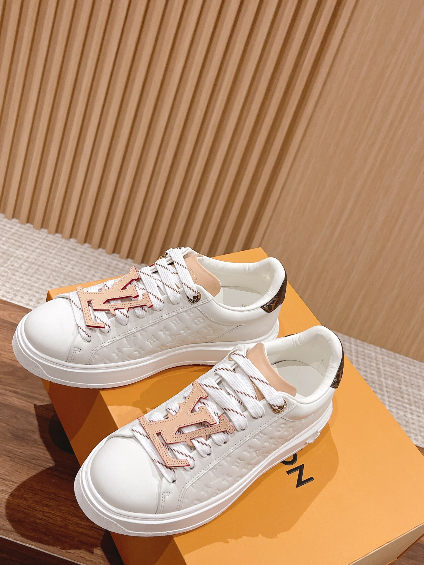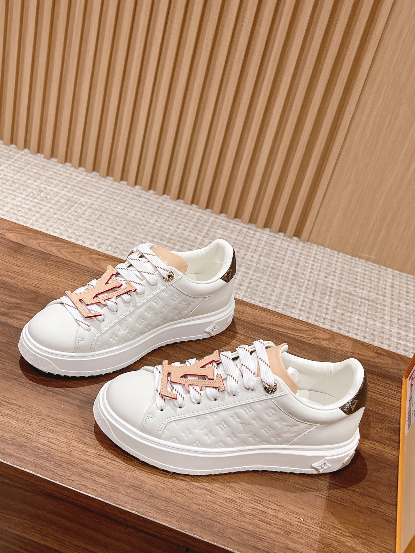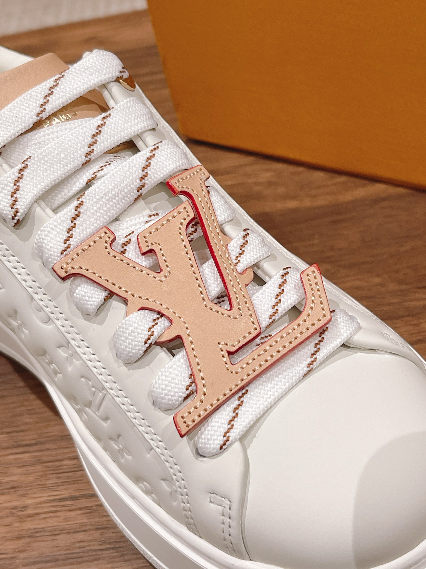 Louis Vuitton 路易威登经典厚底运动鞋2023春夏新版面 老花monogram皮革logo挂饰,精致绝伦! 本款Time Out 运动鞋取材柔软牛皮革,以耀眼光泽点亮侧面心标识。铭纹孔眼和后部金属质感皮革饰边丰富细节,加厚橡胶外底绽放 Monogram 花卉