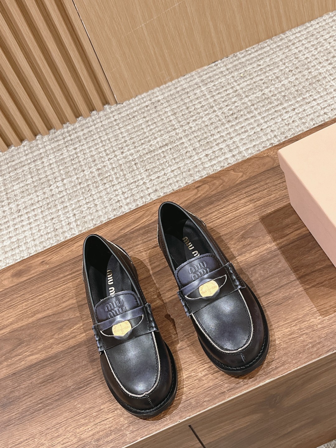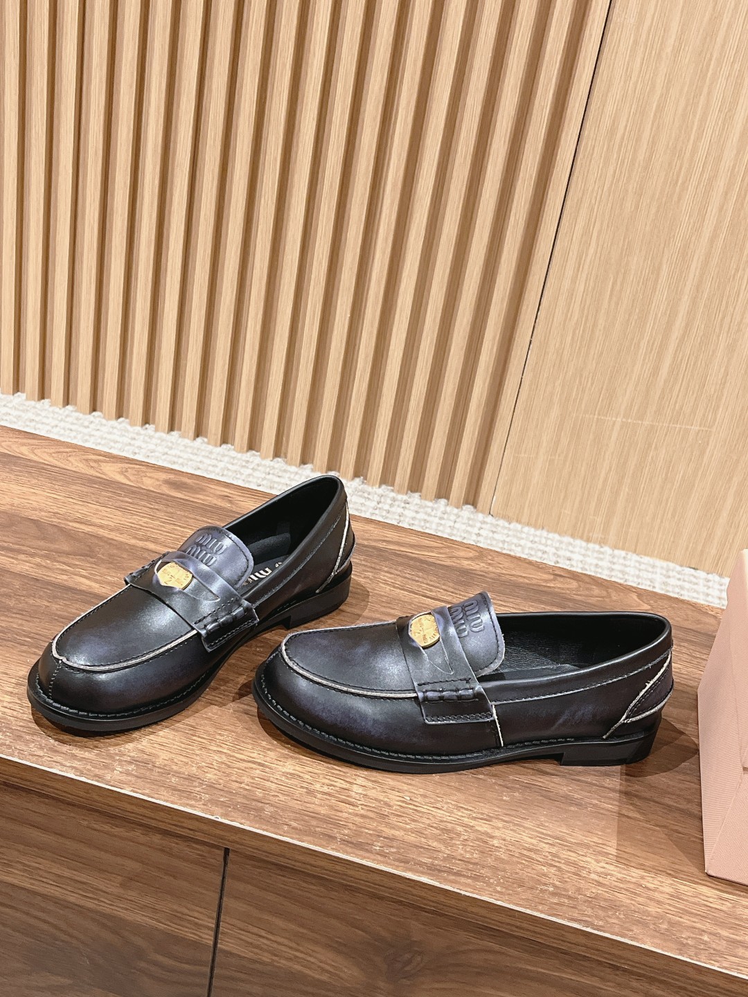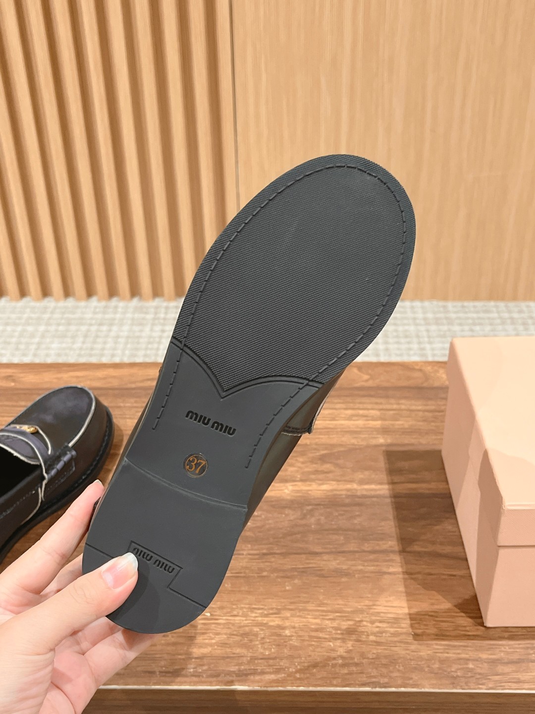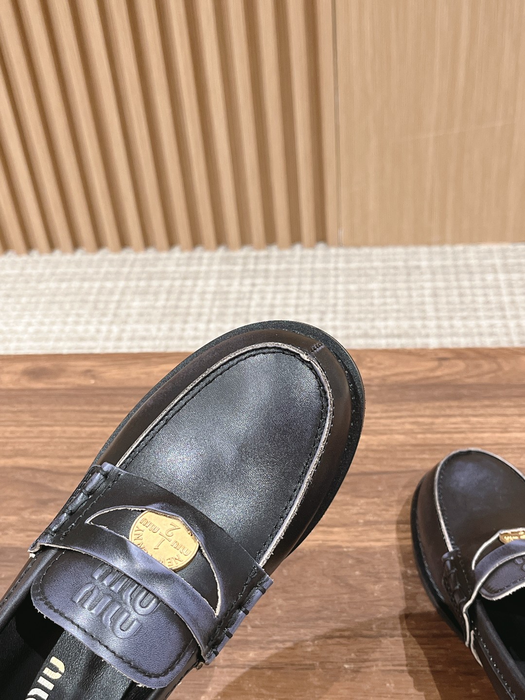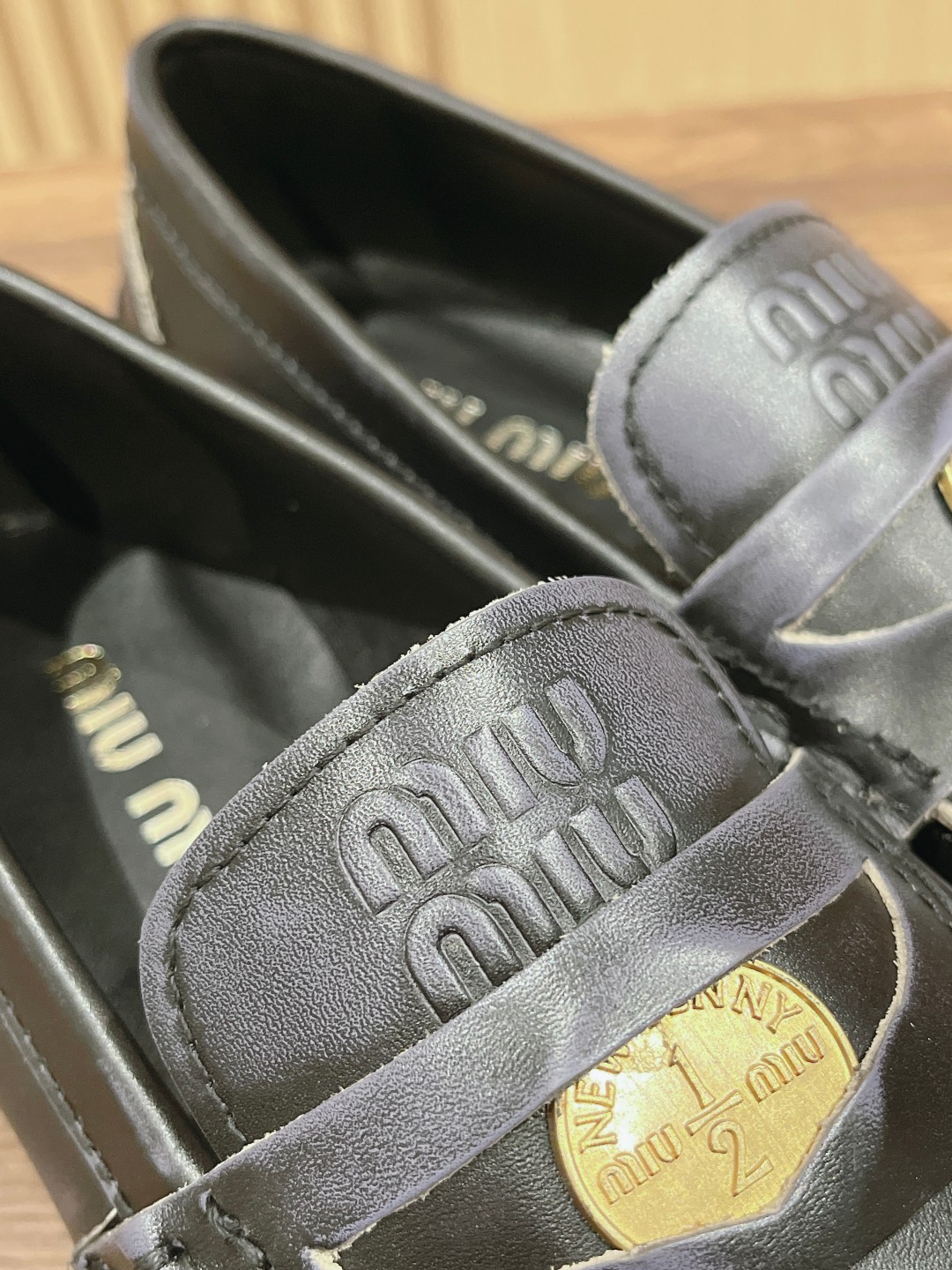 MiuMiu 缪缪爆款金币乐福鞋 Miu女孩们的新色乐福来啦!今年秋冬的复古做旧的新色 麂皮材质!今年Miu爆火的不要不要的!都是那种做旧的皮质 穿上超好看 时尚界的弄潮儿 鞋面:开边珠牛皮/麂皮 大底:原版开模大底