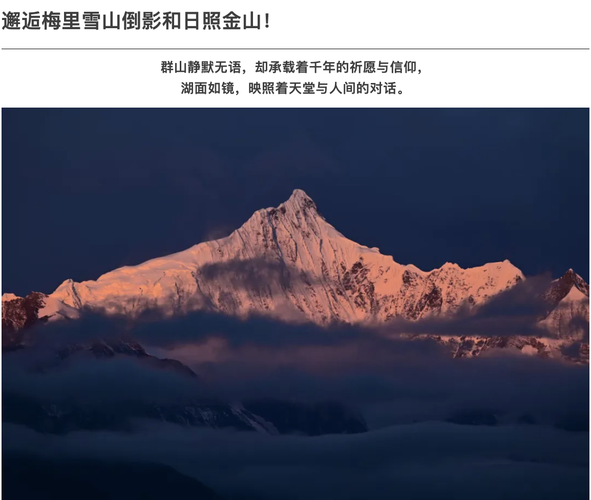 云南|梅里雪山和雪达湖3天2晚,看香格里拉最美秋冬景观,雪山倒影与日照金山的浪漫邂逅!冬季跨年可提前预定!