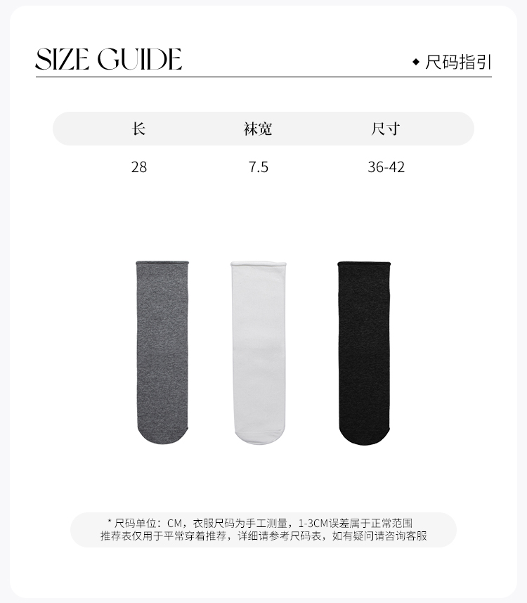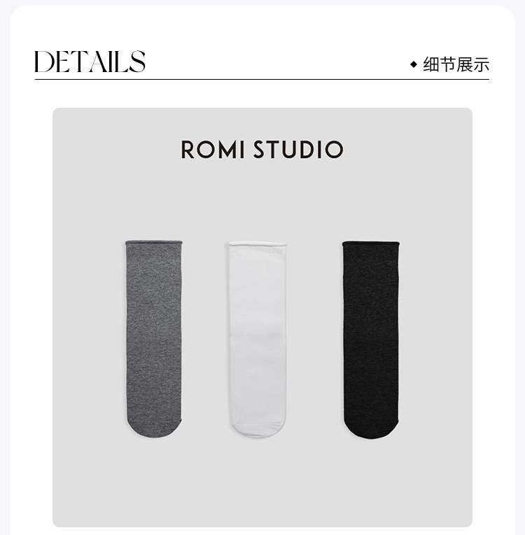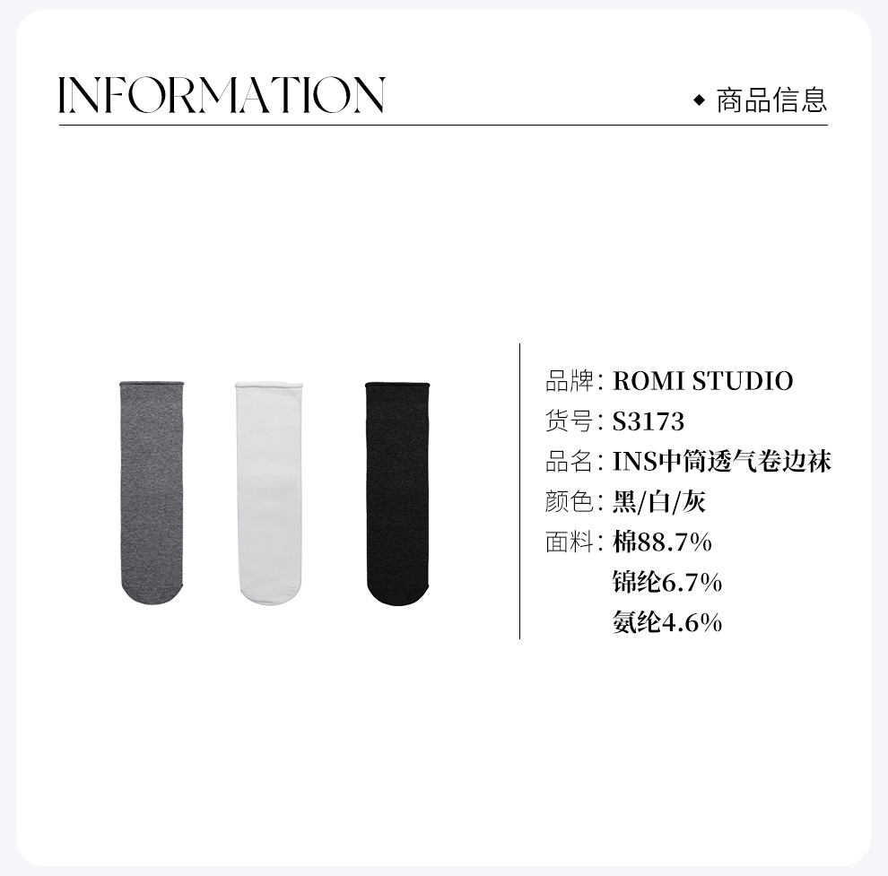 ROMI STUDIO极简百搭ins中筒卷边透气三色纯色中筒袜S3173