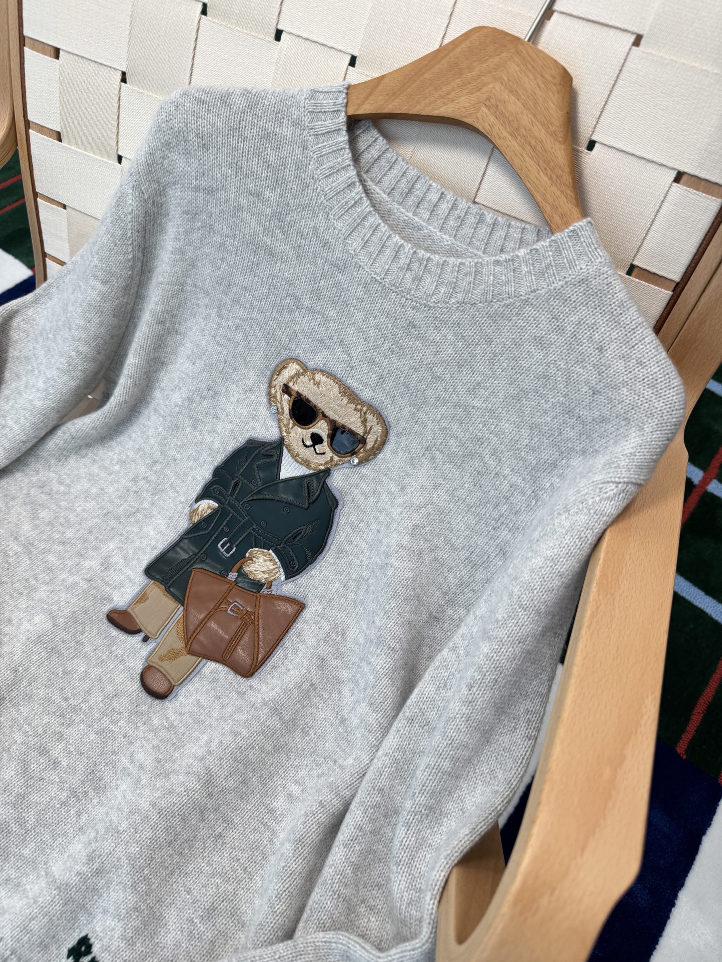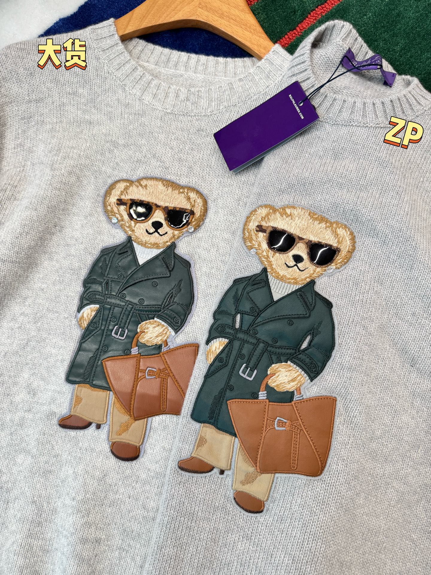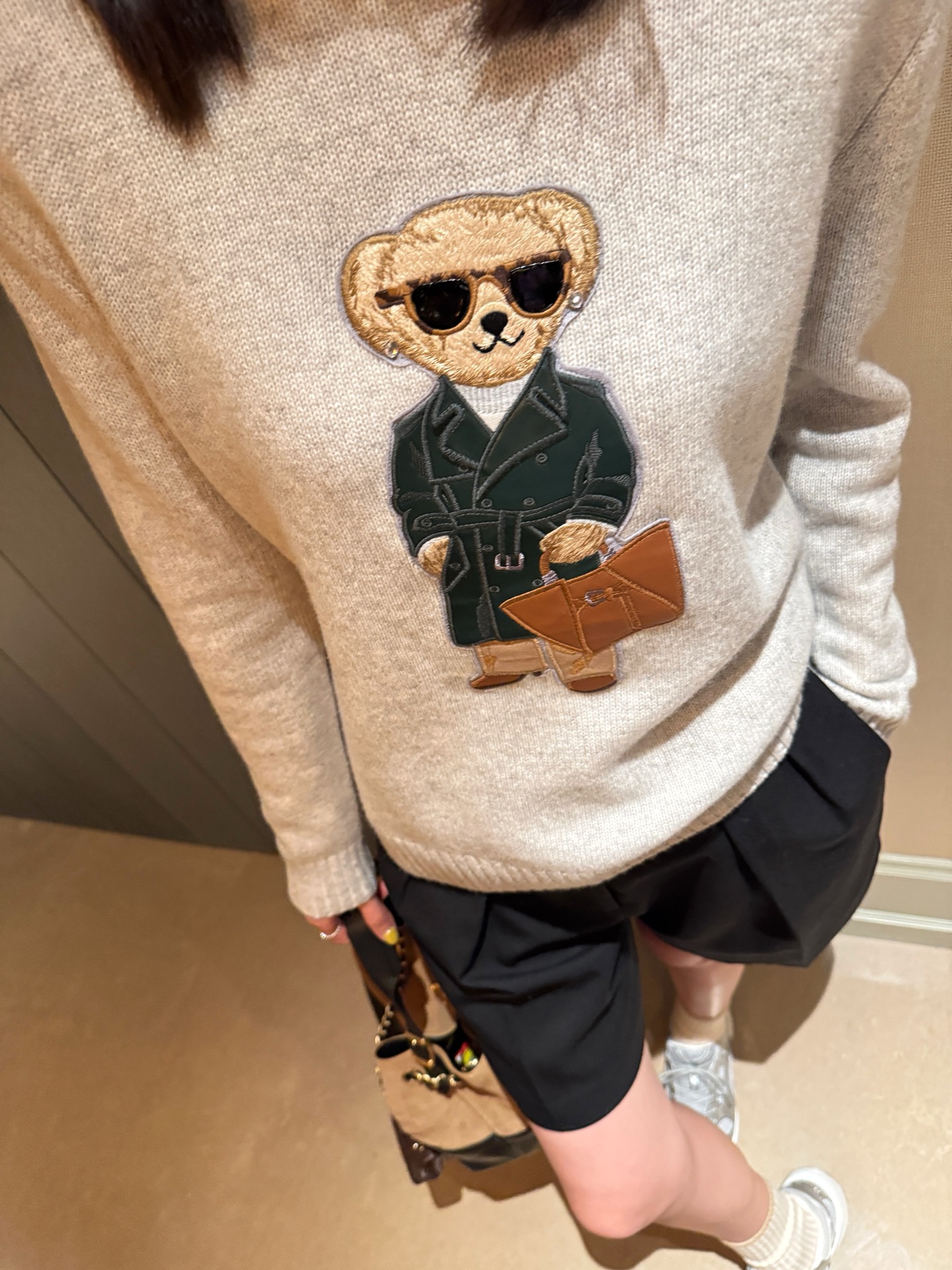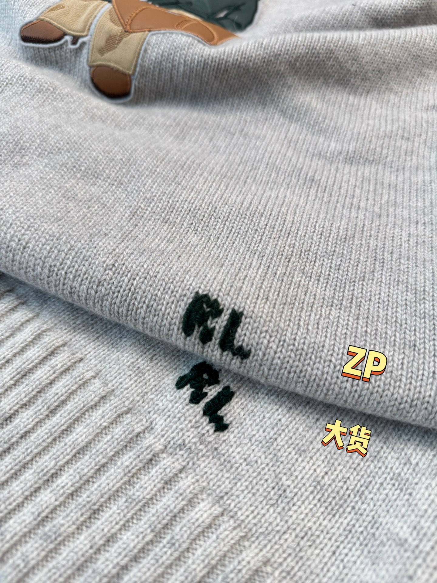 25年秋冬紫标系列最新款,灰色墨镜小熊针织衫✨真的很高级,满满的舒适松弛感,经典永不过时〰️采用进口德国机出品🔜 织造的成衣软糯而细腻,手感让人爱不释手, 贴身穿都很舒服,独家定制小熊刺绣贴!秋冬穿也非常有氛围感,很精致,显气质,一件几乎可搭配衣橱任何下装,随性又耐看, 这个冬天不能没有拉夫熊,码数SML