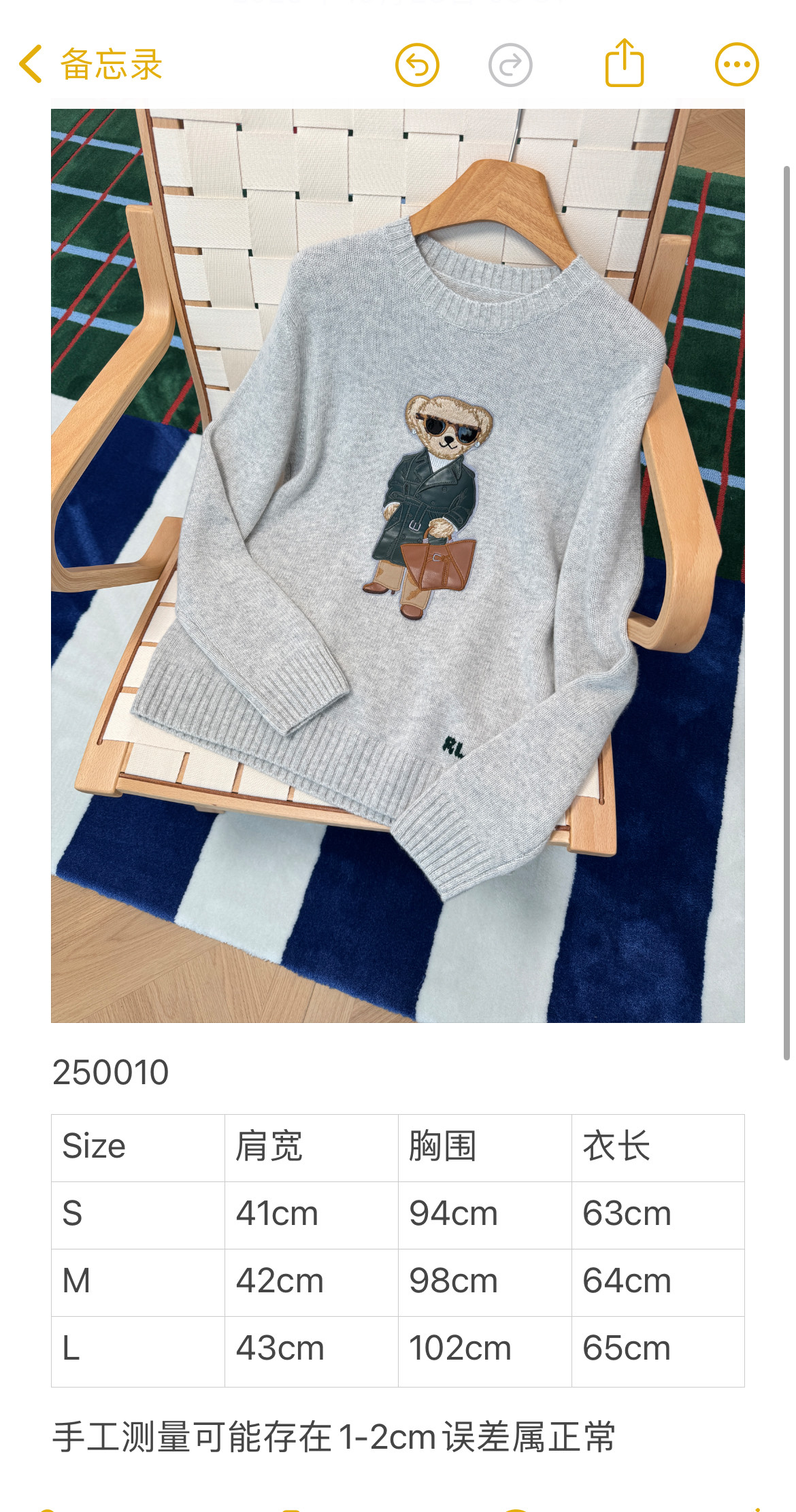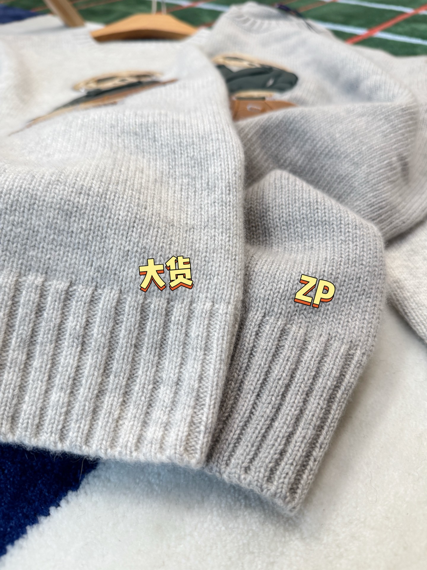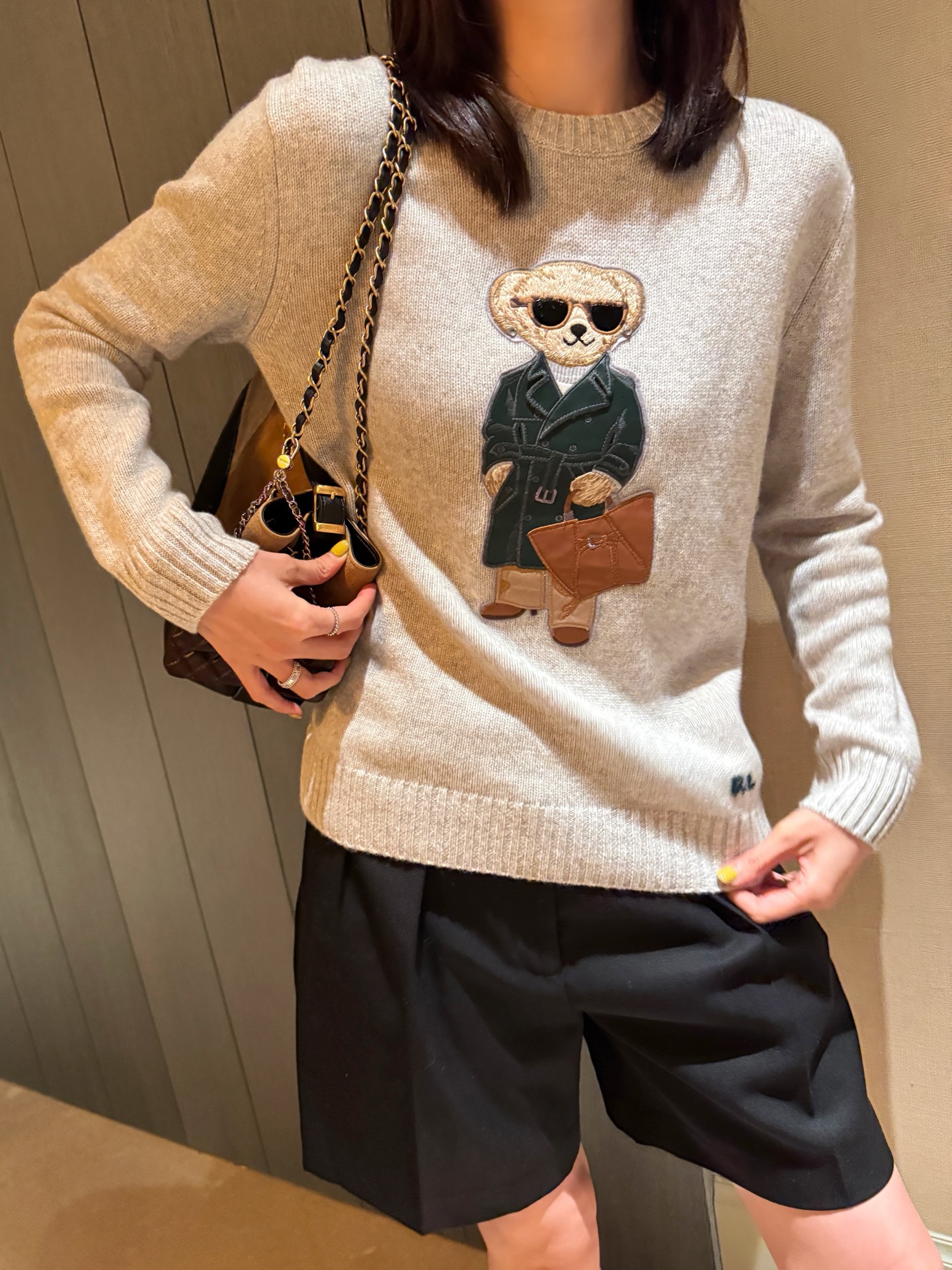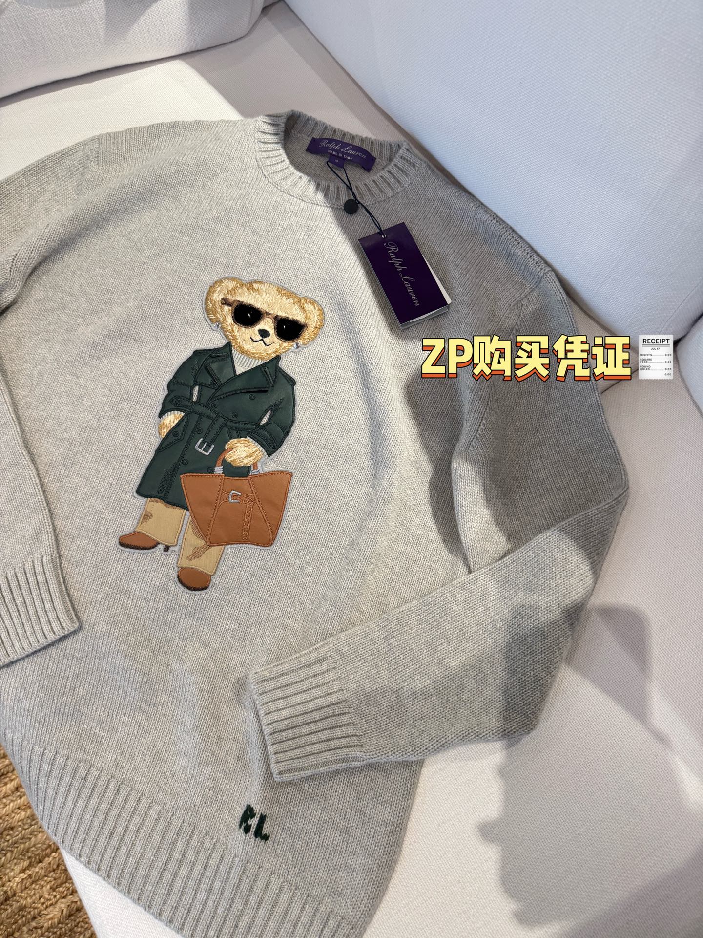 25年秋冬紫标系列最新款,灰色墨镜小熊针织衫✨真的很高级,满满的舒适松弛感,经典永不过时〰️采用进口德国机出品🔜 织造的成衣软糯而细腻,手感让人爱不释手, 贴身穿都很舒服,独家定制小熊刺绣贴!秋冬穿也非常有氛围感,很精致,显气质,一件几乎可搭配衣橱任何下装,随性又耐看, 这个冬天不能没有拉夫熊,码数SML