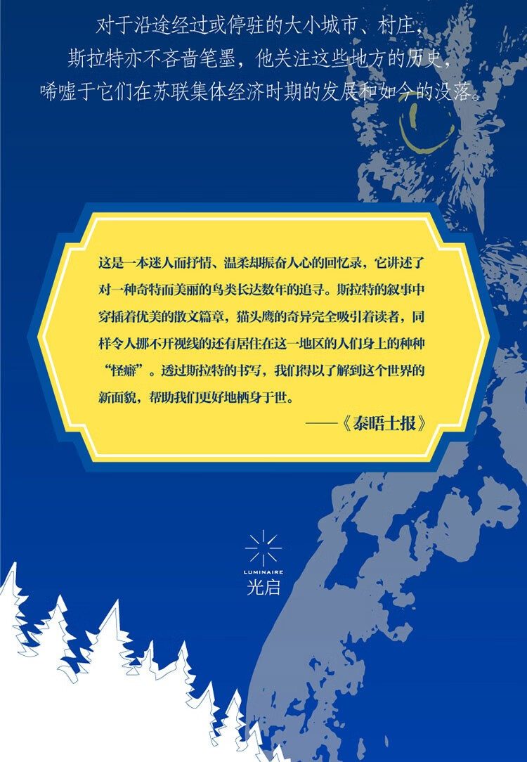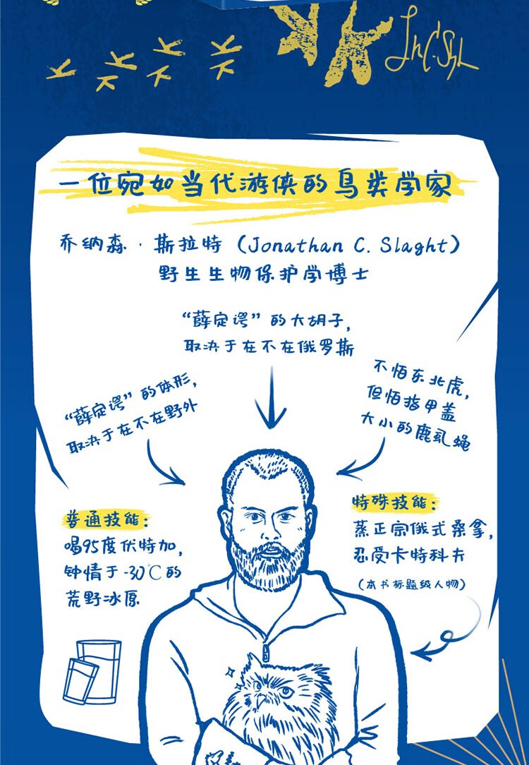 | 当乔纳森·斯拉特还是个观鸟新手时,他偶然遇到了地球上颇为神秘的一种鸟类,它比他所知的任何一只猫头鹰都大,看上去就像一只长着羽毛的小熊。他拍下一张照片,并分享给专家,这便是世界上体形硕大的猫头鹰——毛腿渔鸮。随后,斯拉特开始了为期五年的调研之旅,在俄罗斯东部茂密偏远的森林中寻找这种巨大而神秘的生物。 尽管毛腿渔鸮的翼展长度达6英尺,身高也超过2英尺,但它们总是神出鬼没,人类对其所知甚少,可供参考的资料也极为有限。它们在冬天蕞容易被发现,因为它们在觅食过程中会在雪域河岸上留下大而独特的足迹。毛腿渔鸮同时也是濒危物种。因此,斯拉特和他的团队开始着手捕获这种猫头鹰以做研究,并尝试据此制定出一个保护计划,以帮助这一物种存活下去。为了完成任务,他们不得不应对各种挑战:在冰冷的帐篷里通宵监测,疯狂地驶过将融的冰河,毫无防护地爬上朽烂的树木以检查巢穴中珍贵的渔鸮卵。为捕捉和追踪渔鸮,他们使用尖端的定位设备,亦即兴设计巧妙的陷阱,还必须始终警惕与熊或东北虎发生冲突。在斯拉特异常生动、精确,同时不失幽默的叙述下,毛腿渔鸮渐渐展露真容:它们是狡猾的猎人,忠诚的父母,怪异的“二重唱夫妇”,是不擅记仇且相对温顺的猛禽,也是在条件严酷、面积不断缩小的栖息地上顽强生存的珍稀物种。 除此之外,斯拉特还以令人捧腹的笔调描写了生活在俄罗斯边疆区域的各色人物:有似乎永远也不清醒、以伏特加为粮的嗜酒村民,有与黑帮交易失败后逃命至荒野的古怪隐居者,有为了可以卖10美元的貂皮而猎杀毛腿渔鸮作肉饵的无知少年……对于沿途经过或停驻的大小城市、村庄,斯拉特亦不吝啬笔墨,关注这些地方的历史,以及它们在苏联集体经济时期的发展和如今的没落。 斯拉特以一份惊心动魄的田野笔记,向读者全面展现了这片远东冰原上的生灵、人类、居住地、自然景观及文化风貌。 |