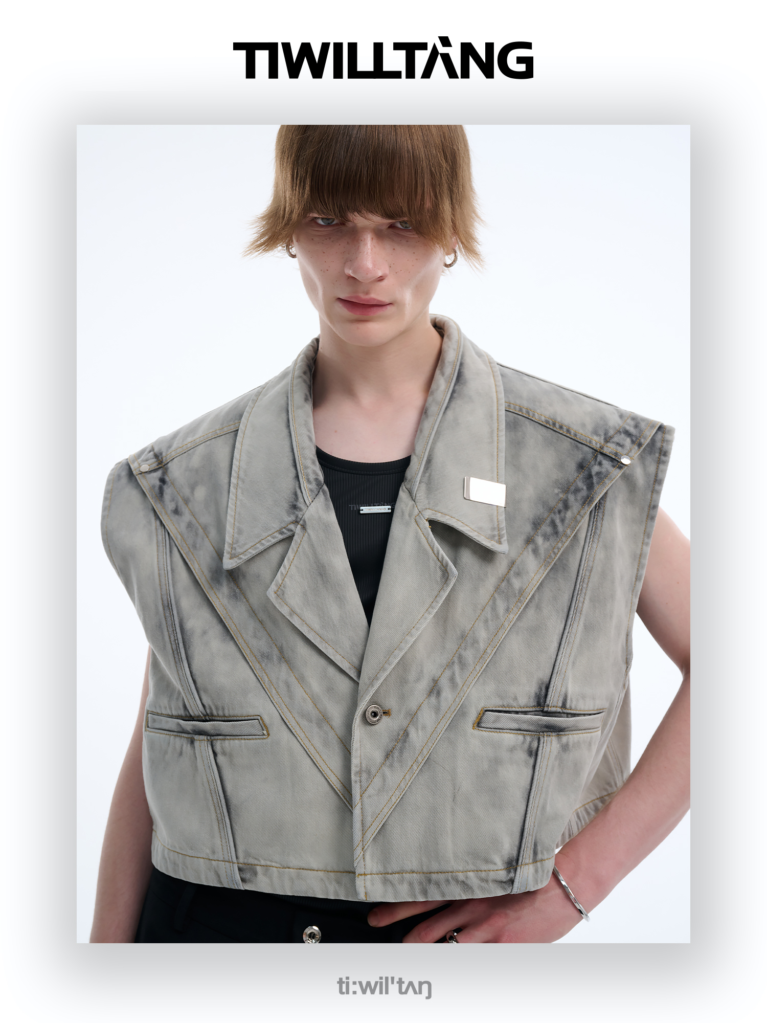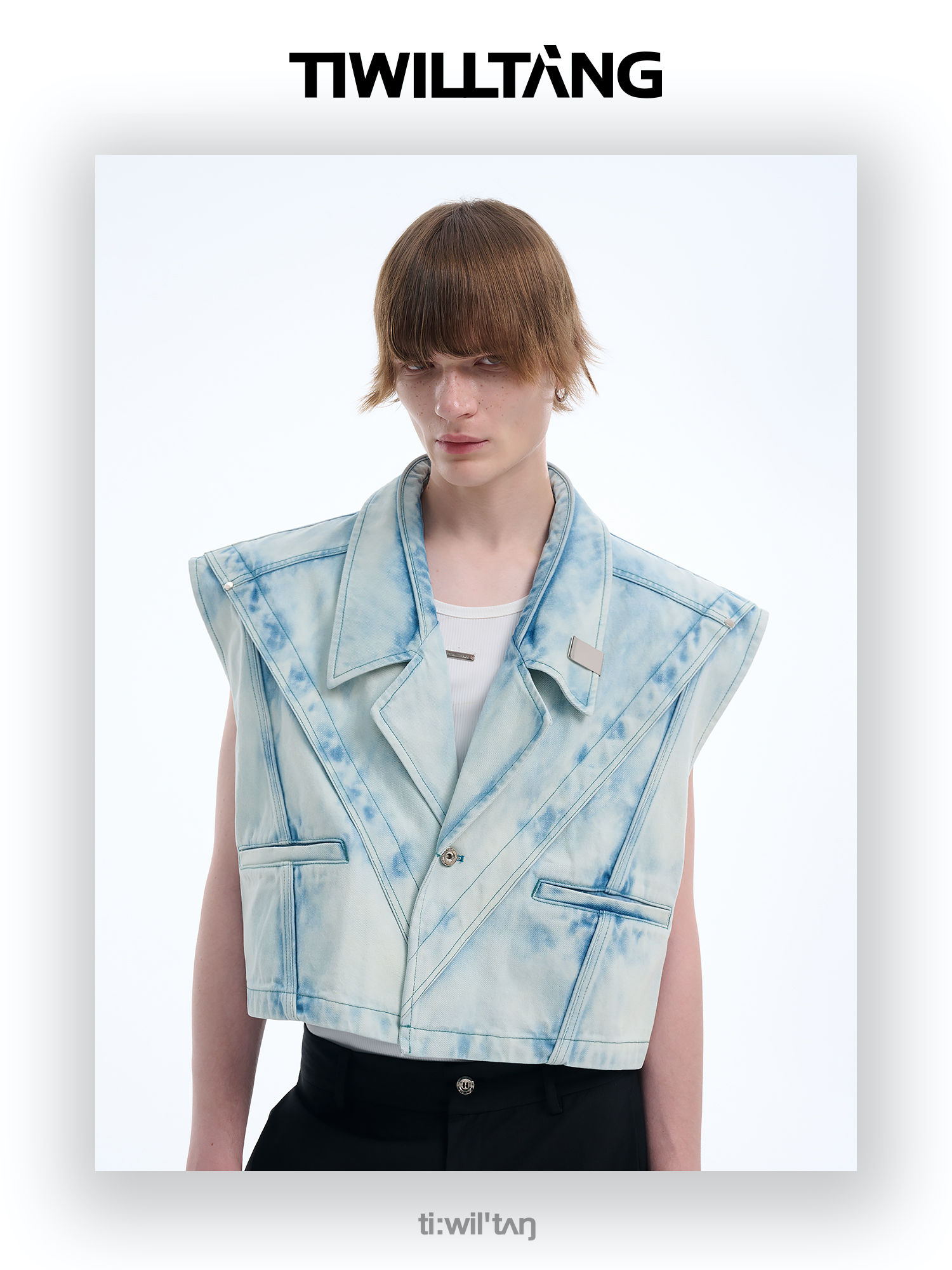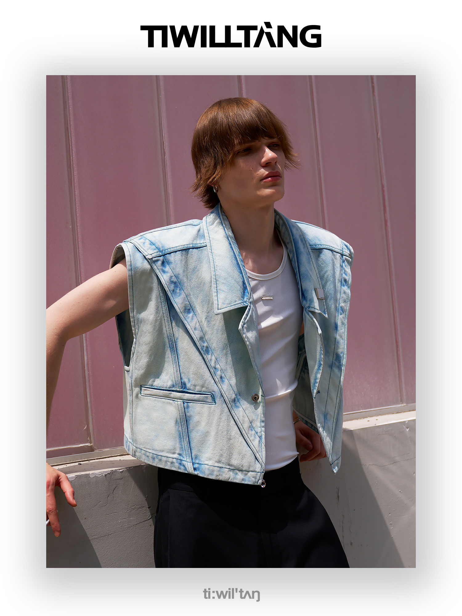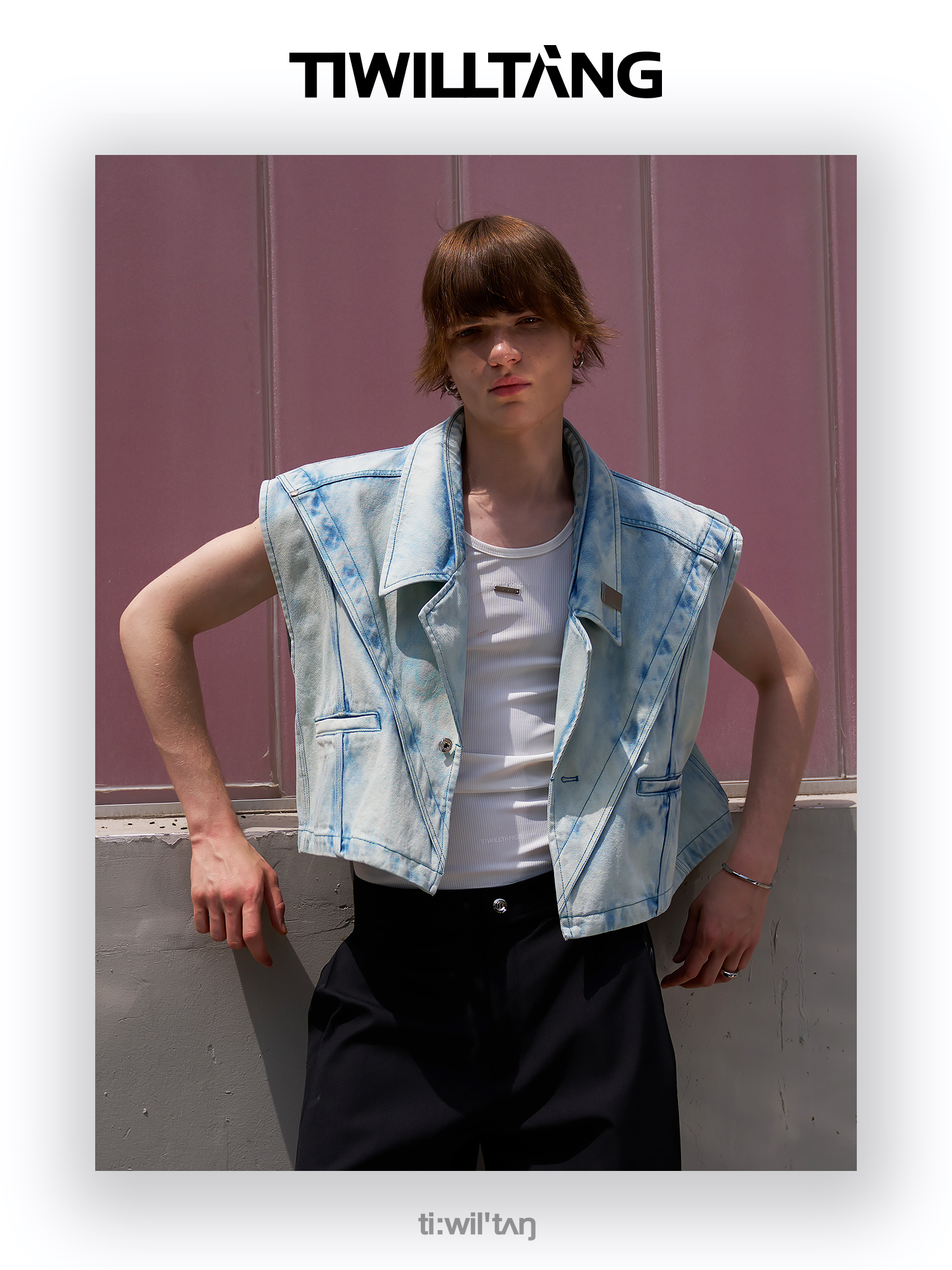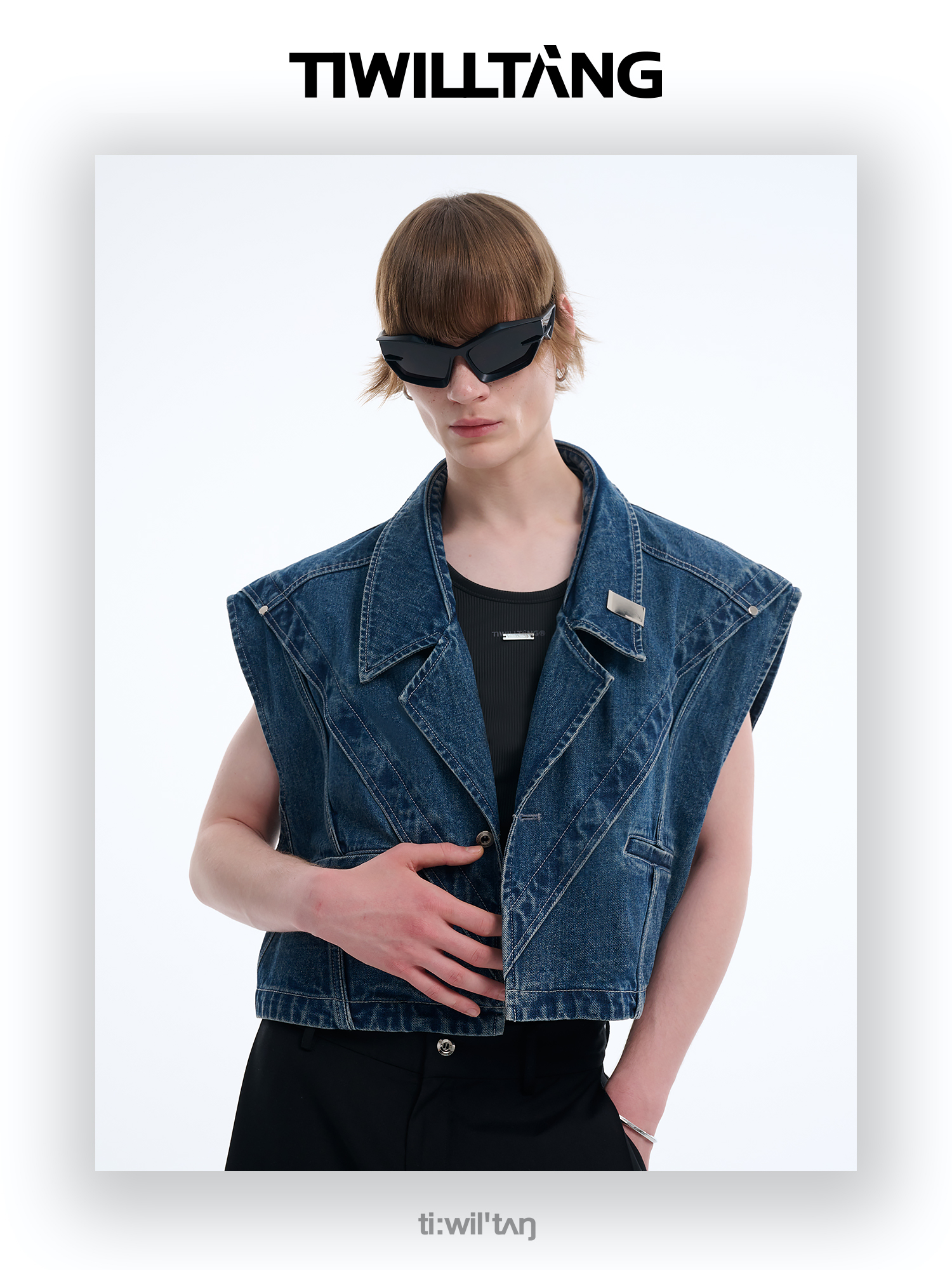 TIWILLTANG 启世录“恬狭”夏季短款设计感翻领水洗牛仔马甲夹克