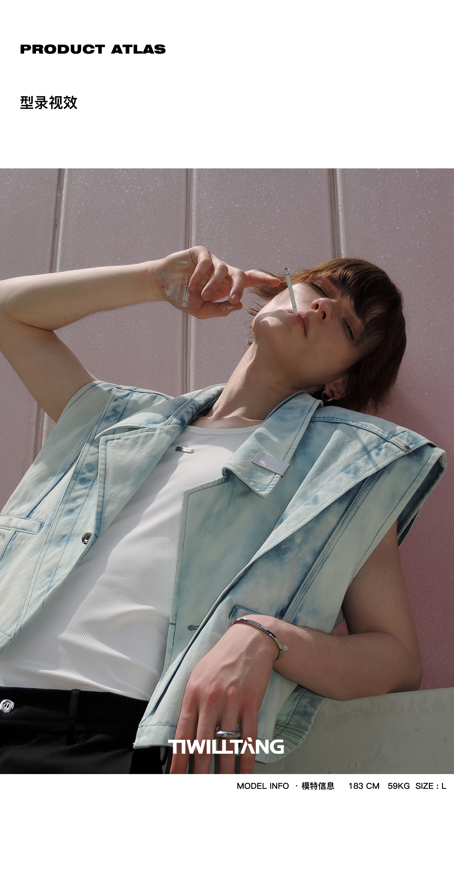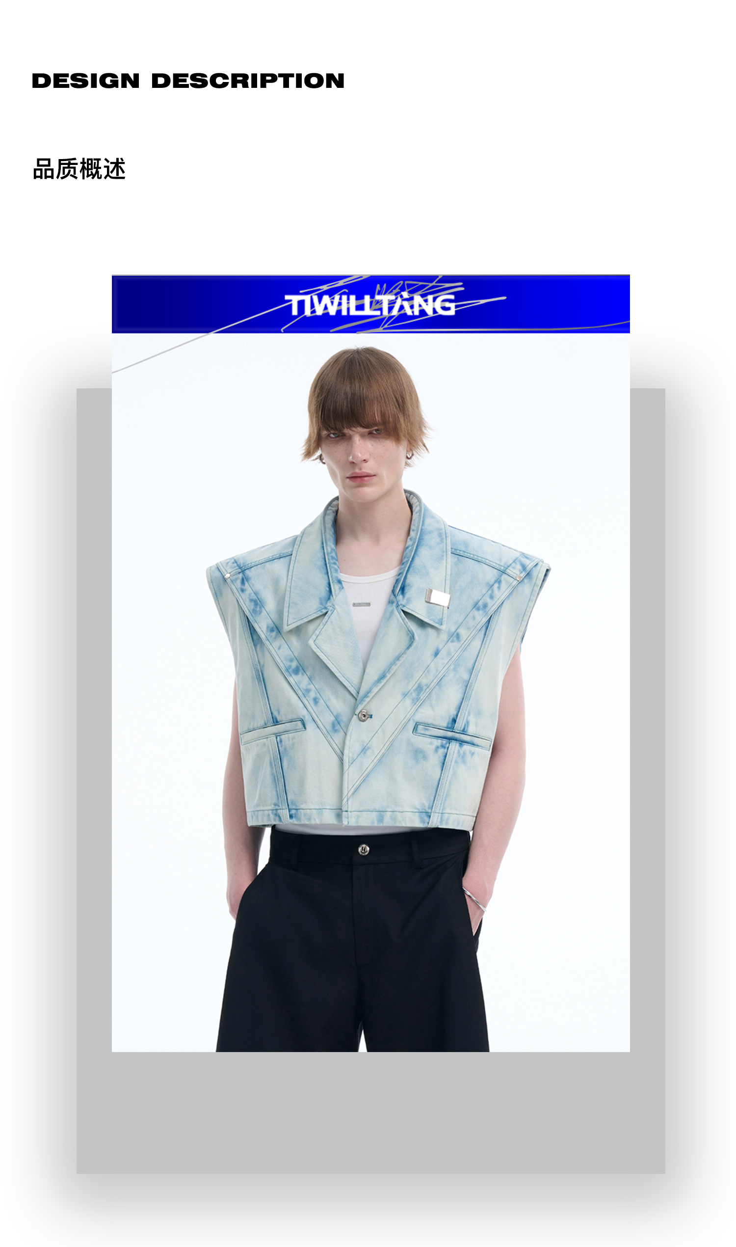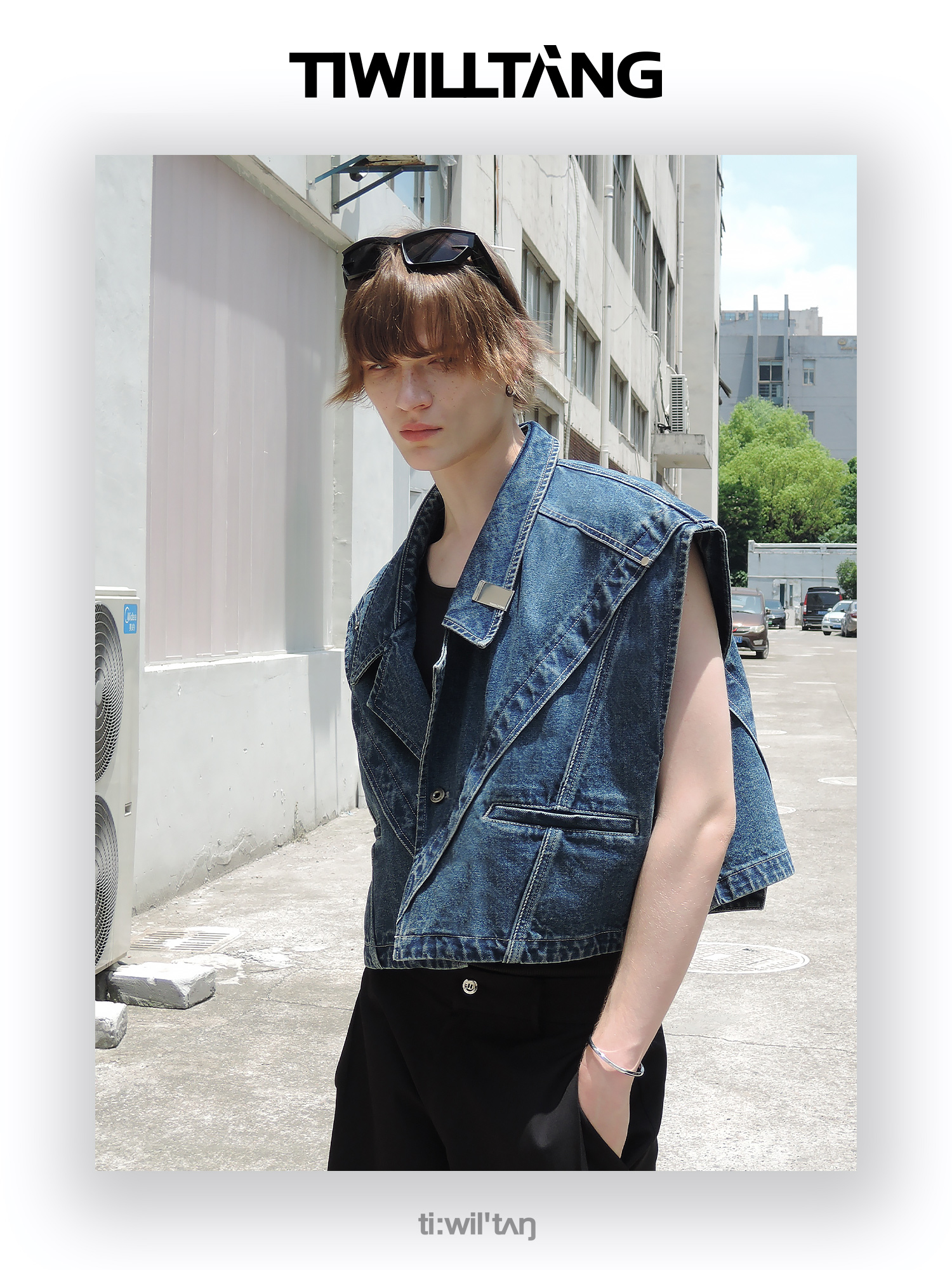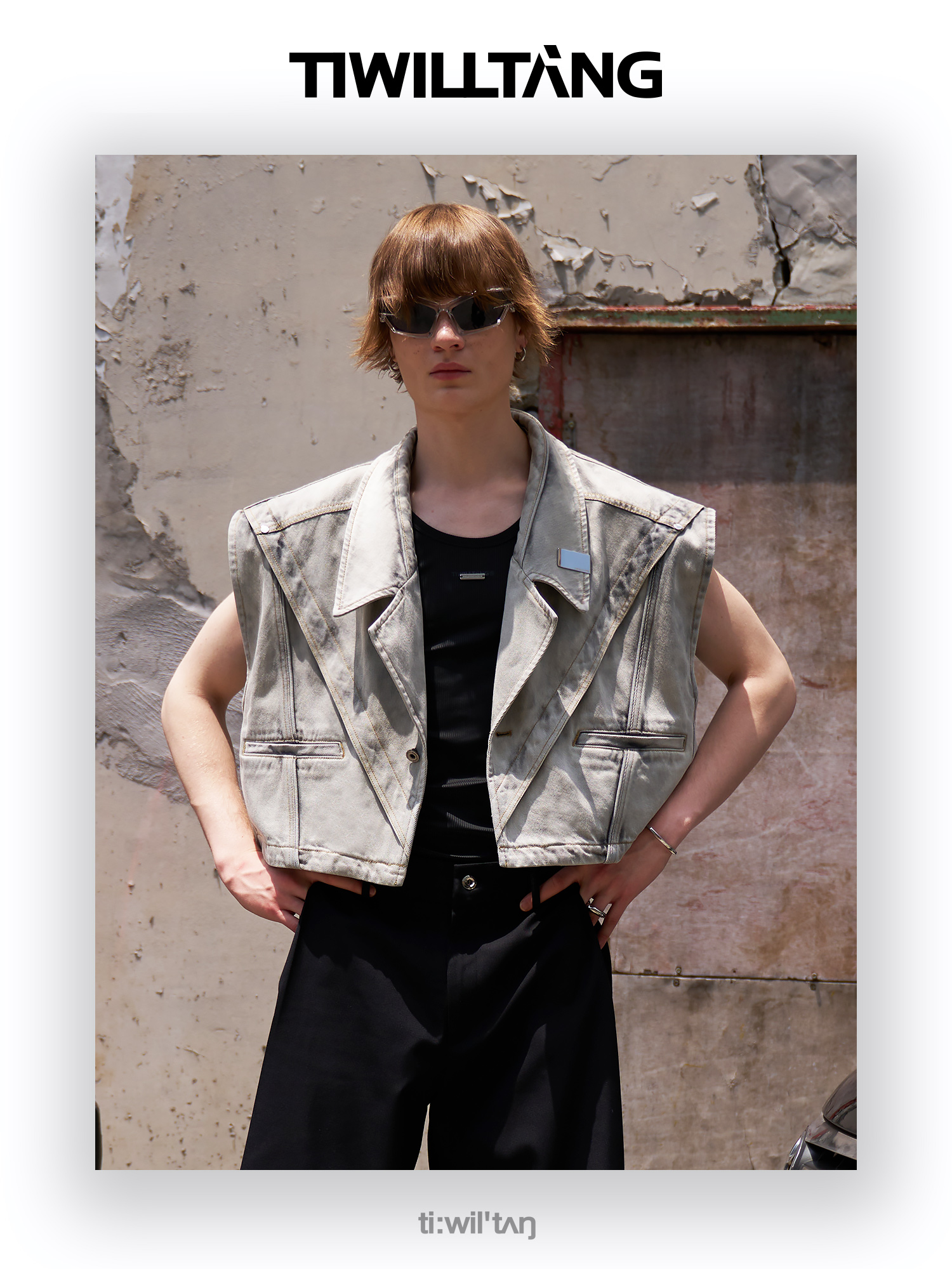 TIWILLTANG 启世录“恬狭”夏季短款设计感翻领水洗牛仔马甲夹克
