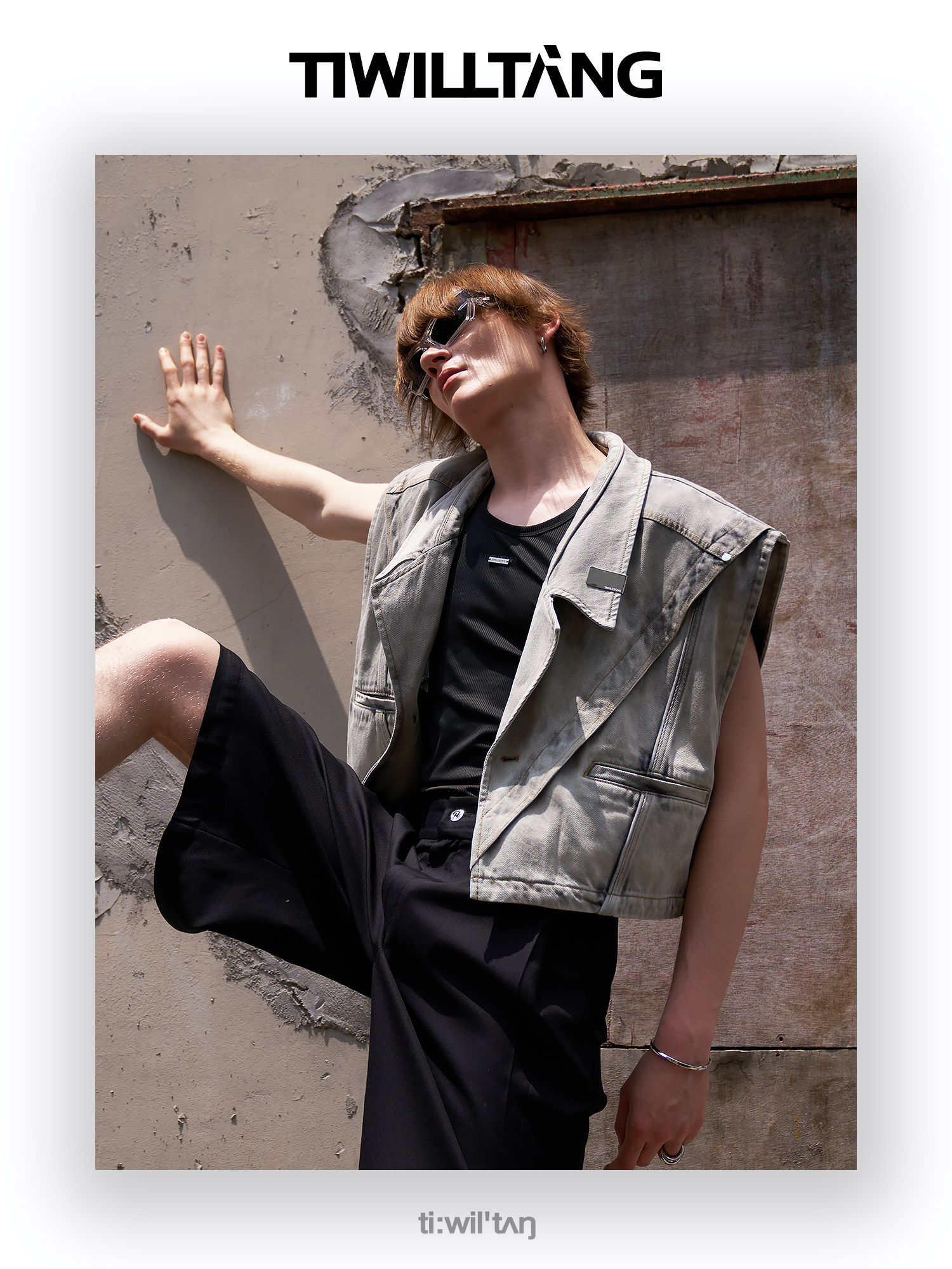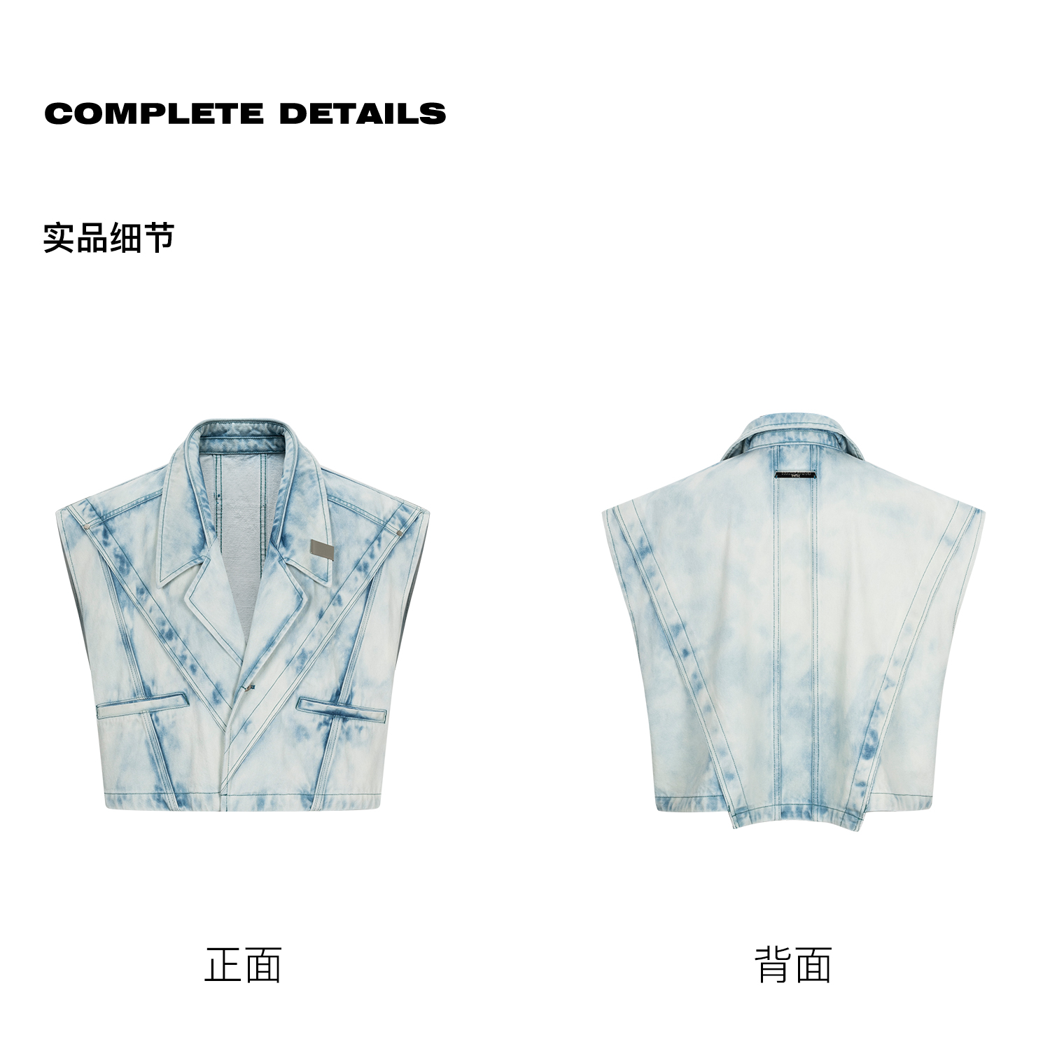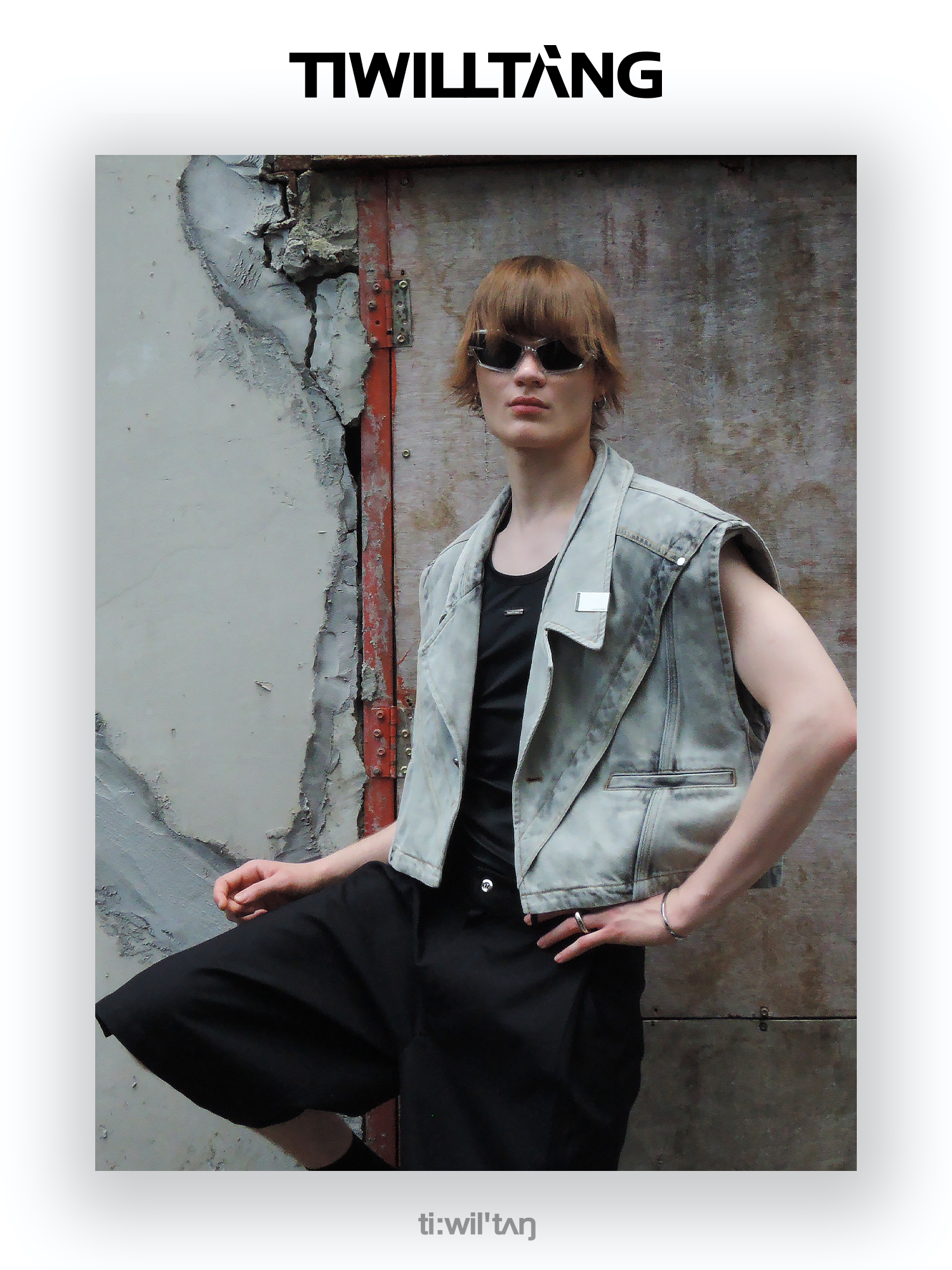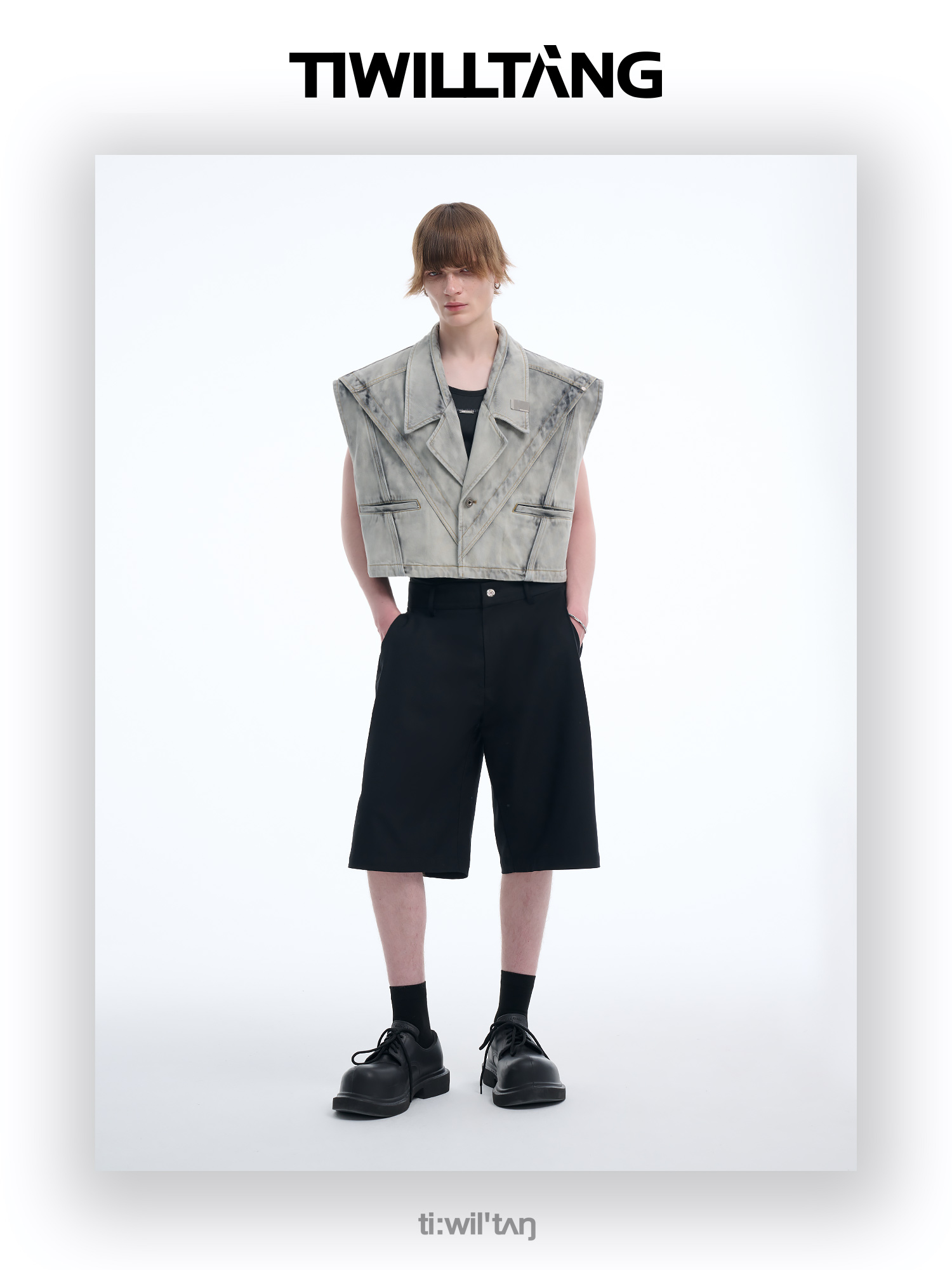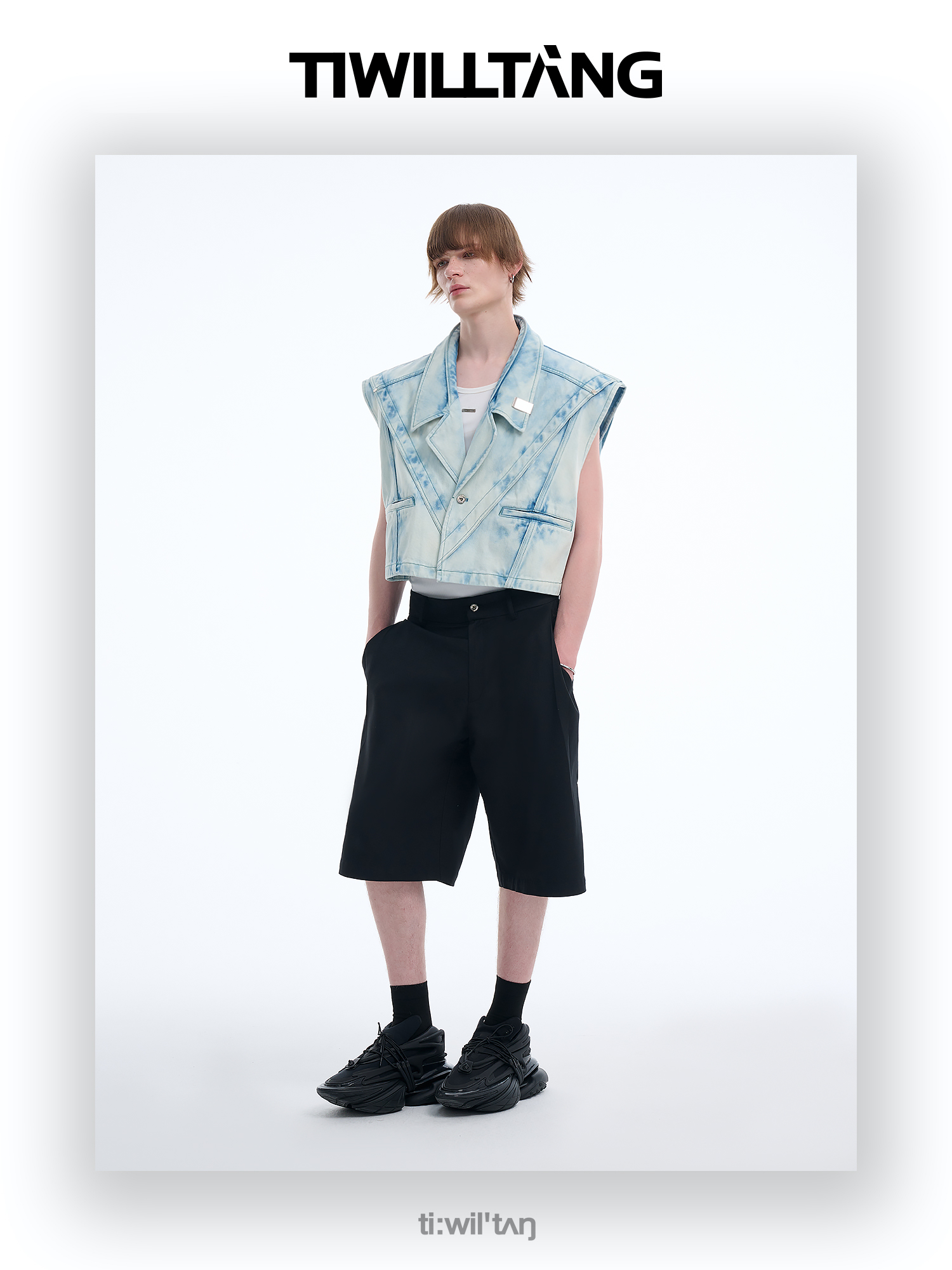 TIWILLTANG 启世录“恬狭”夏季短款设计感翻领水洗牛仔马甲夹克