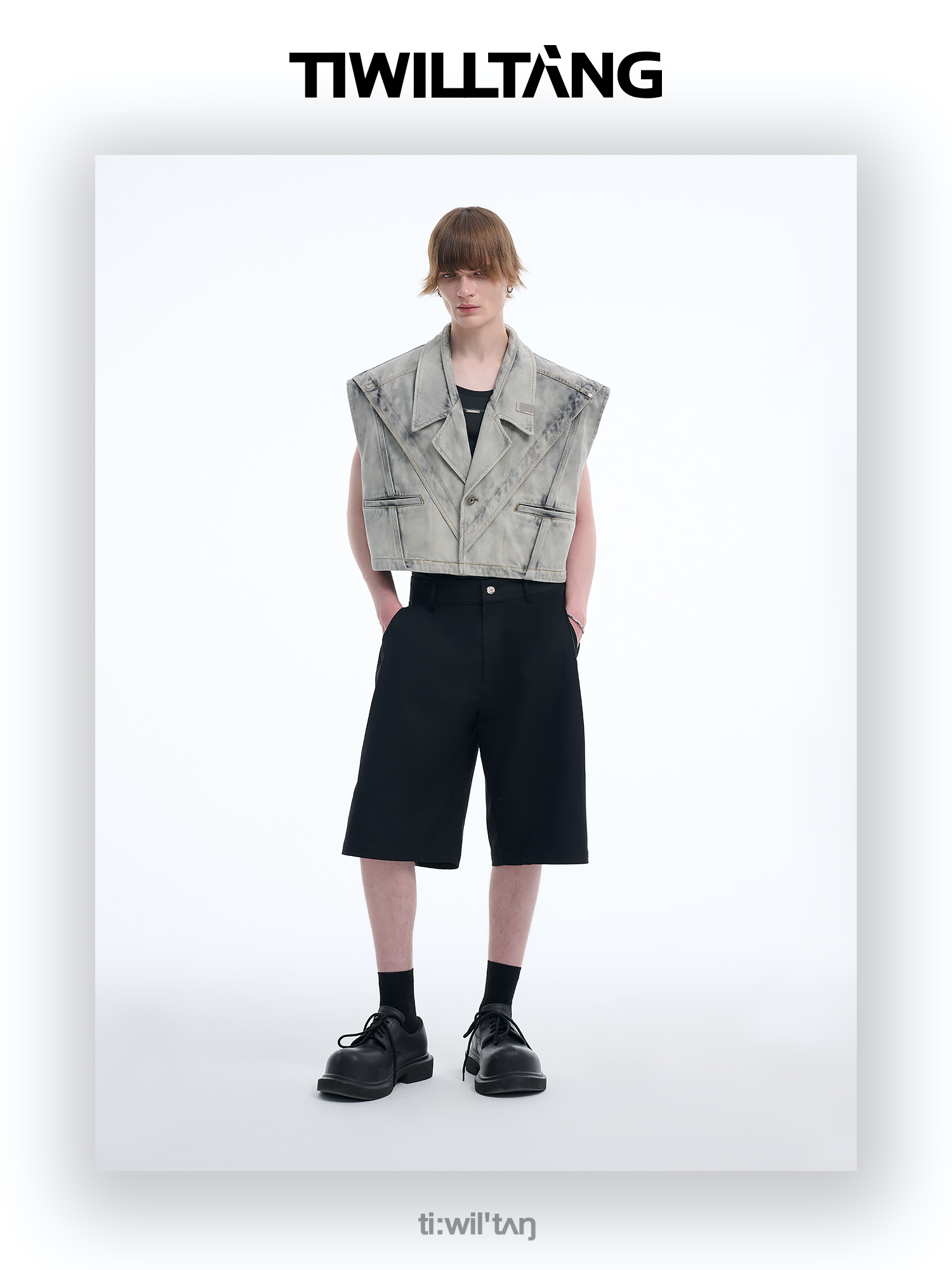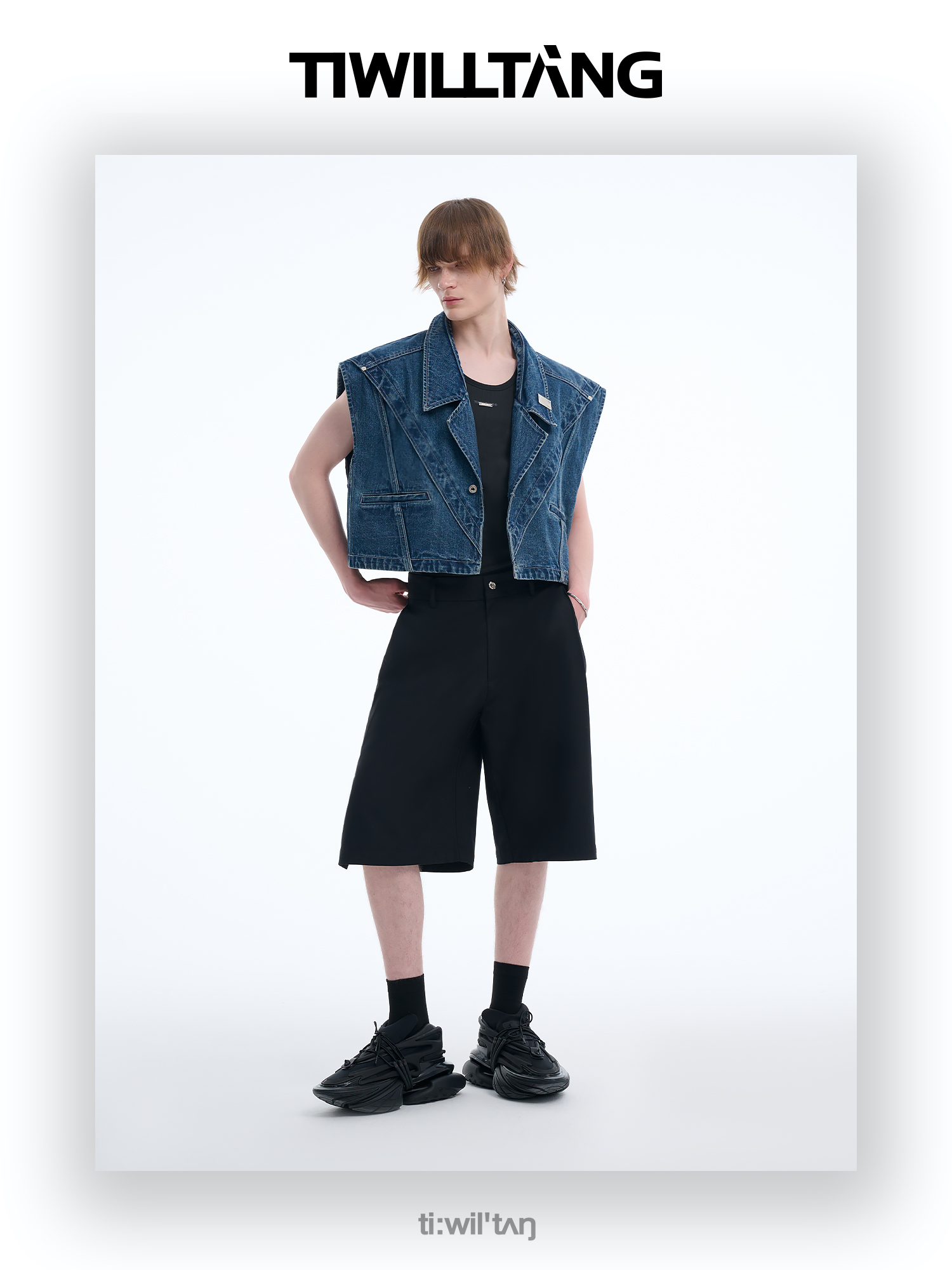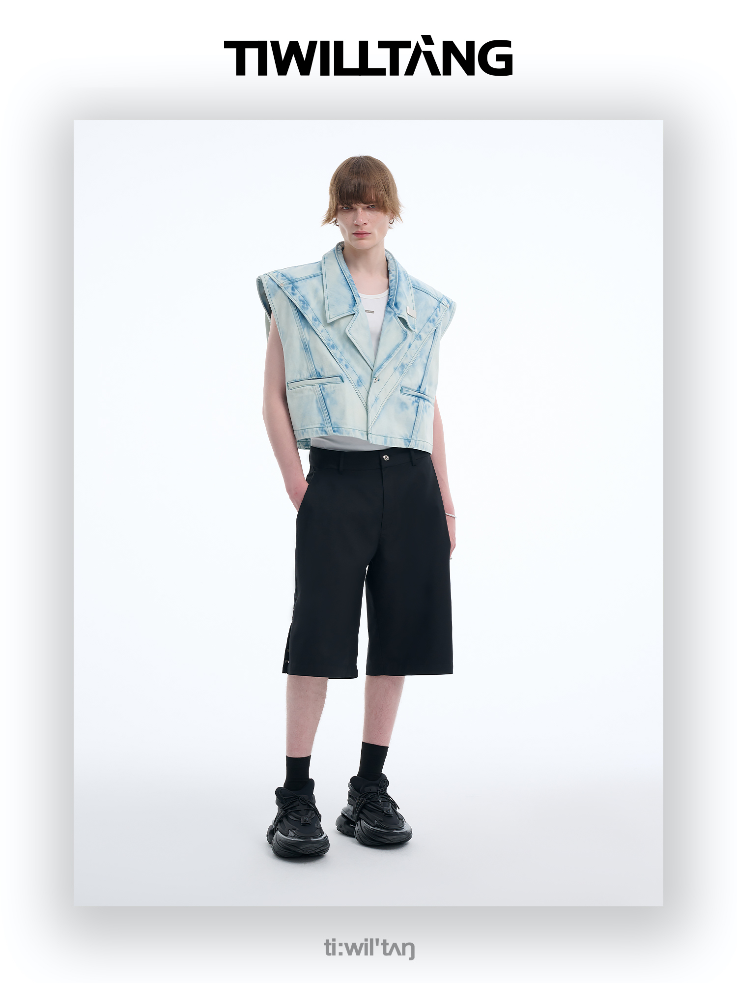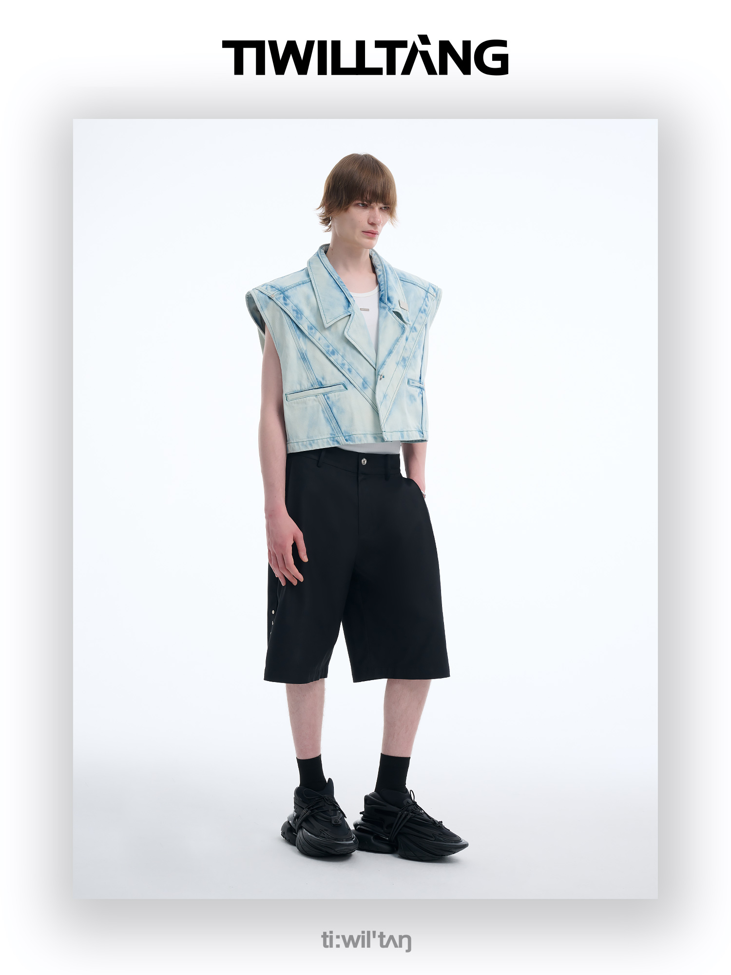 TIWILLTANG 启世录“恬狭”夏季短款设计感翻领水洗牛仔马甲夹克