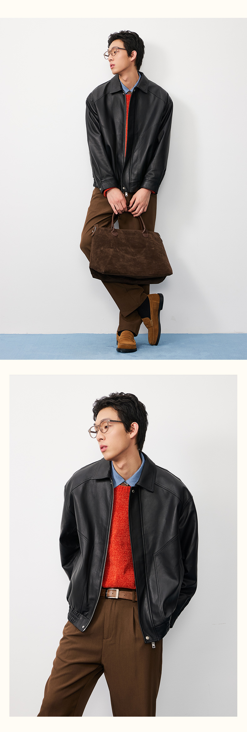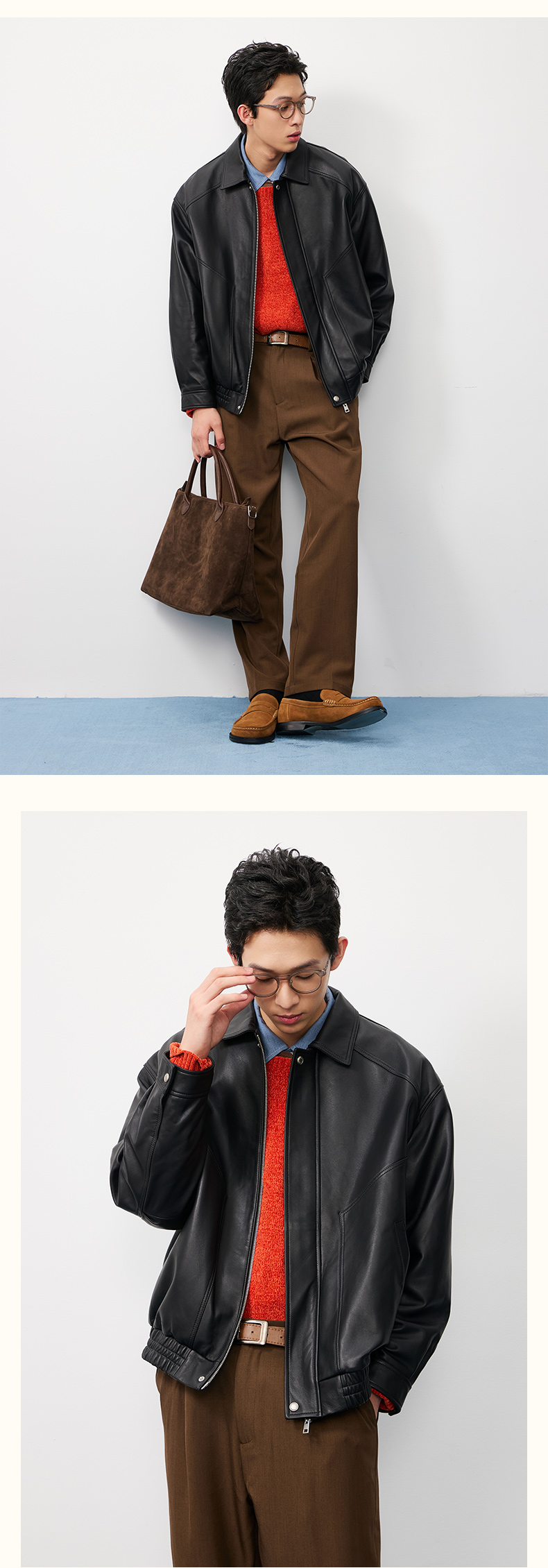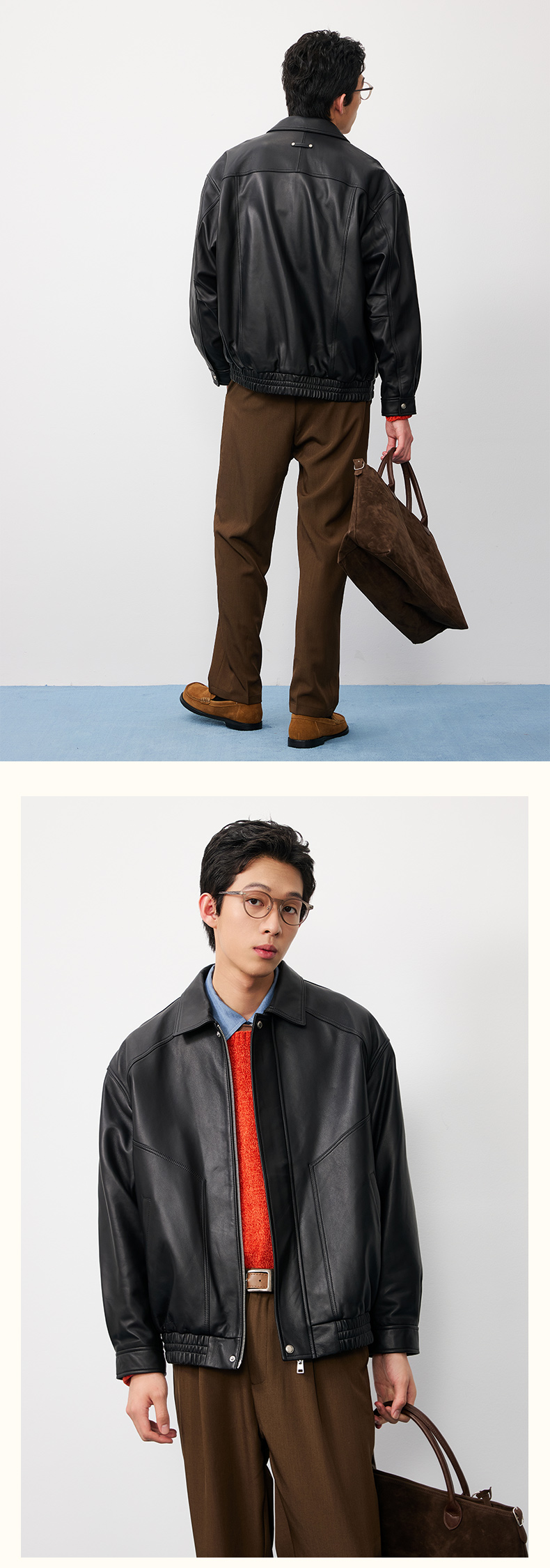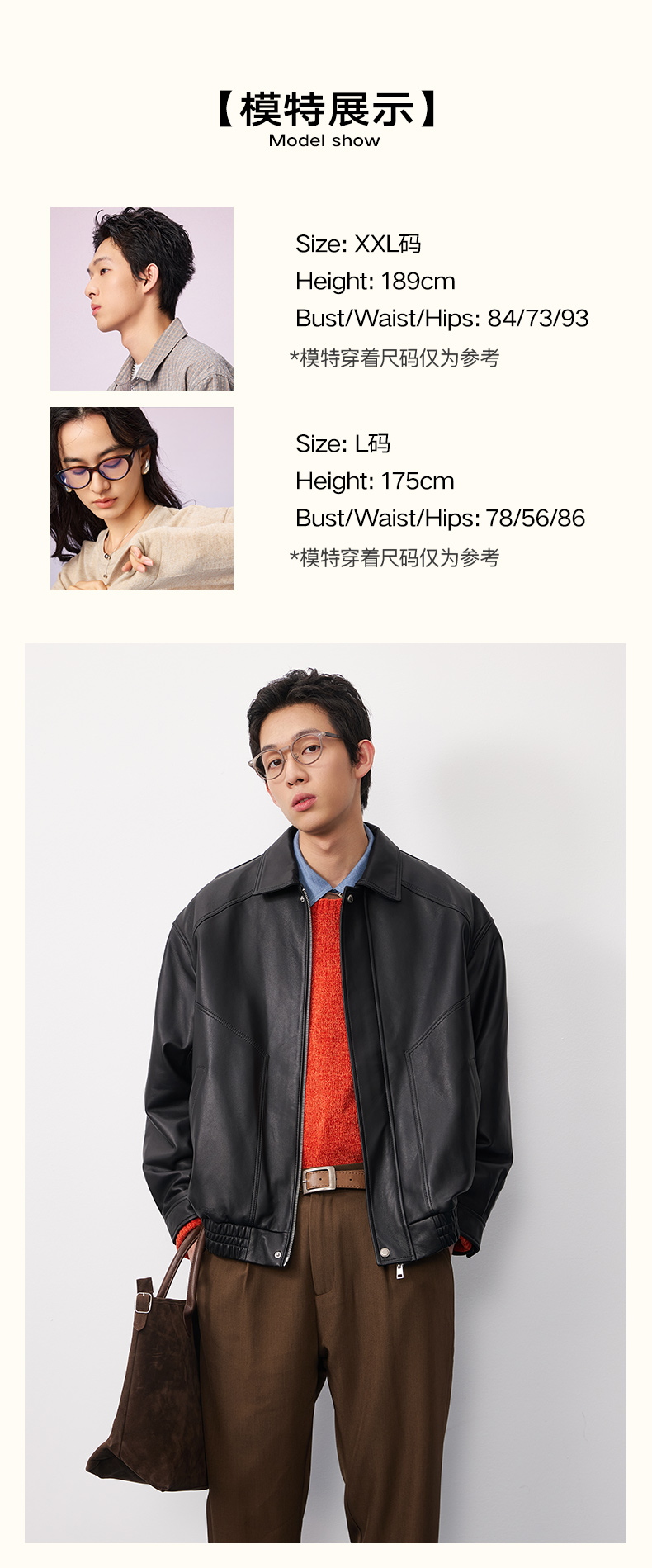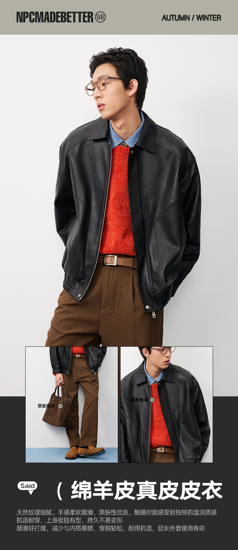 NPC潮牌复古老钱100%【绵羊皮革】翻领夹克男黑色短款秋NP57TJ38