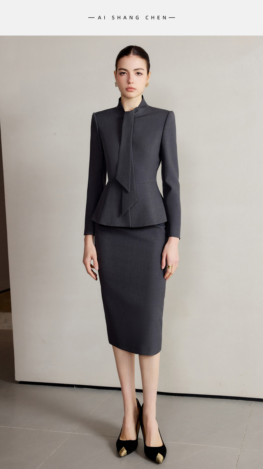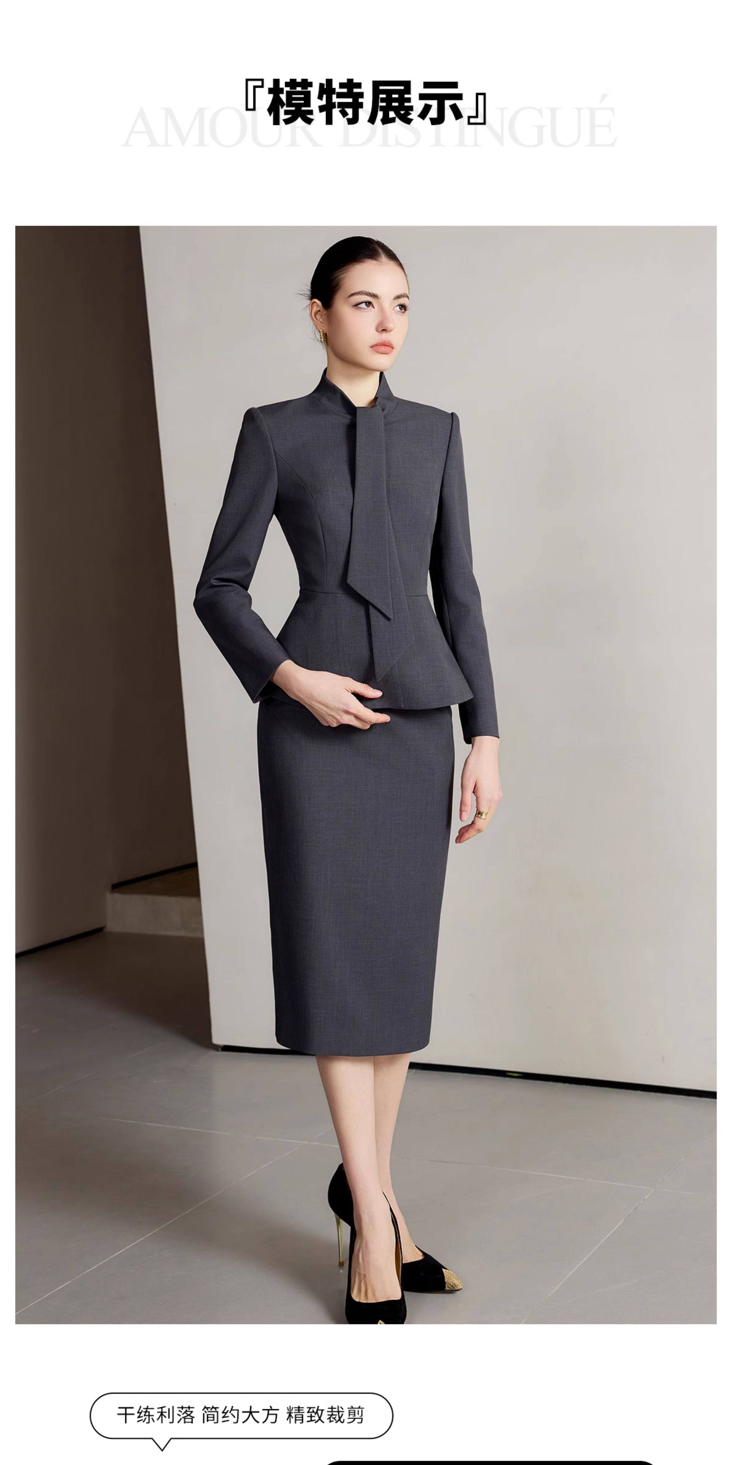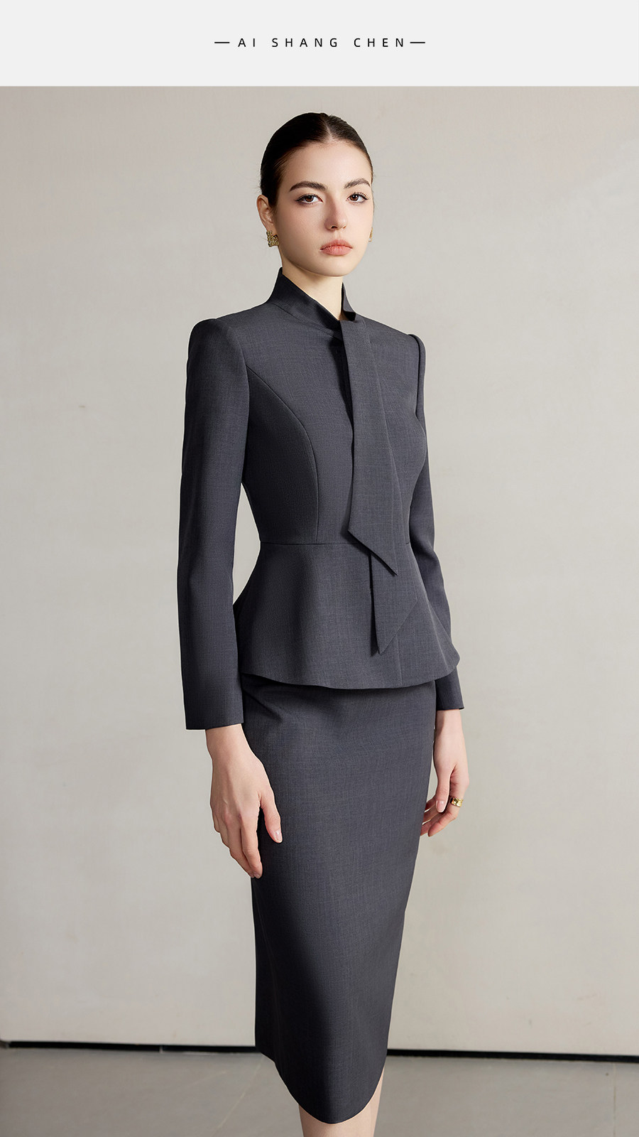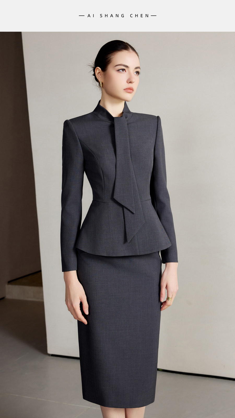 艾尚臣设计感围巾领西装套装女高级灰色西服两件套法式摩登穿搭冬