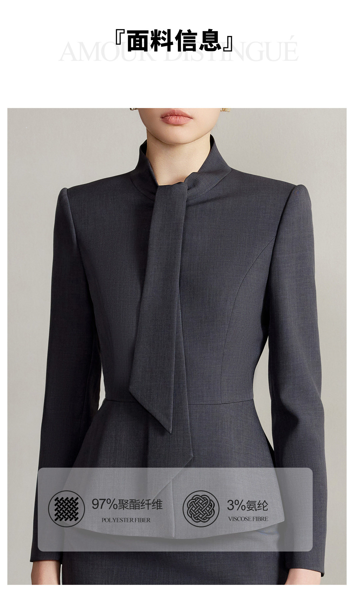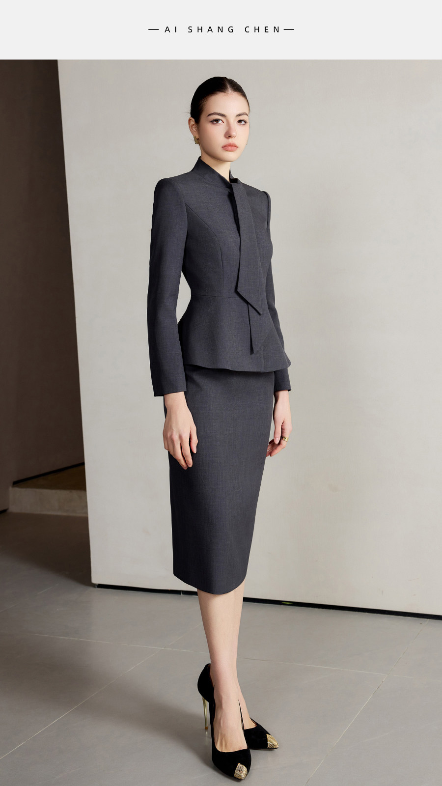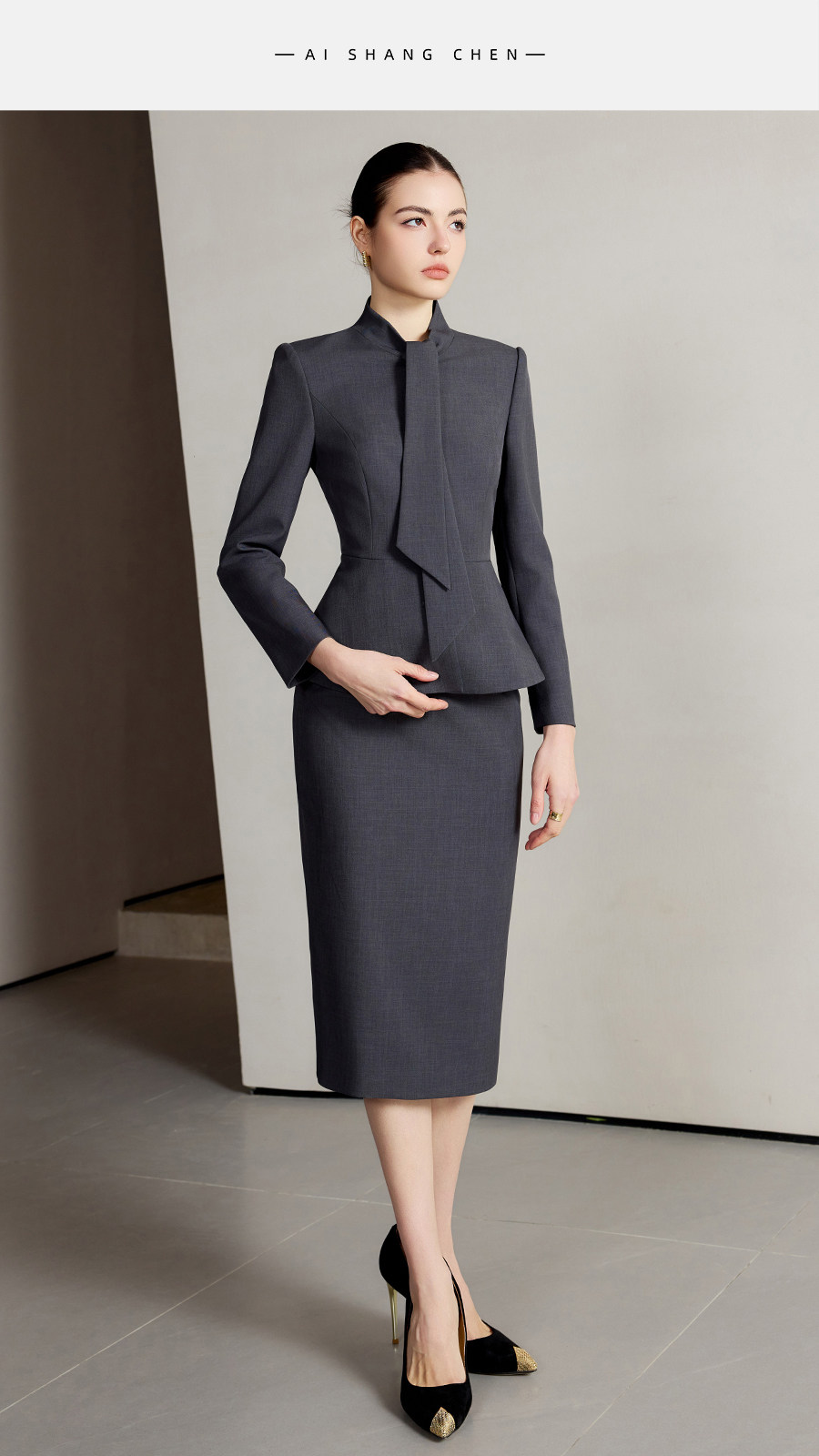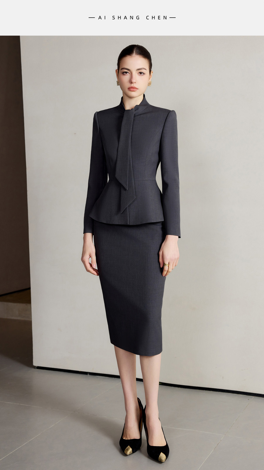 艾尚臣设计感围巾领西装套装女高级灰色西服两件套法式摩登穿搭冬