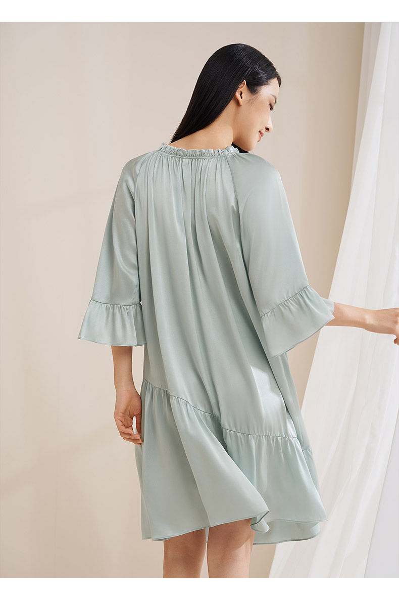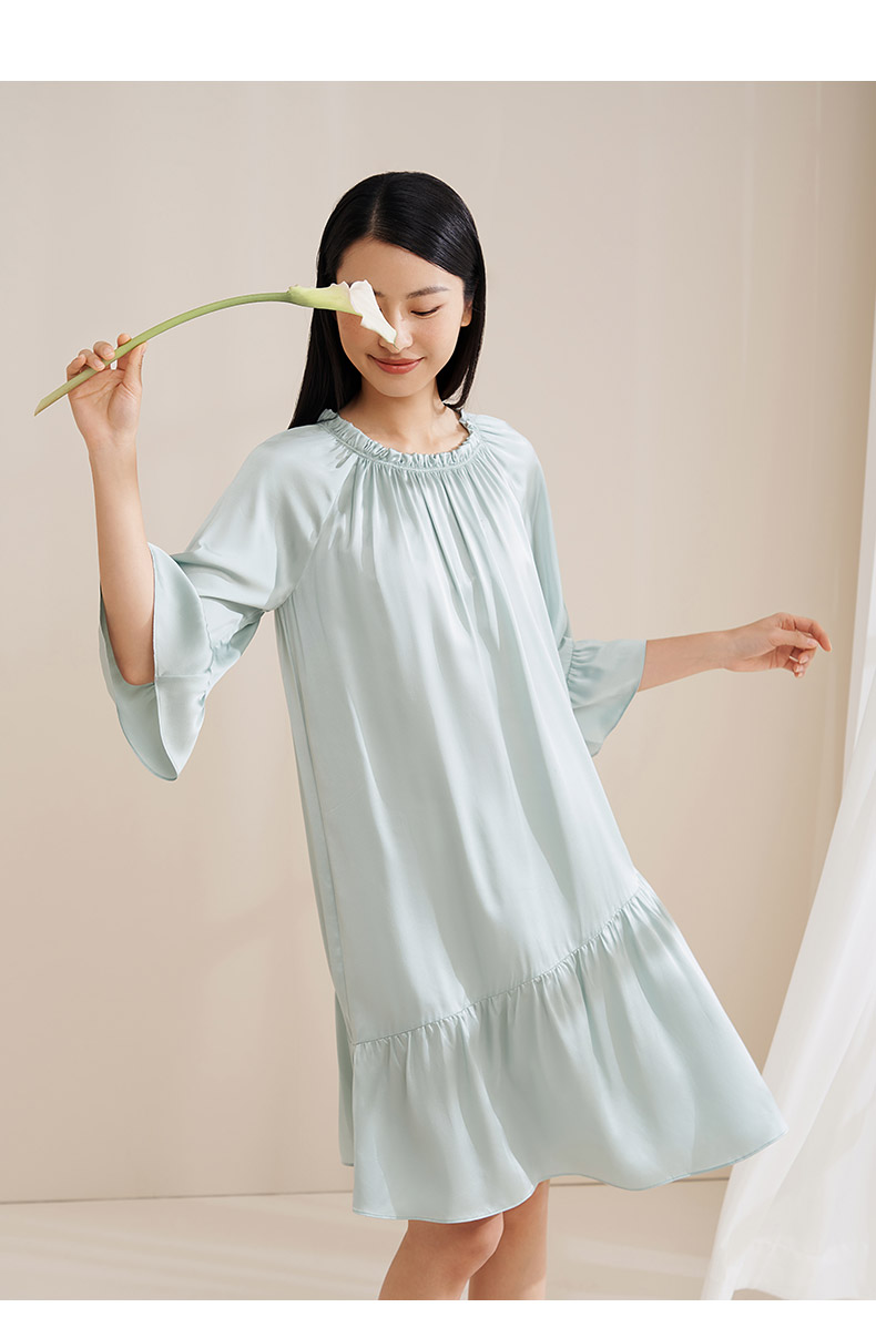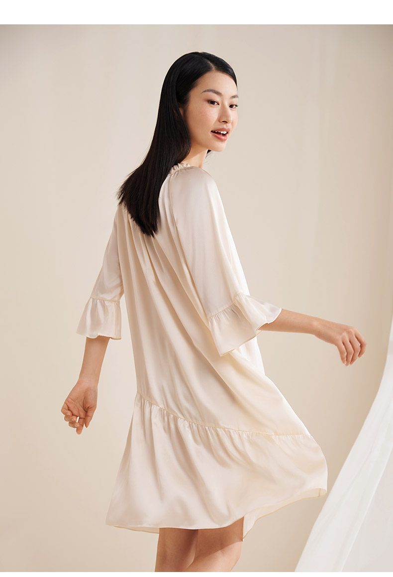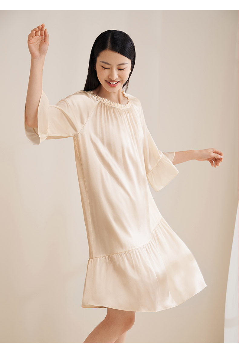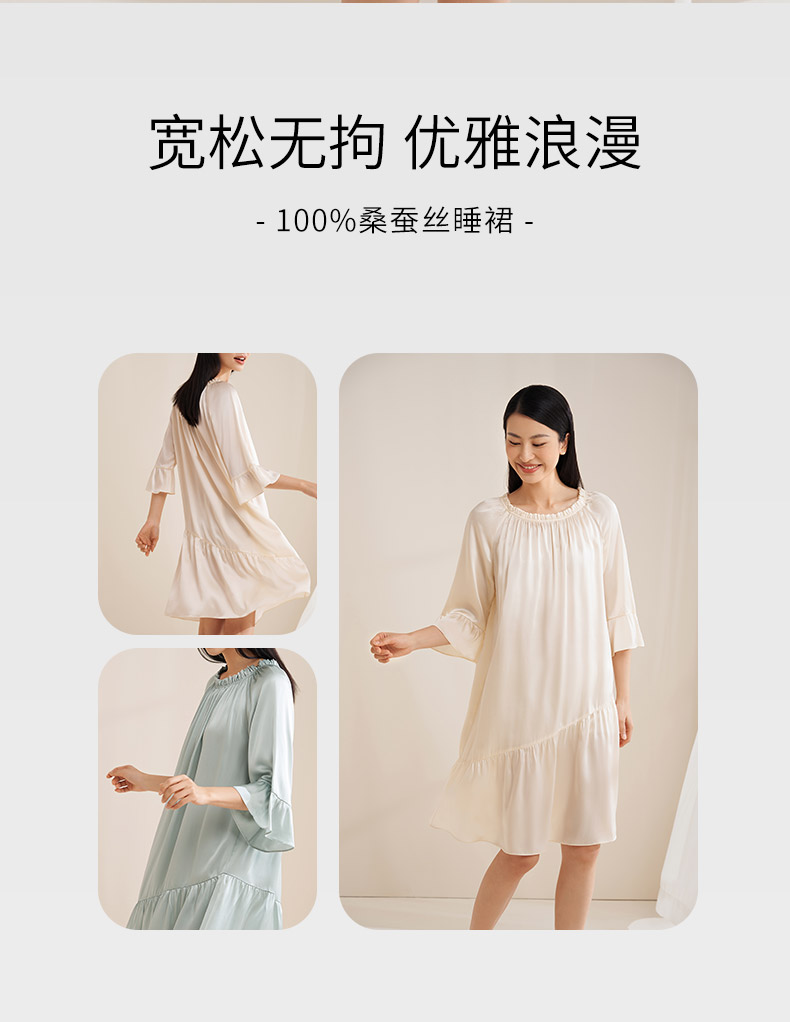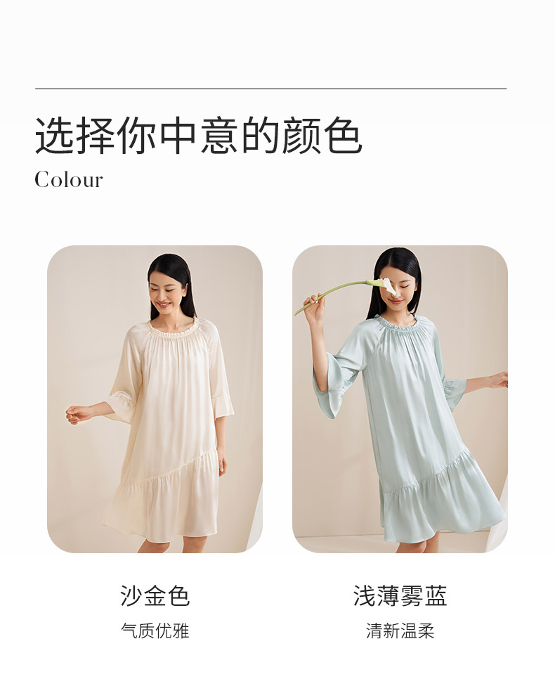 【圆领/一字肩】金三塔真丝睡裙女100%桑蚕丝优雅荷叶边睡衣家居服 YSFEA311