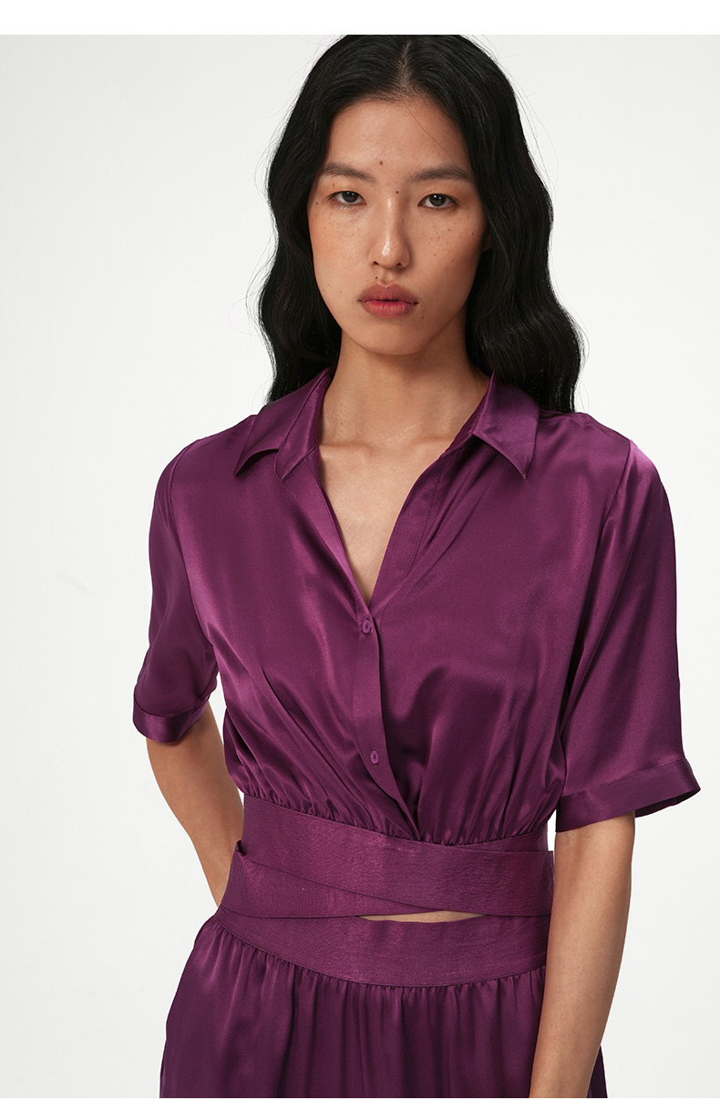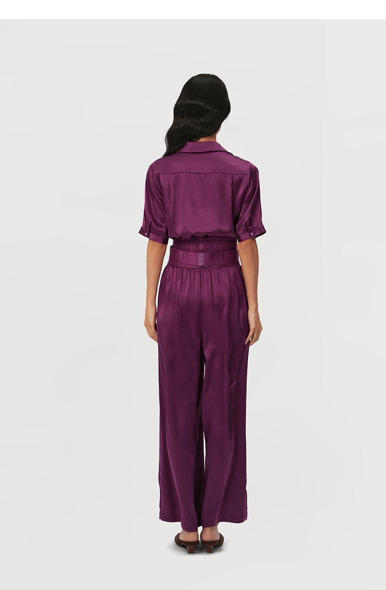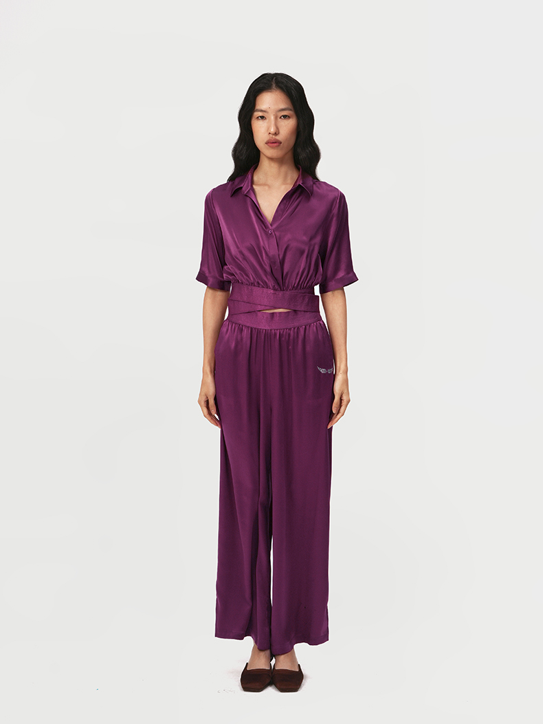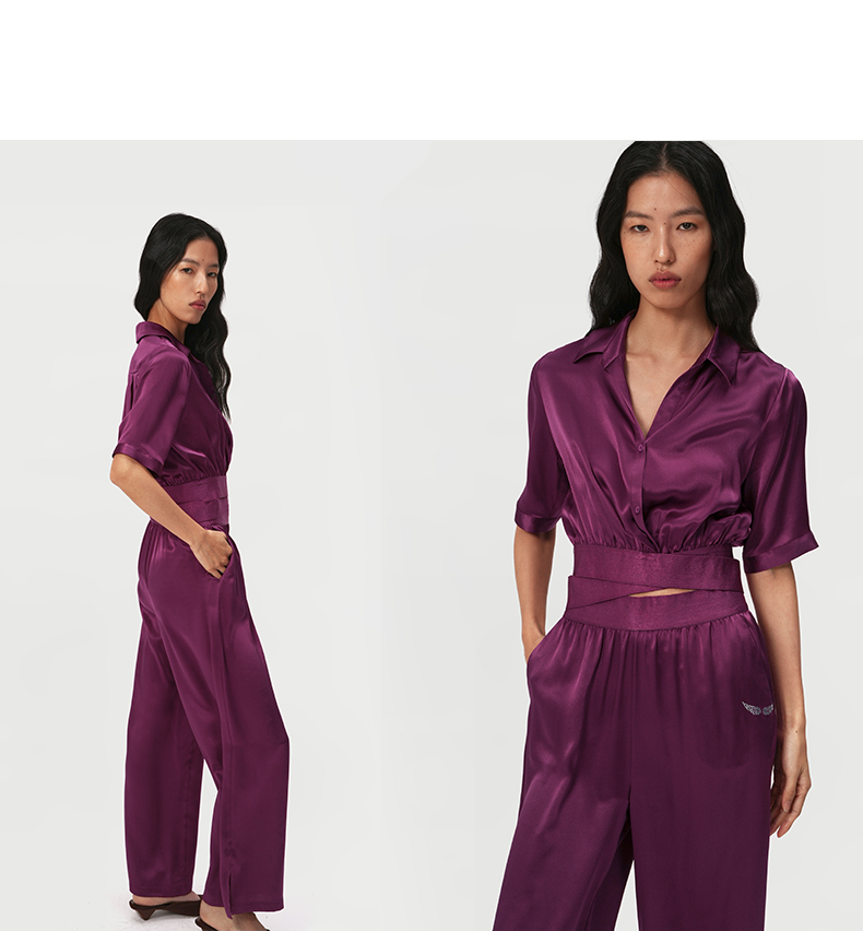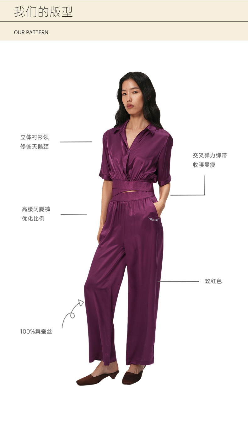 桑罗玫红真丝衬衫套装100%桑蚕丝女款修身家居服可外穿