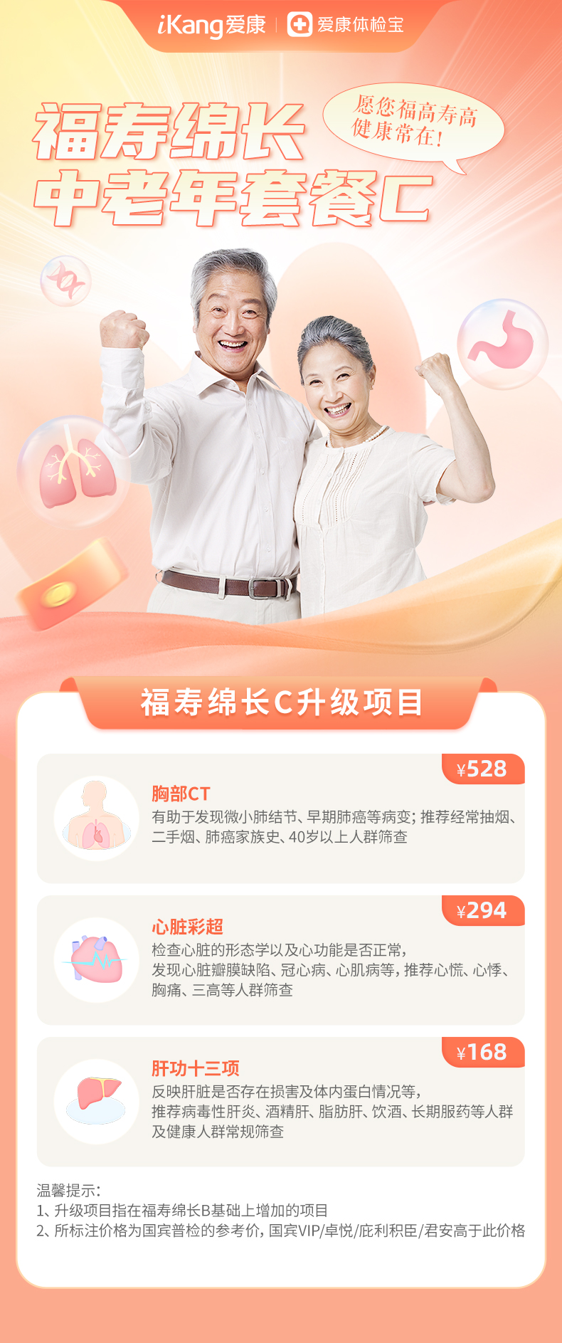 【升级胸部CT、心脏彩超、肝功十三项】爱康卓悦 福寿绵长2024中老年套餐C
