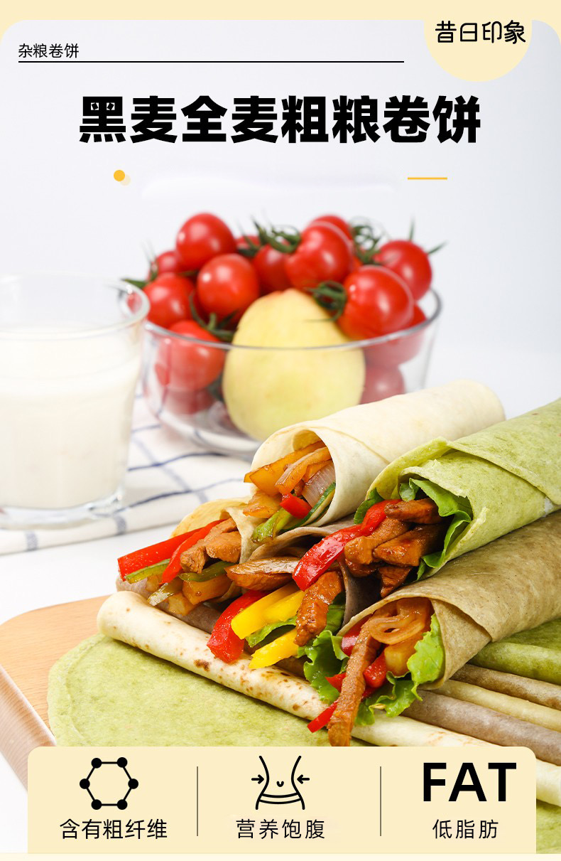 昔日印象的卷饼,有黑全麦、全麦、荞麦、菠菜四个口味可选,不添加白面粉,配料表干净,只有粗粮和饮用水,其它,就没有了,真的太适合减脂人了!而且口感非常可以,是很有劲道的美味碳水,不会松松垮垮,很弹很韧!