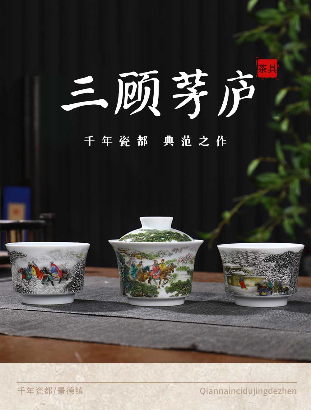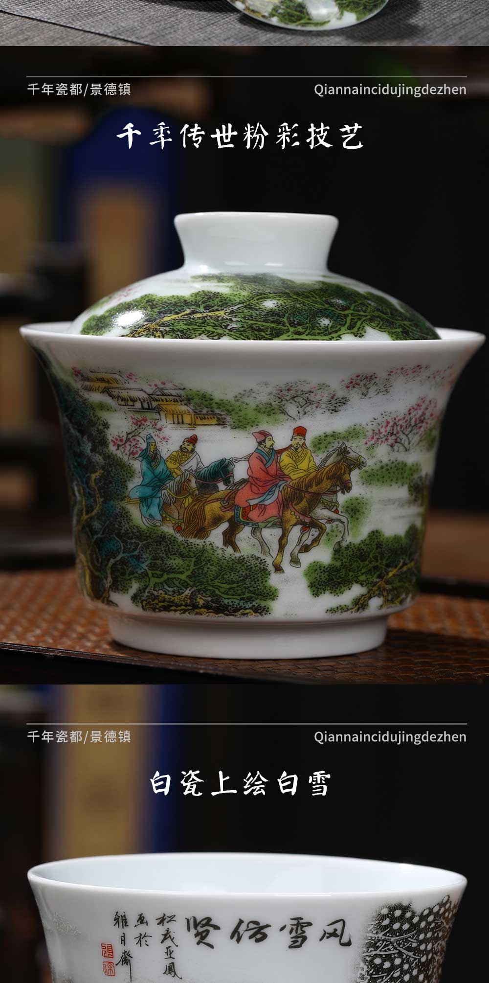 《三顾茅庐》雪景粉彩茶具套组 陶瓷泰斗张松茂大师创作 景德镇出品盖碗主人杯