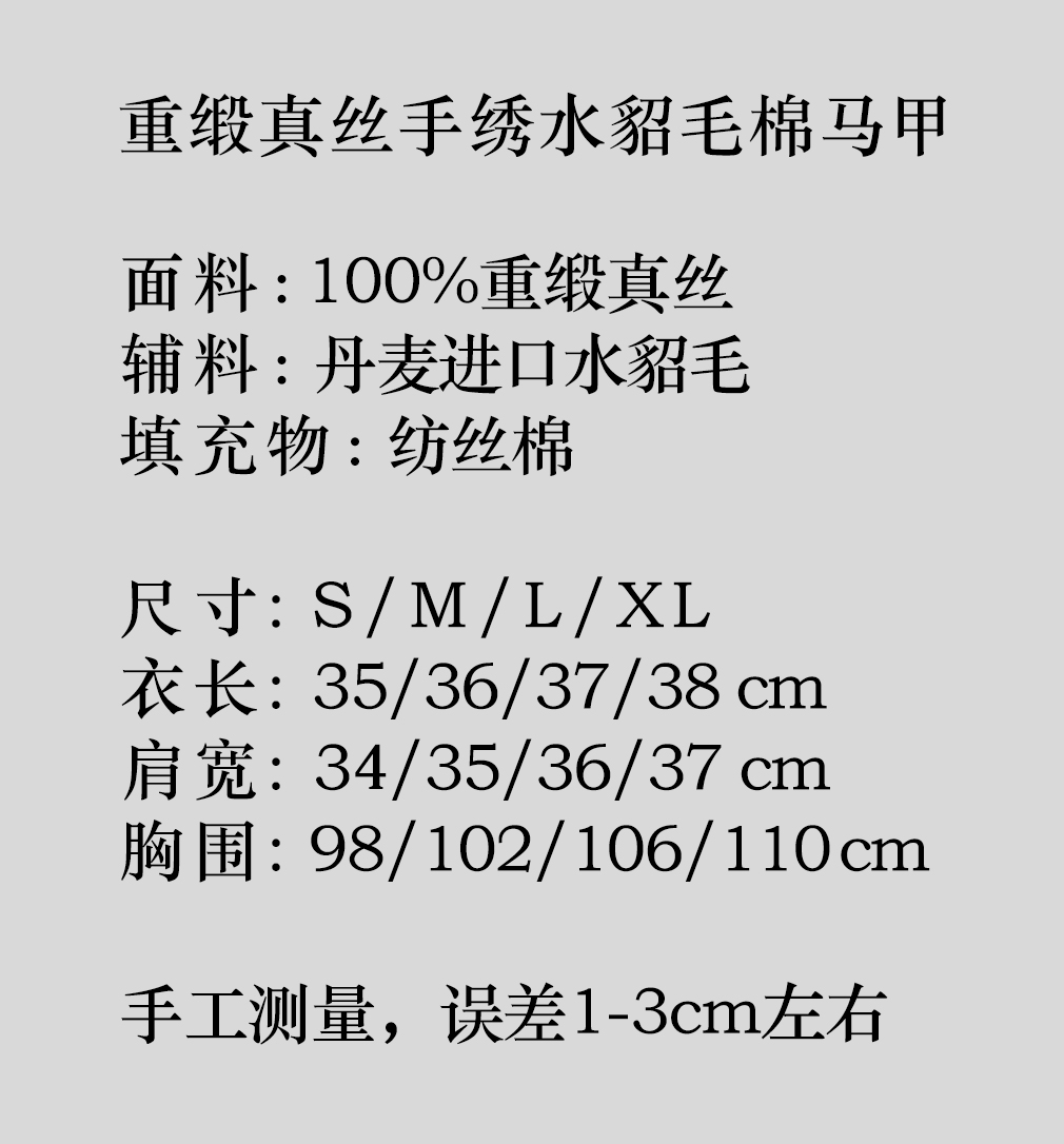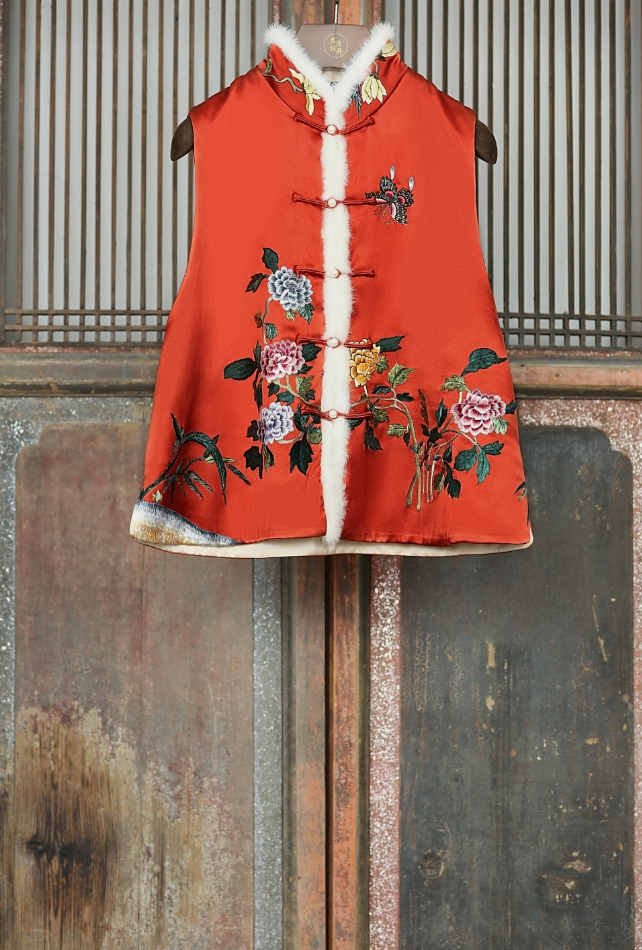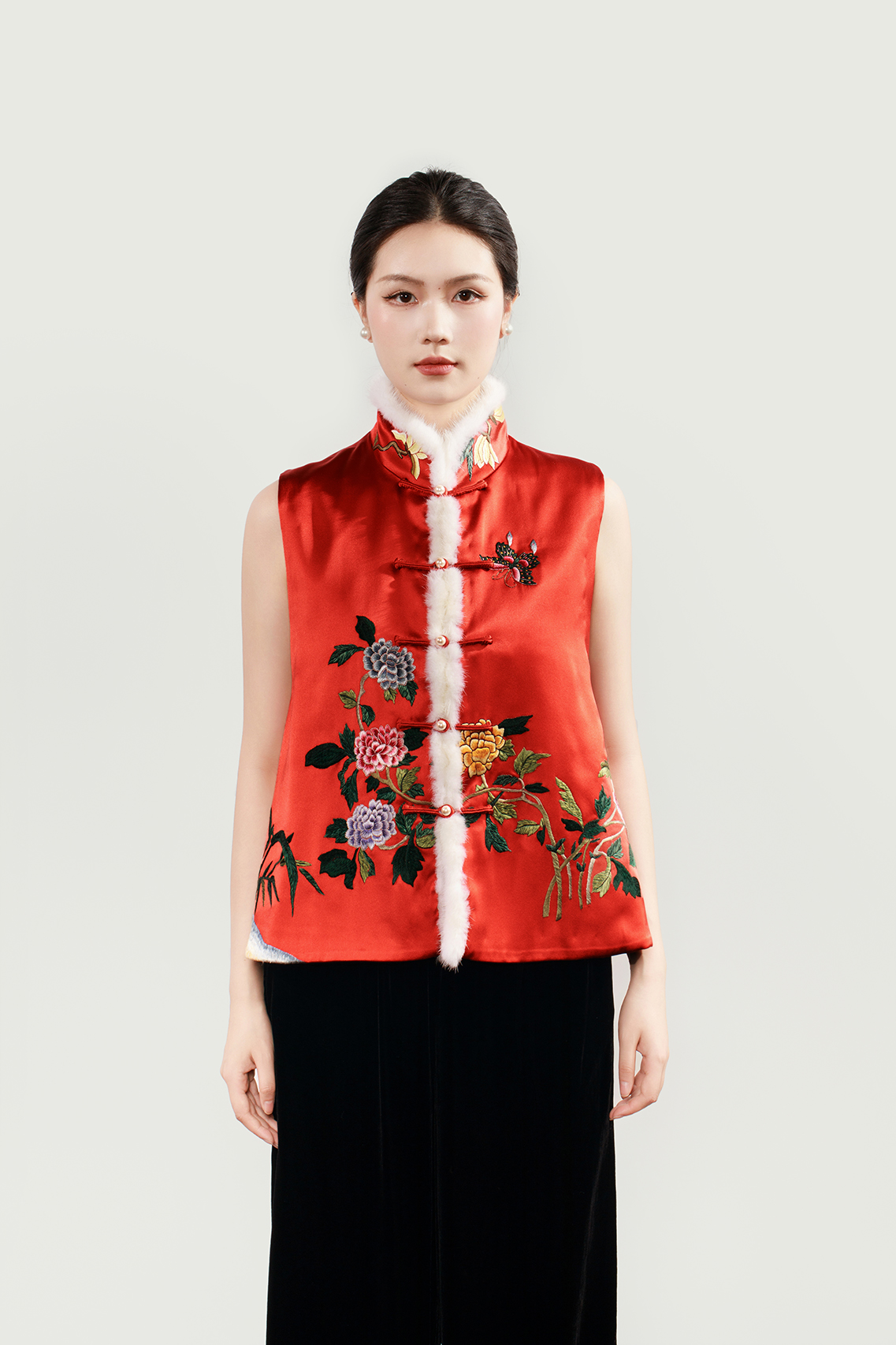 盛唐牡丹大师系列 | 重缎真丝手绣水貂毛棉马甲 (盛唐牡丹与非遗传承人王小潇联名系列)