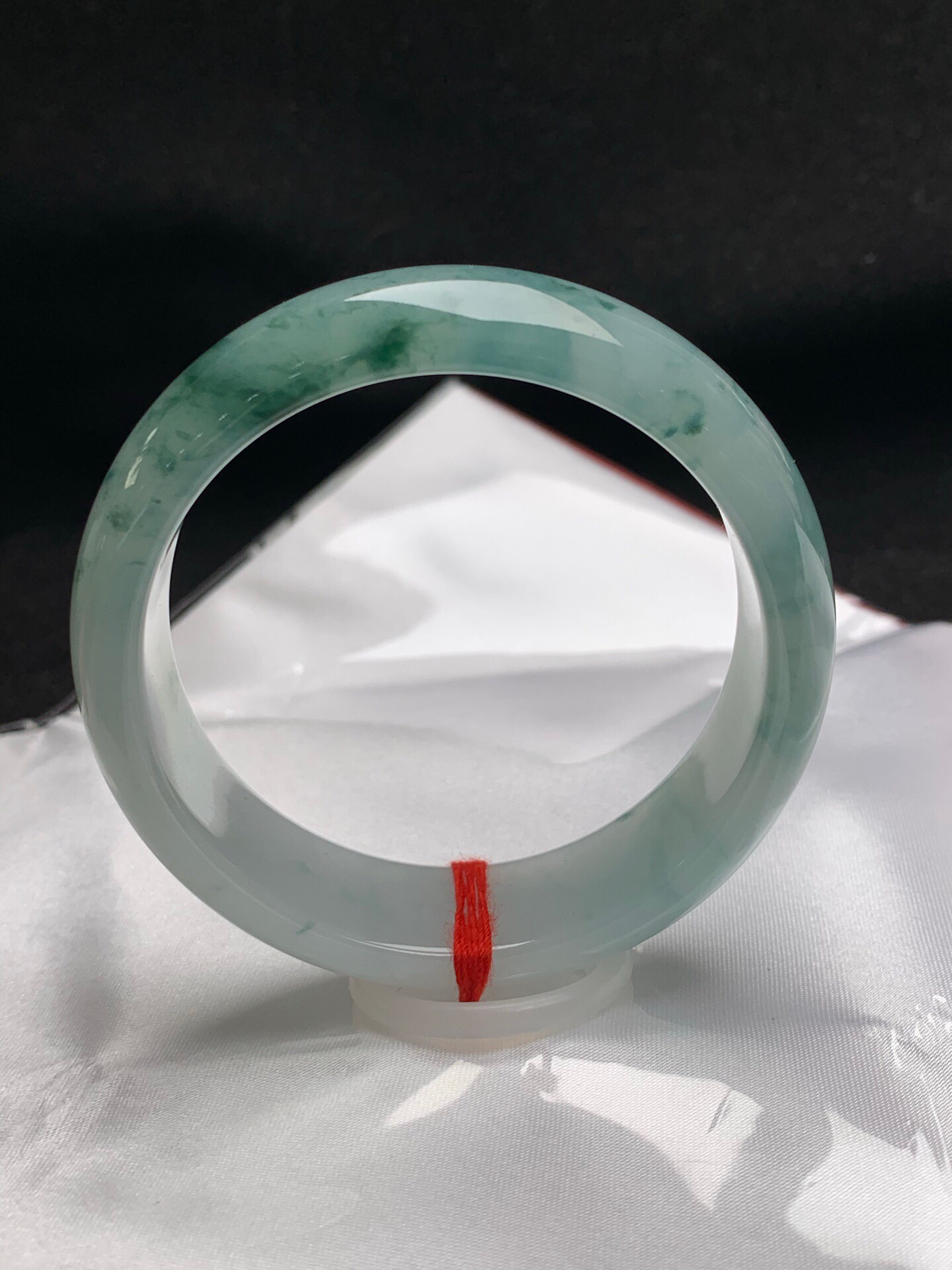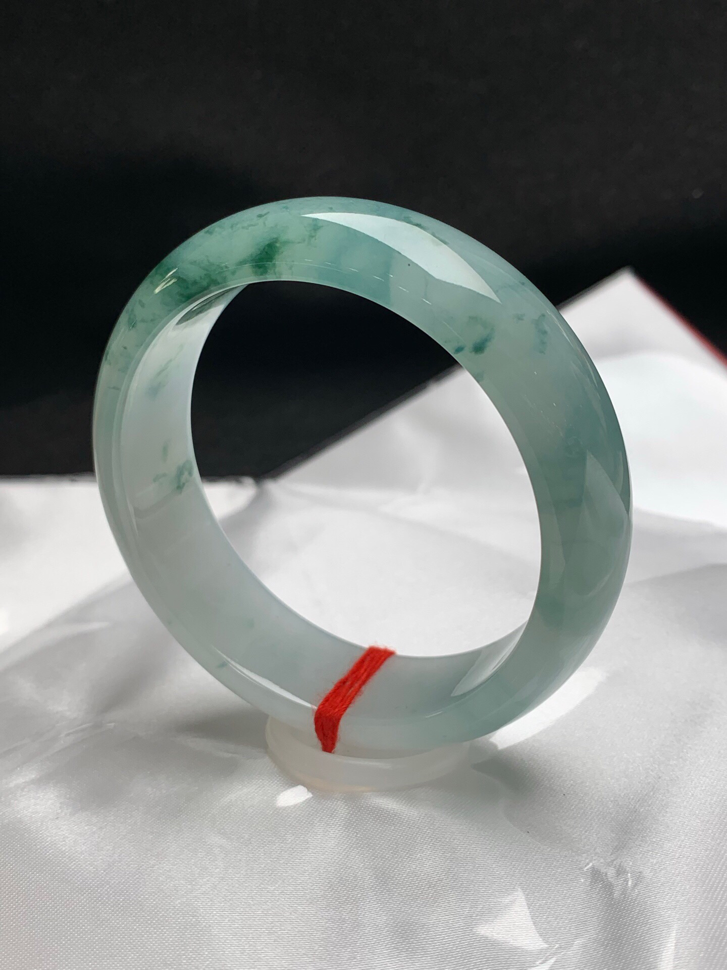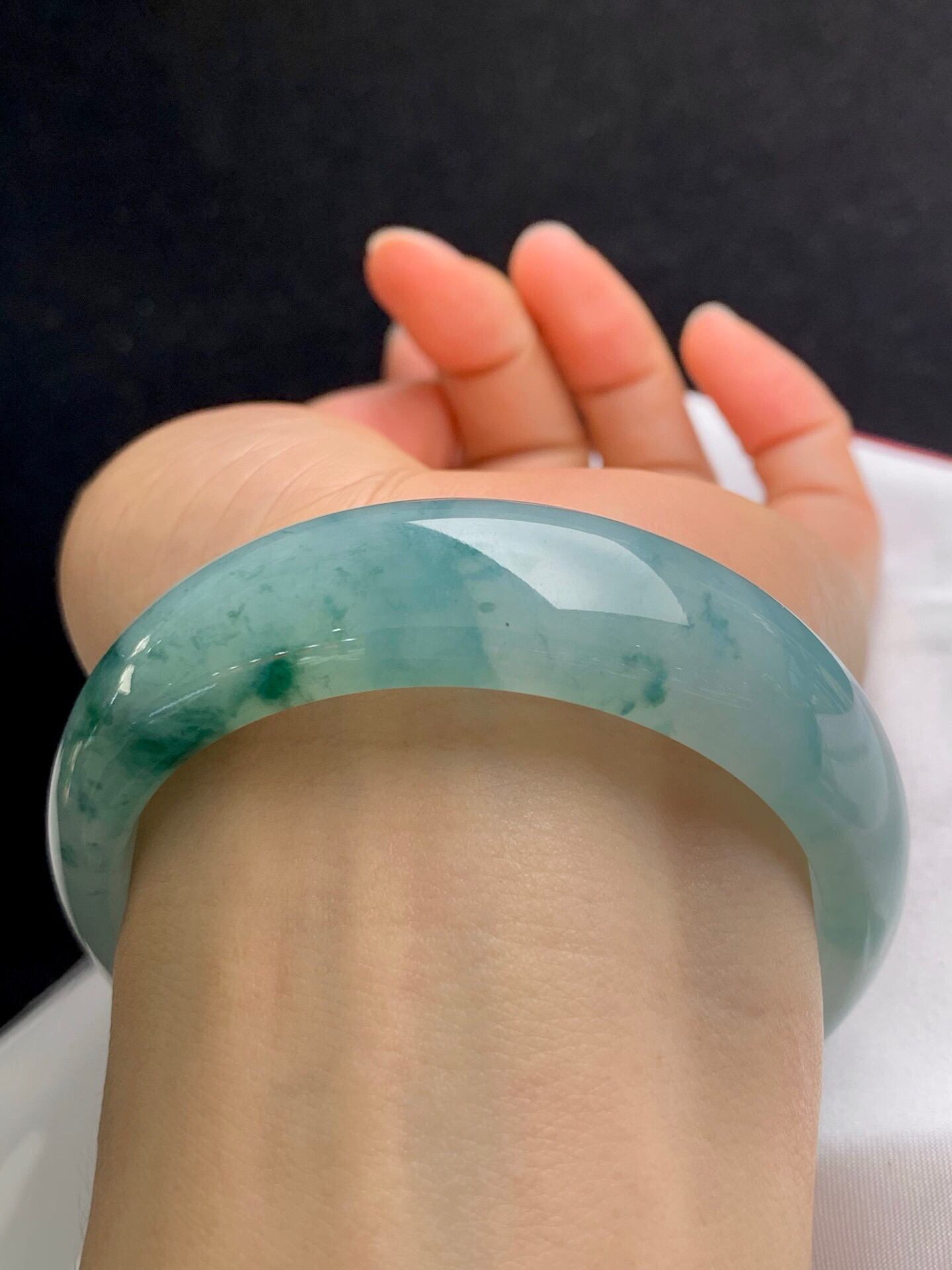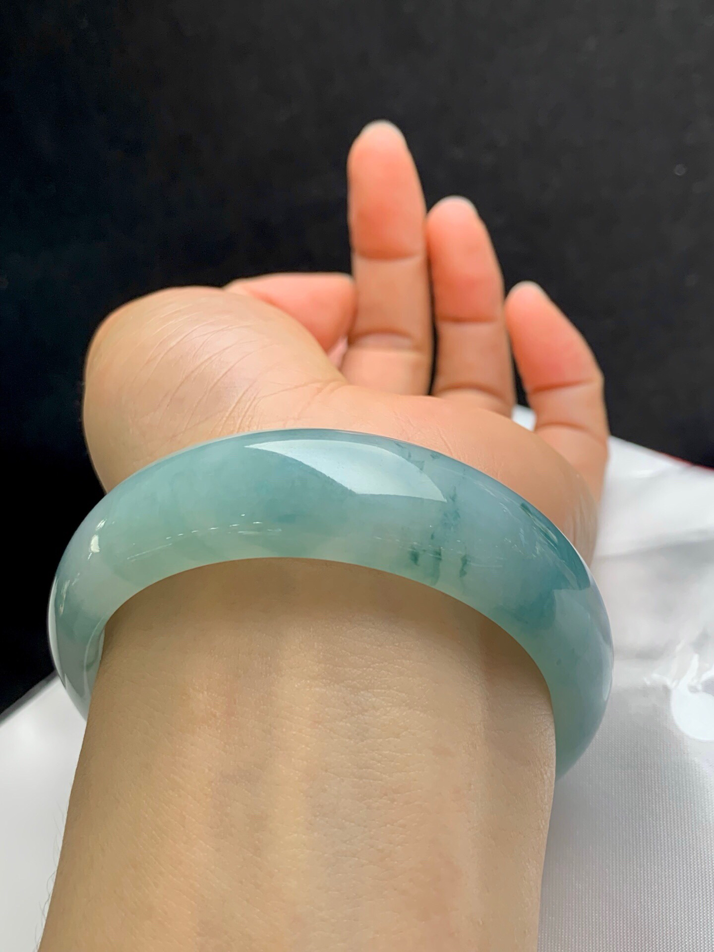 620403,57.8圈口,糯冰飘花正圈平安镯,宽版条形,白底飘蓝花,老种料,底子冰胶细润,完美,尺寸:57.8-17.8-7.9,超值价💰61300 #优石客珠宝#香玉荟萃