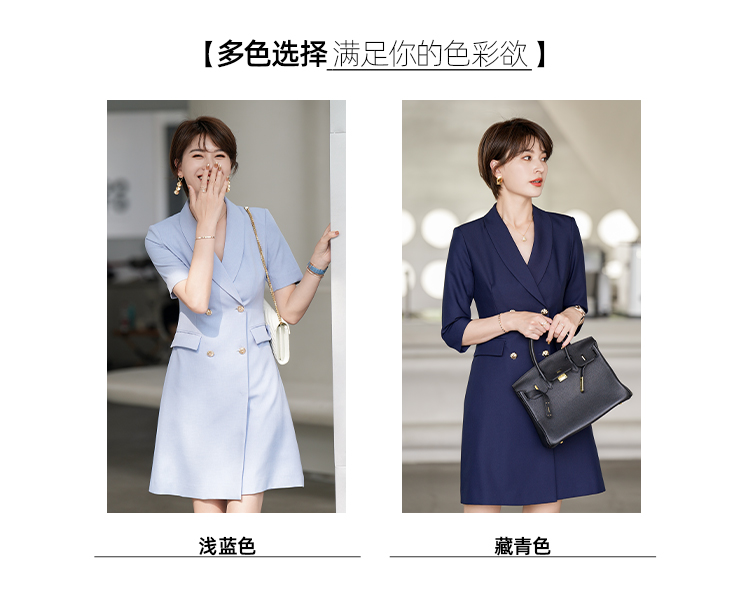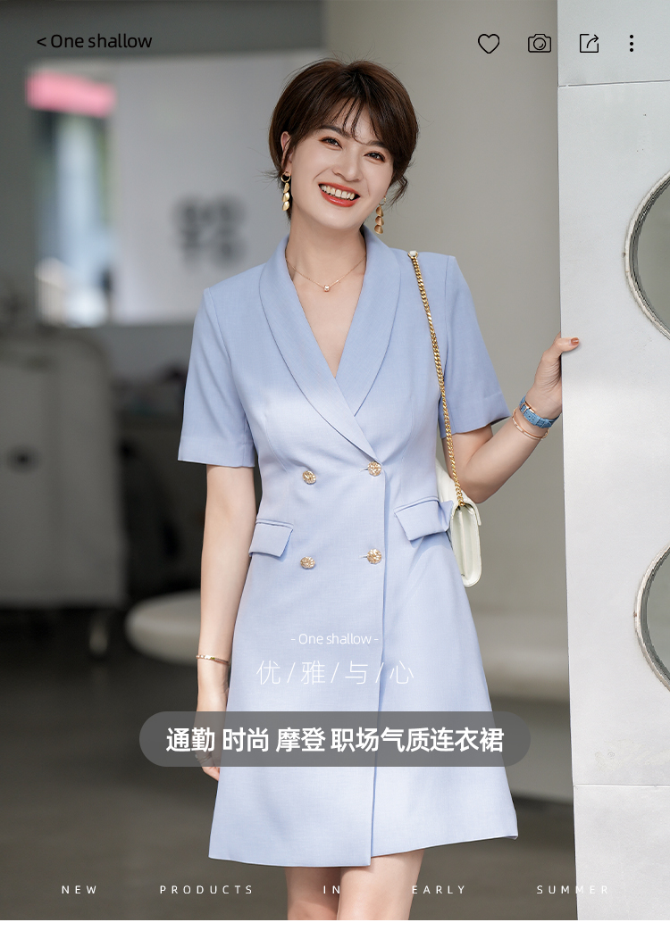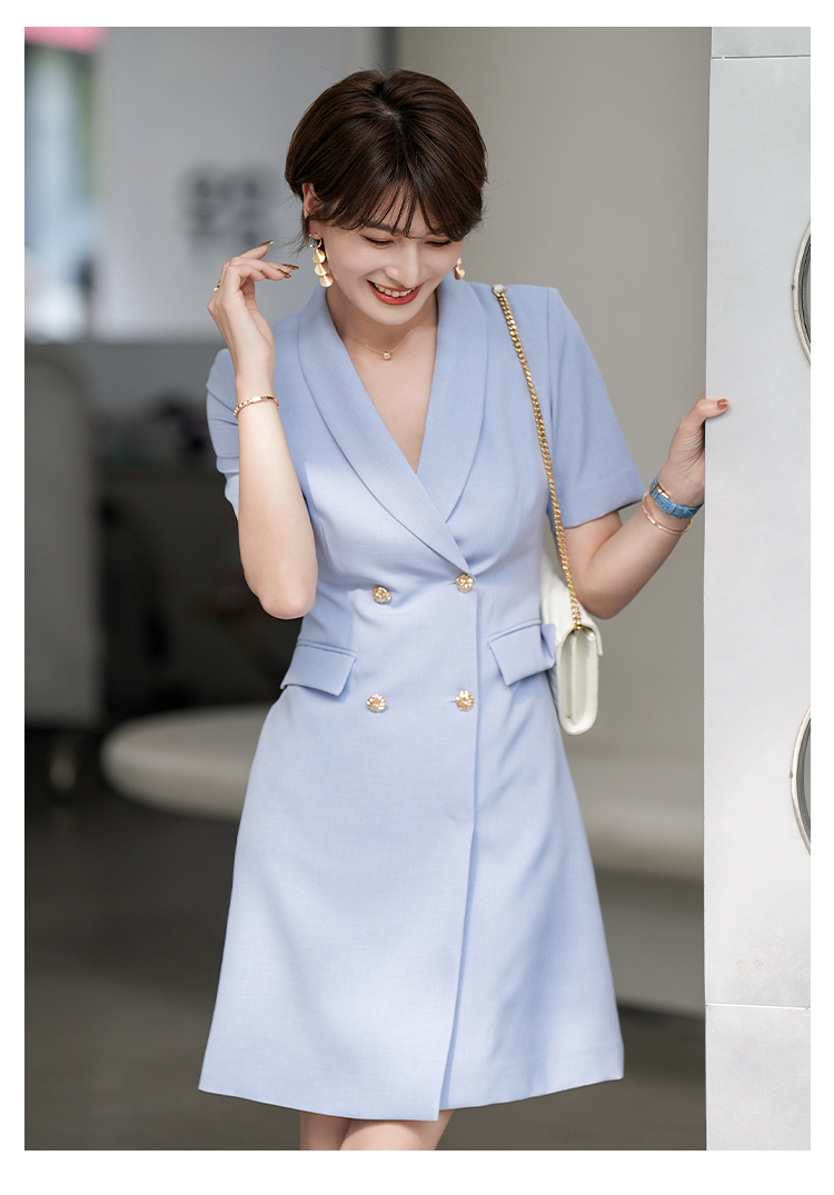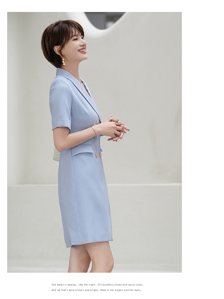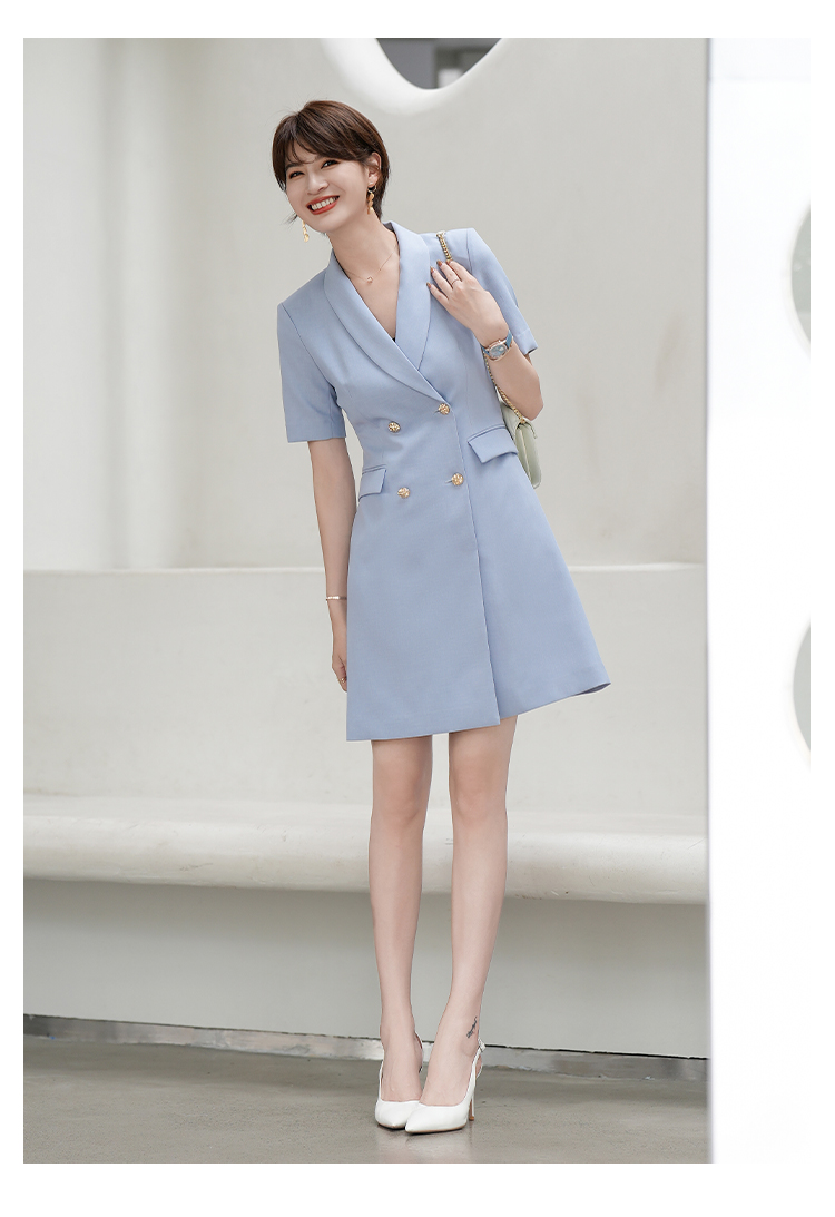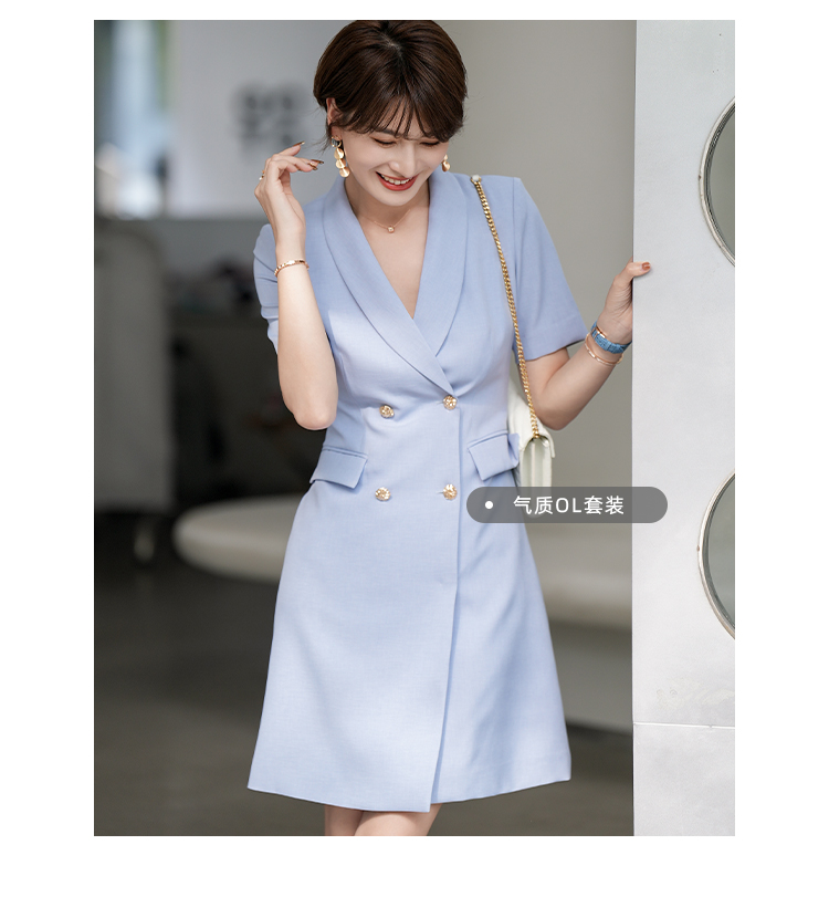 蓝色连衣裙女夏短袖薄款2023新款双排扣西装裙正装工作服
