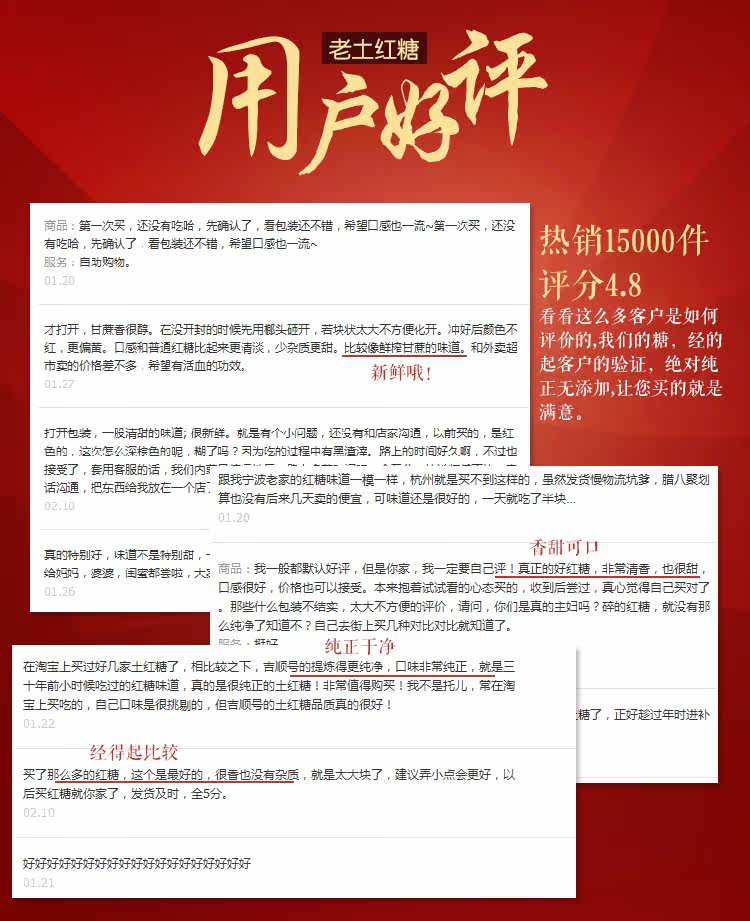 A:古法老土红糖,使用的是传统工艺制作,但是因为火候的差异,导致红糖的颜色不可能完全的统一,有的深点,有的浅点,但是这些都是不会影响到红糖的品质的.另外手工熬制的红糖虽然经过了多重过滤,但是依旧不能够消除所有杂质,所以有一点杂质是正常的,不影响食用的哦.