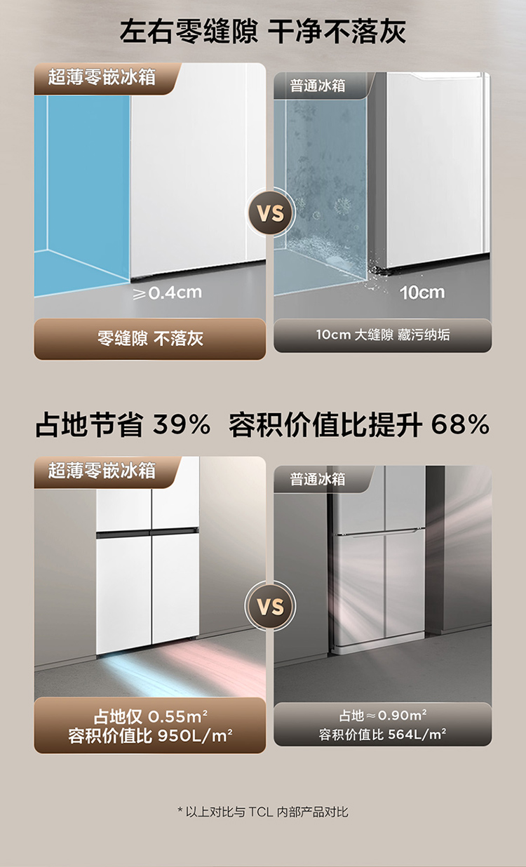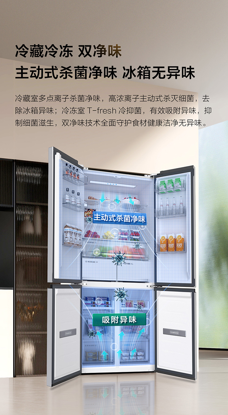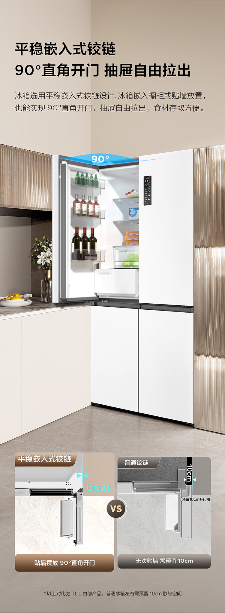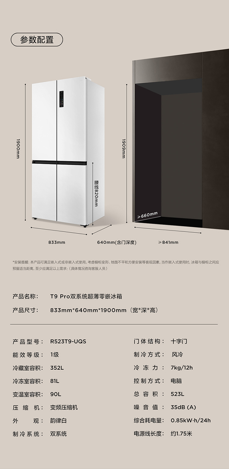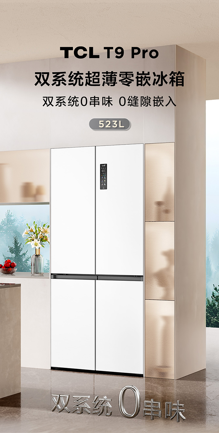 TCL 523升T9 Pro十字对开四开门双系统双净味超薄零嵌入式底部散热冰箱 R523T9-UQS