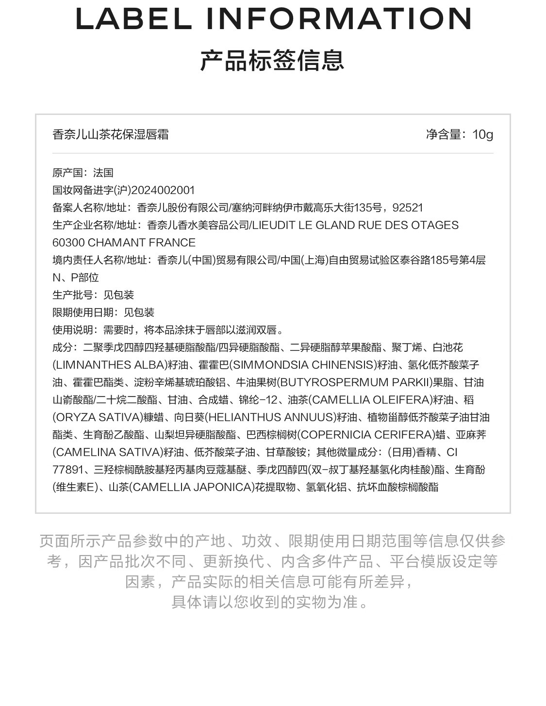 香奈儿山茶花保湿唇霜10g