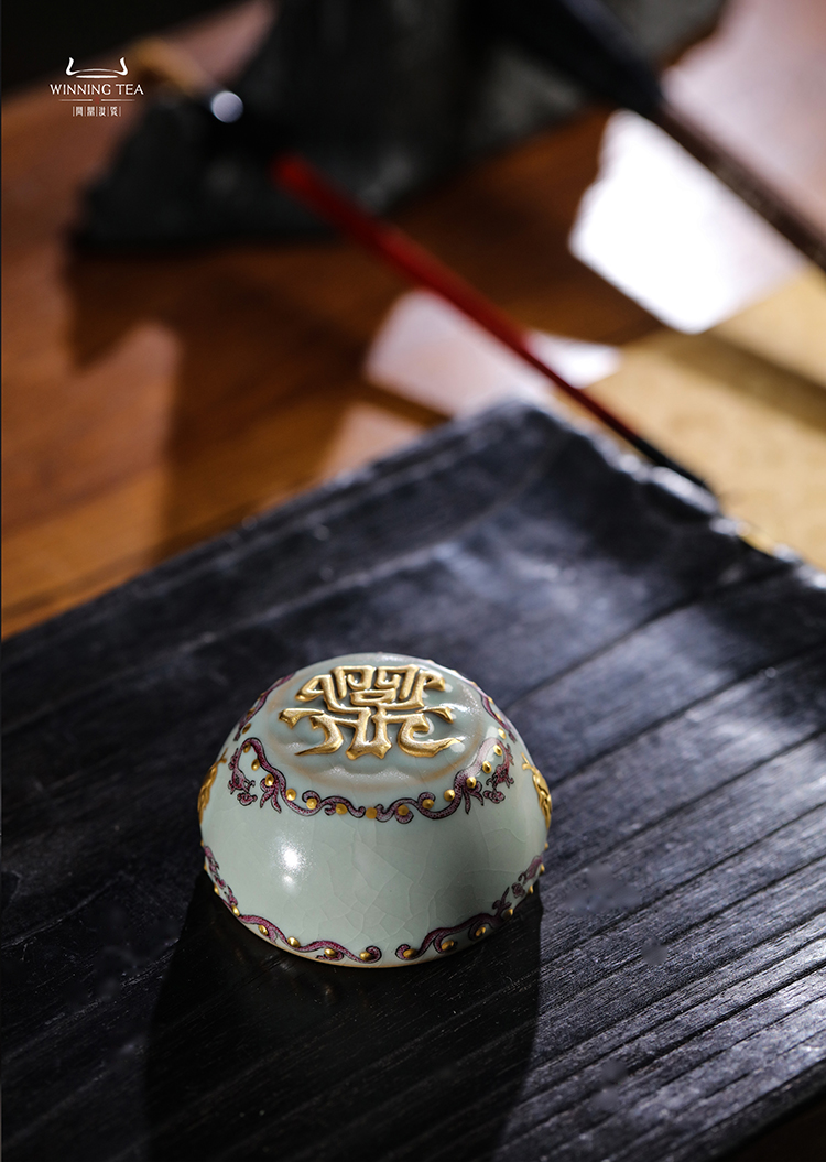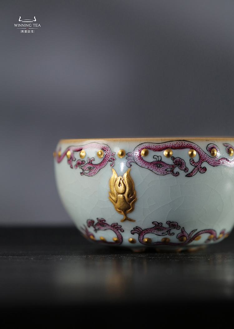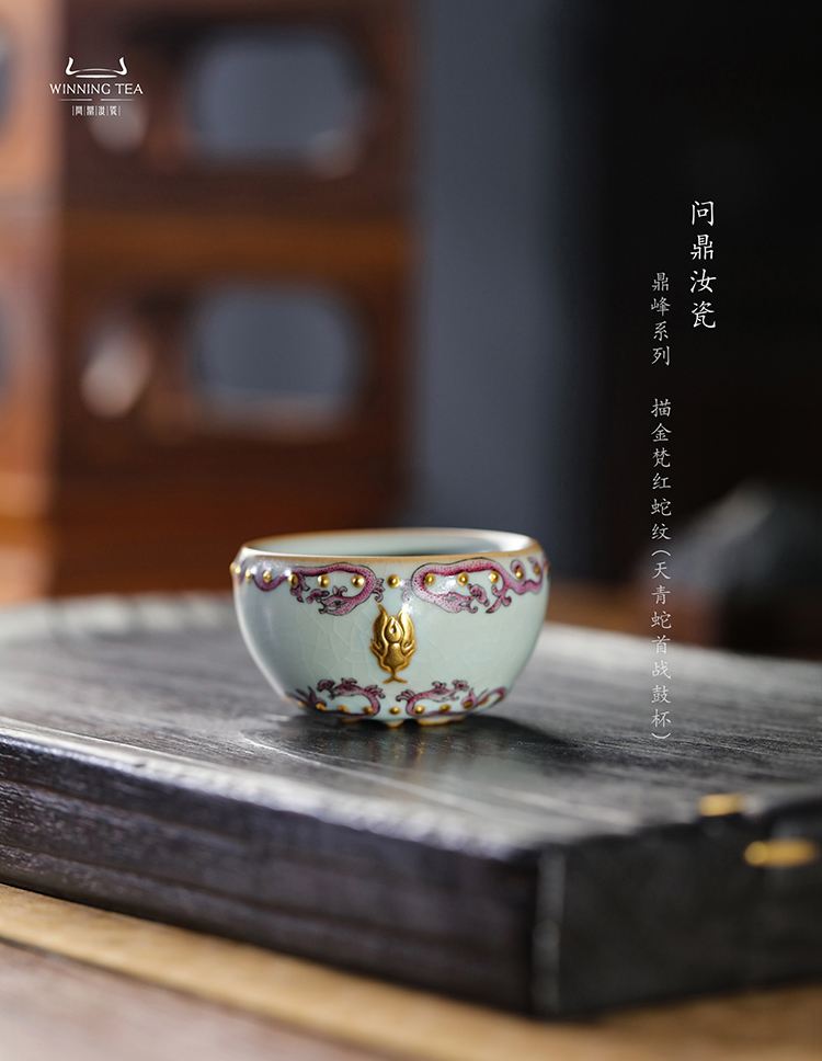 问鼎汝瓷鼎峰系列天青蛇首战鼓杯(描金梵红蛇纹)