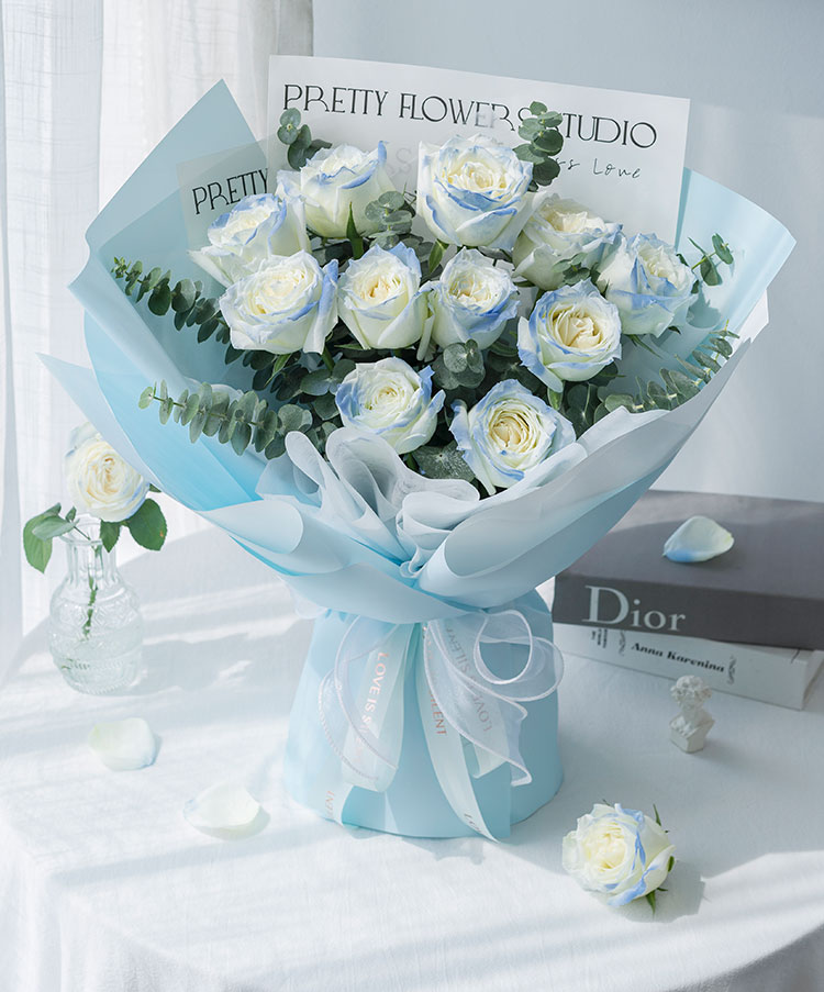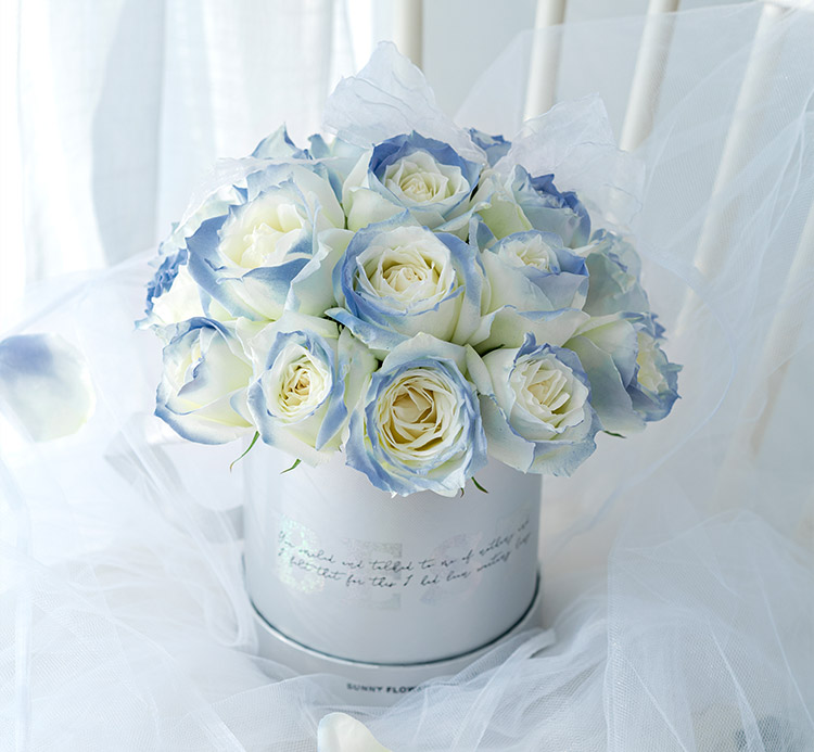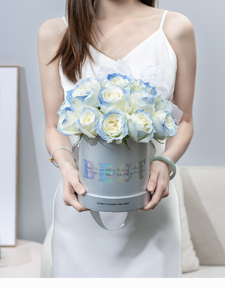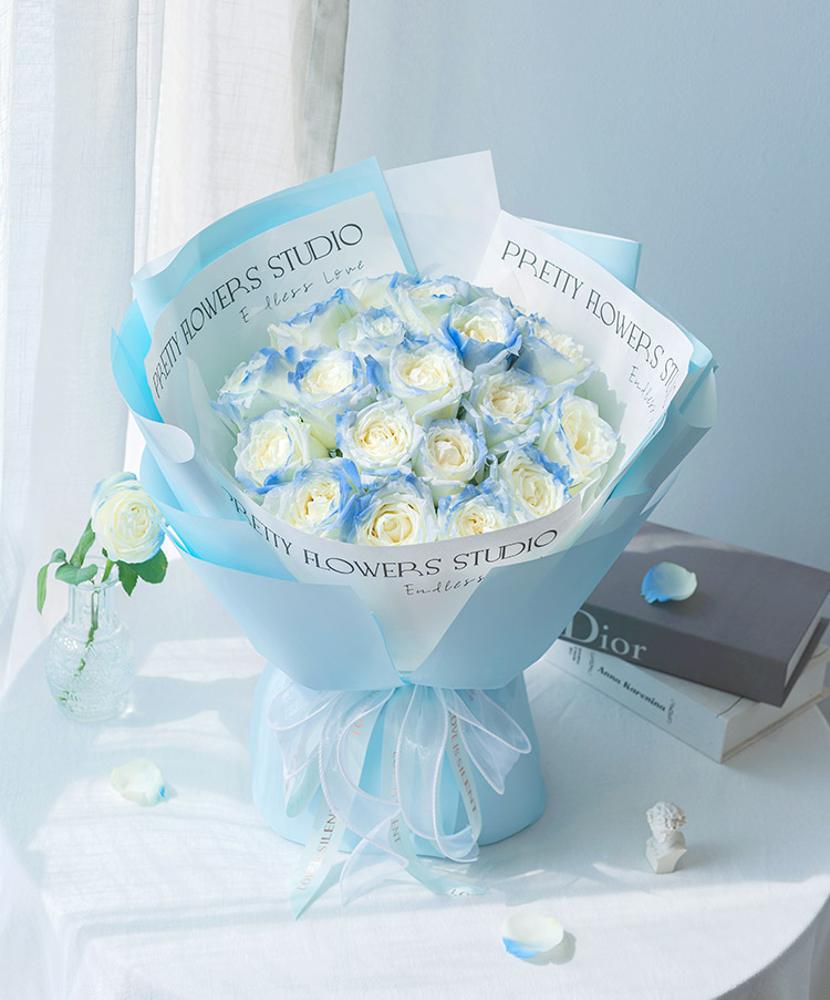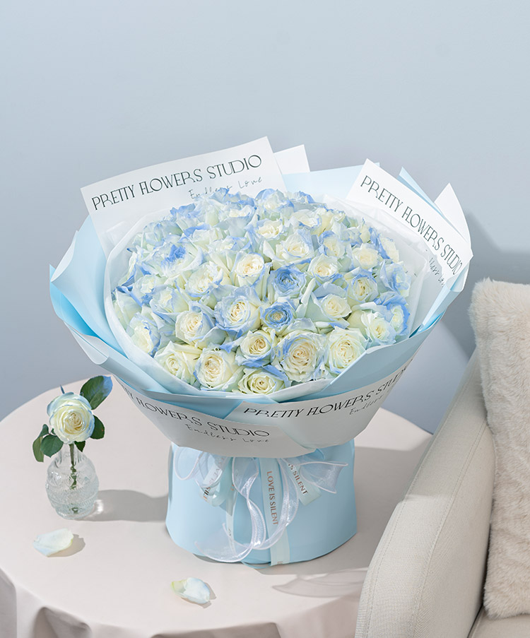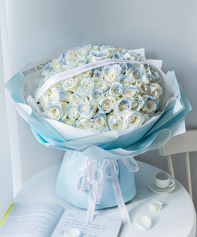 特别说明:碎冰蓝玫瑰花,是由白玫瑰喷色而成,因为花艺师手艺不一样,每一朵玫瑰的喷色成品不一样。