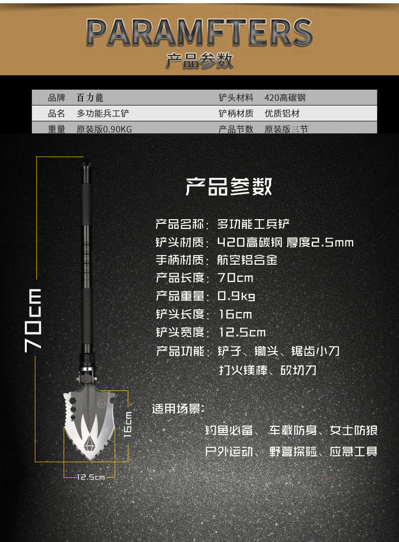 新款多功能工兵铲,配备有打火棒,口哨,多功能刀,救生锥,铲包,特别适合户外野营钓鱼,车载防身,骑行一族,便携,坚硬,做工精良,简单实用。(实用款)