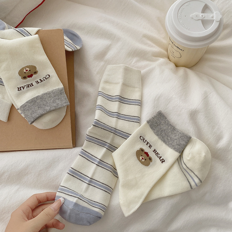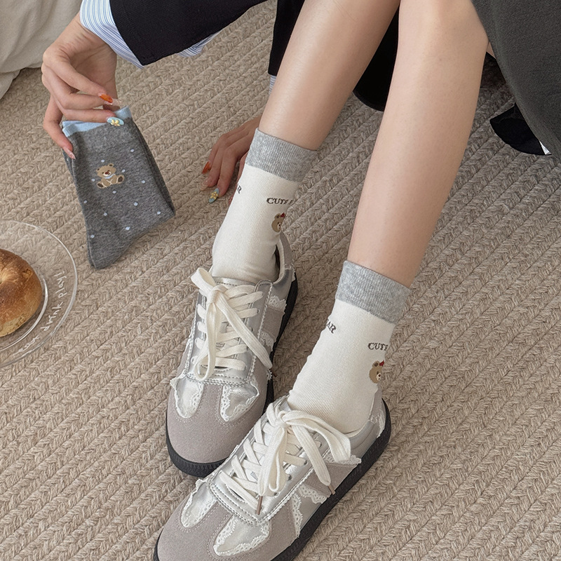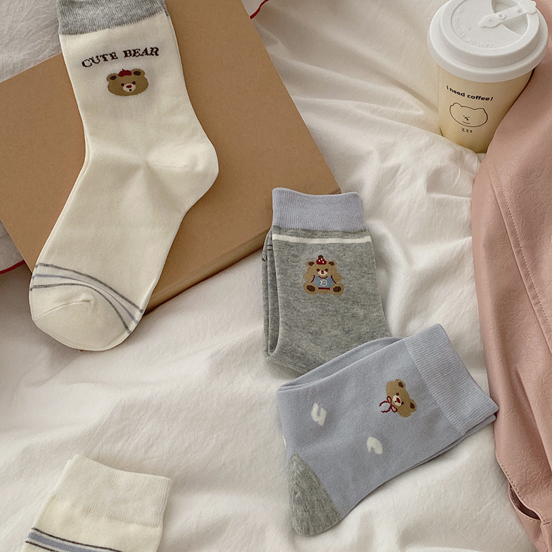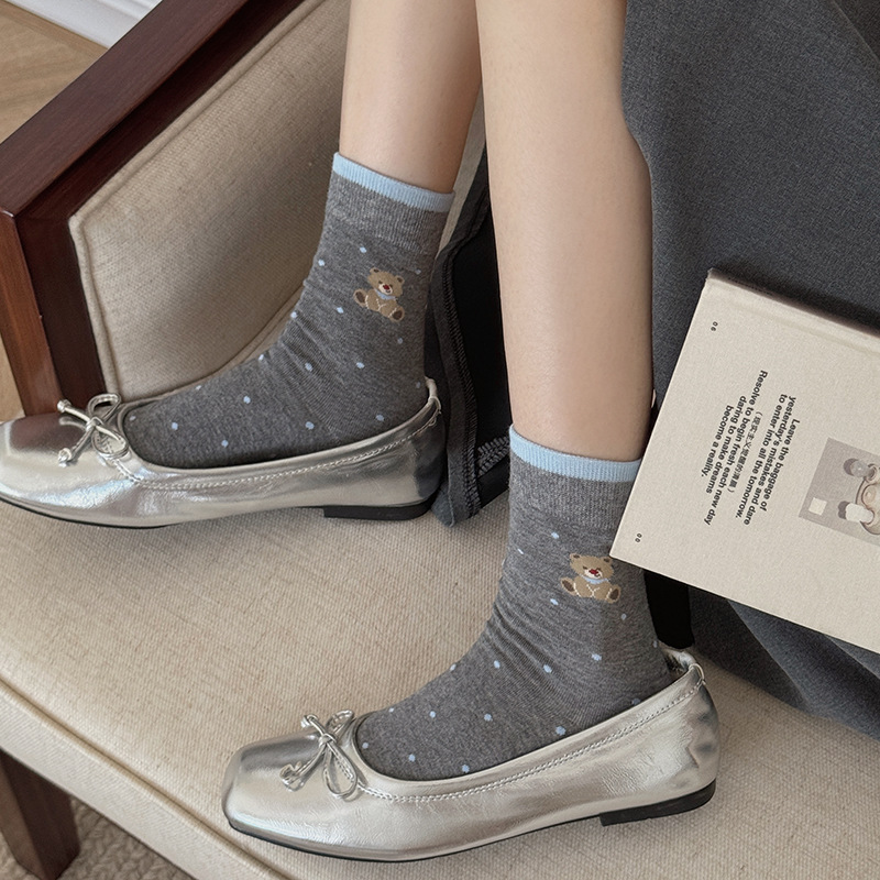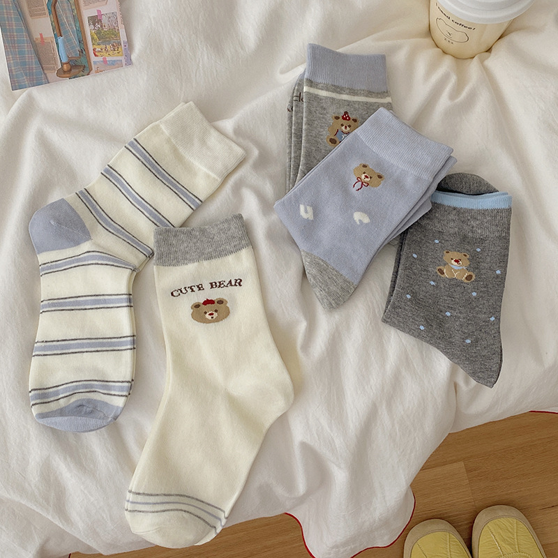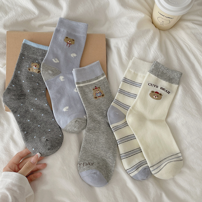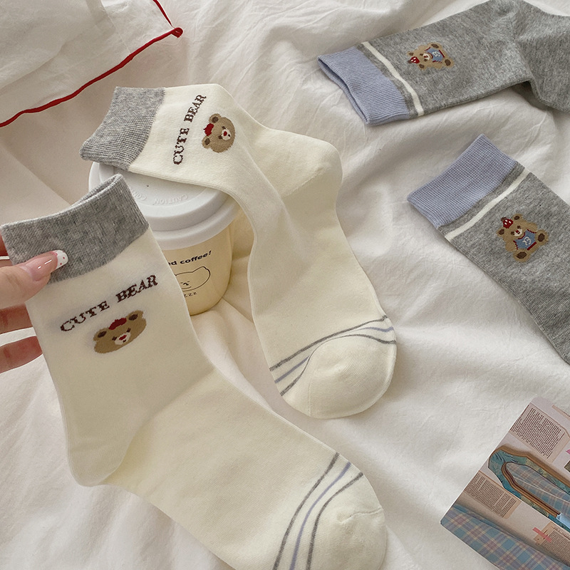 4双一组!可爱卡通小熊灰色系学院风中筒女袜袜子女韩版东大门棉袜春秋款