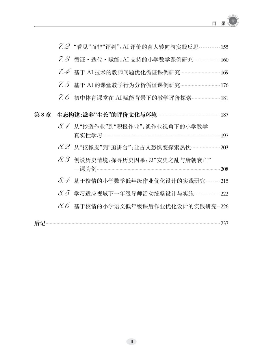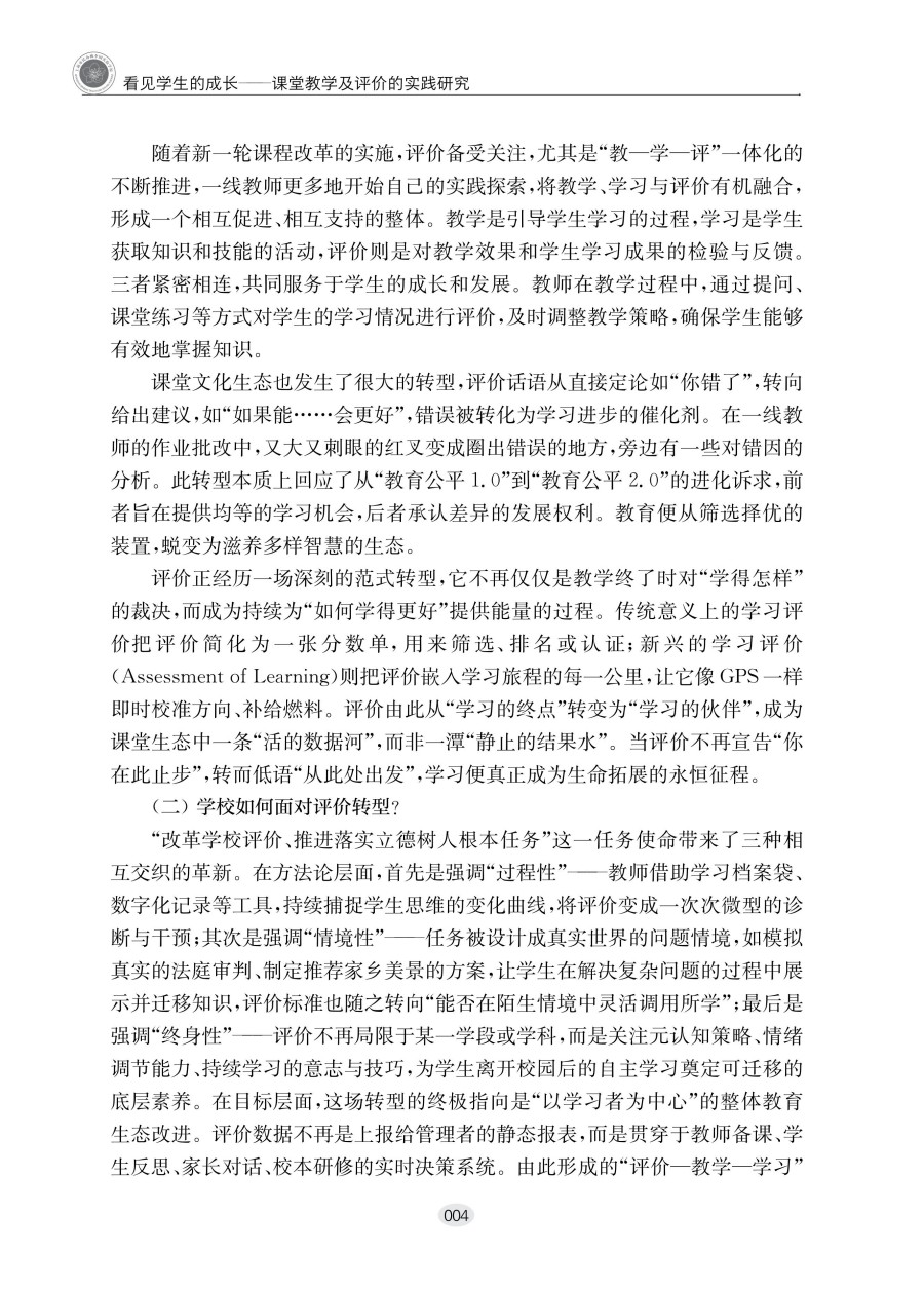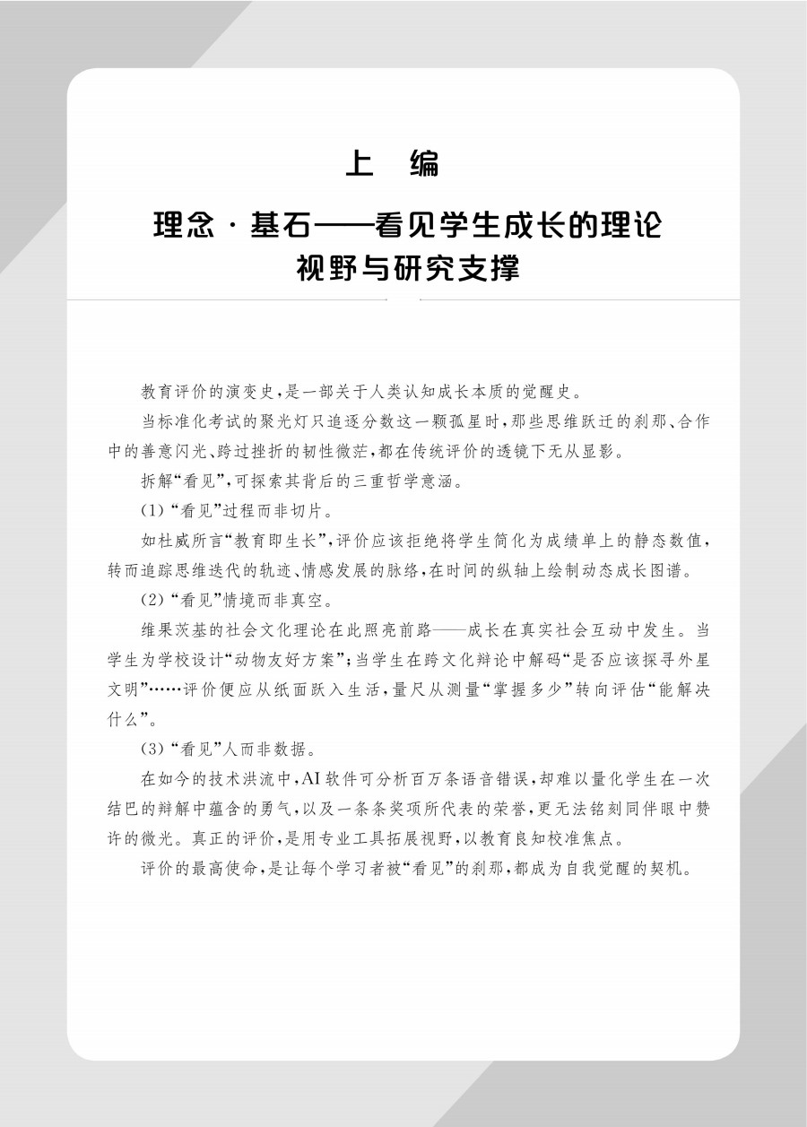 本书为双新教研文库中的一种,基于;从评判走向看见与滋养的核心理念,系统构建了以学习生长观察指标、课堂评价实践模型、跨学科课例验证为核心的改革体系。上篇理念基石看见学生成长的理论视野与研究支撑,提出;学习即生长的评价范式转型理论;中篇实践成长课堂评价改革全景透视与课例深描,通过16精选课例,深度解析评价工具如何;看见并;滋养学习动态生长;下篇赋能未来深化评价改革的支持系统与前瞻思考,从教师发展与生态构建视角,提供改革可持续路径。读者对象:中小学教师、教研员、师范院校师生。