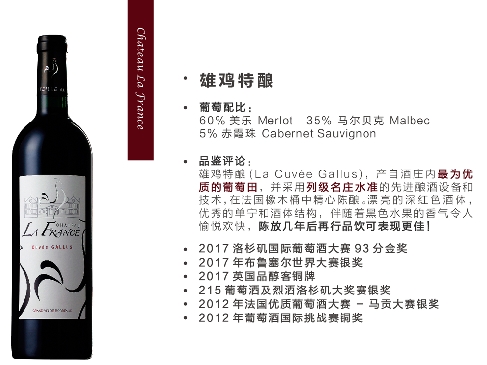 法兰西古堡CHATEAU LA FRANCE位于波尔多和圣埃米利永之间,是继法兰西第二共和国之后,波尔多优质法定产区最大的庄园之一。城堡建在葡萄园中央的一个罗马高卢古遗址上。酒庄的历史可以上溯至1635年,在路易十三时期酒庄属于甘萨克皇室家族,酒庄一直被命名为Quinsac甘萨克酒庄,直到1930年,Chateau La France,以法国国家名字命名的酒庄名字被继承下来。