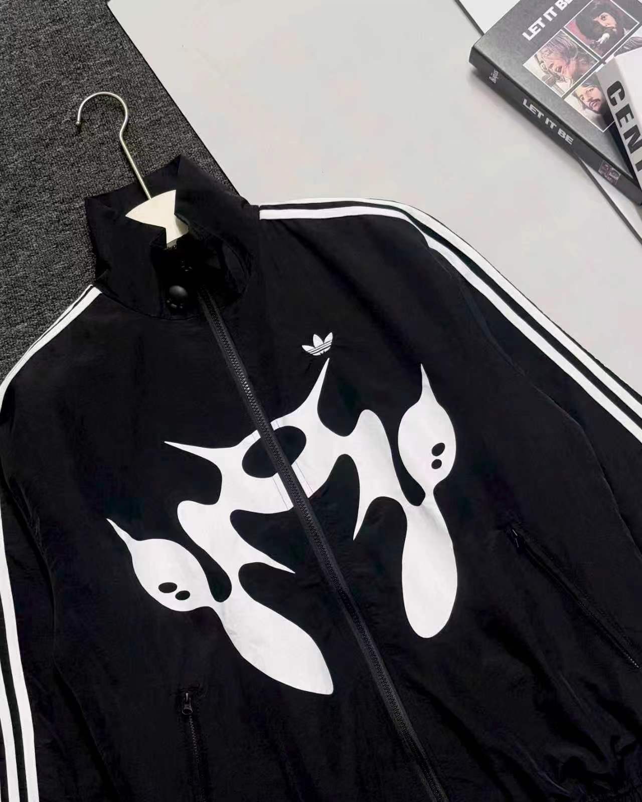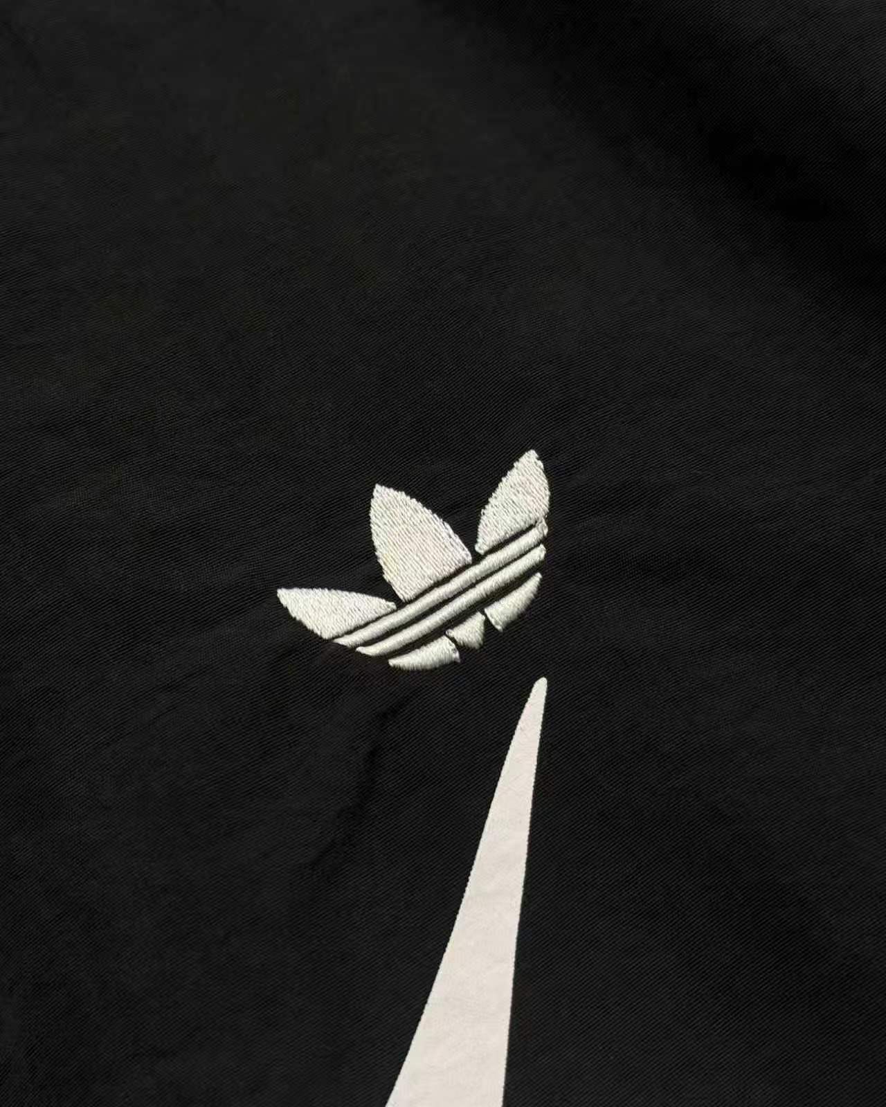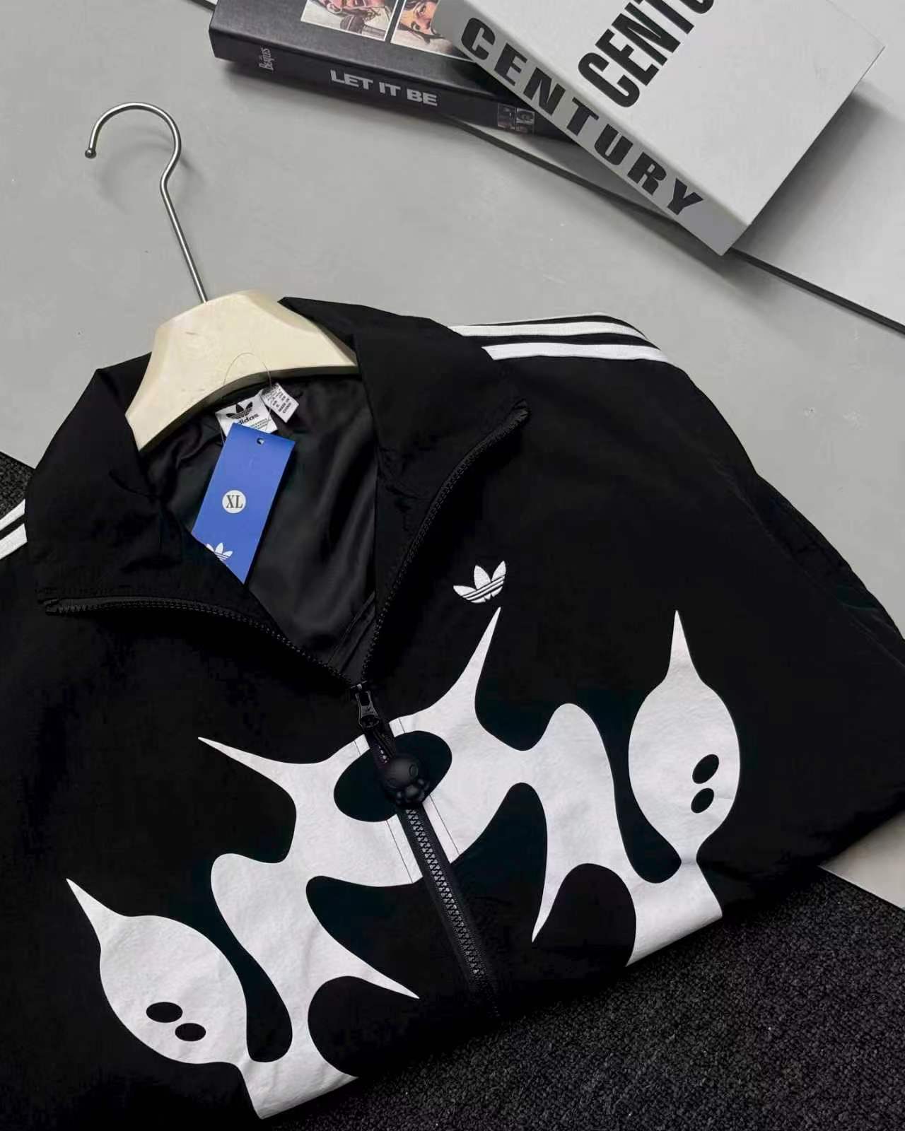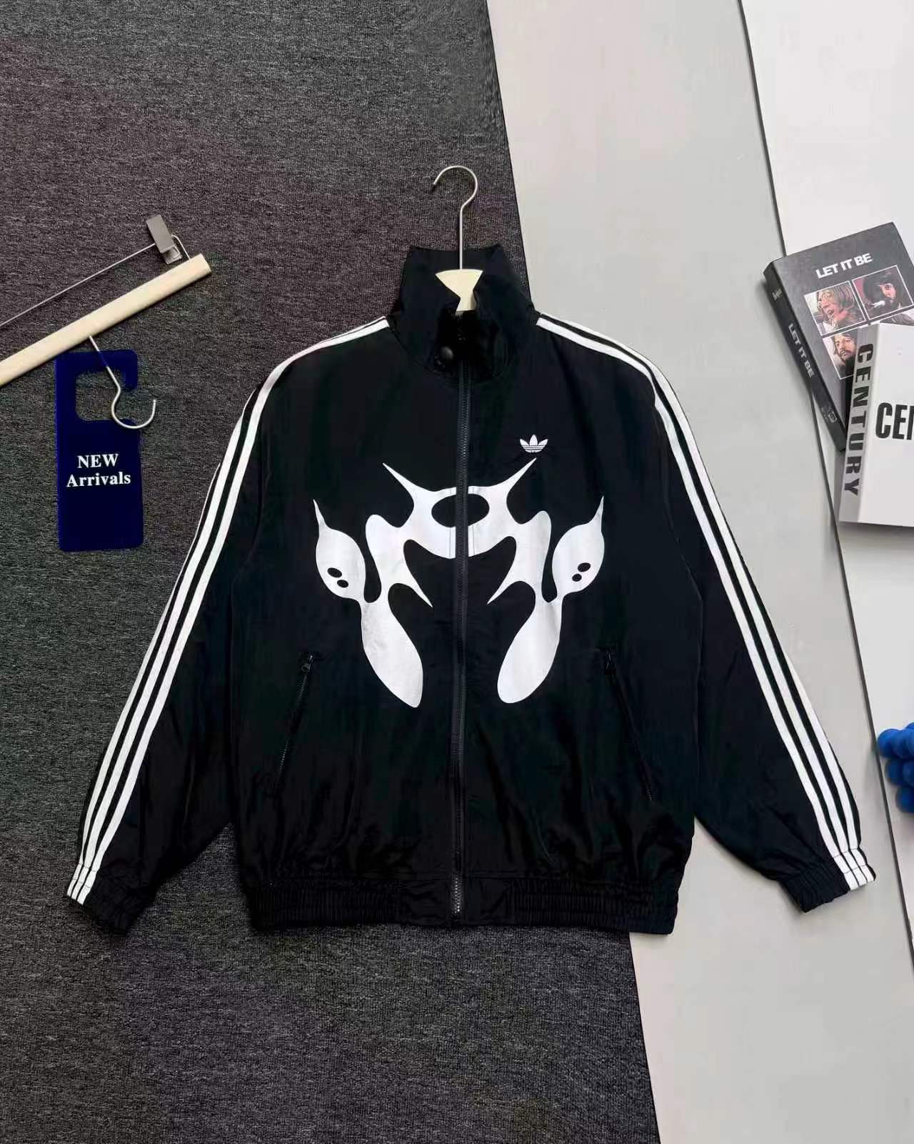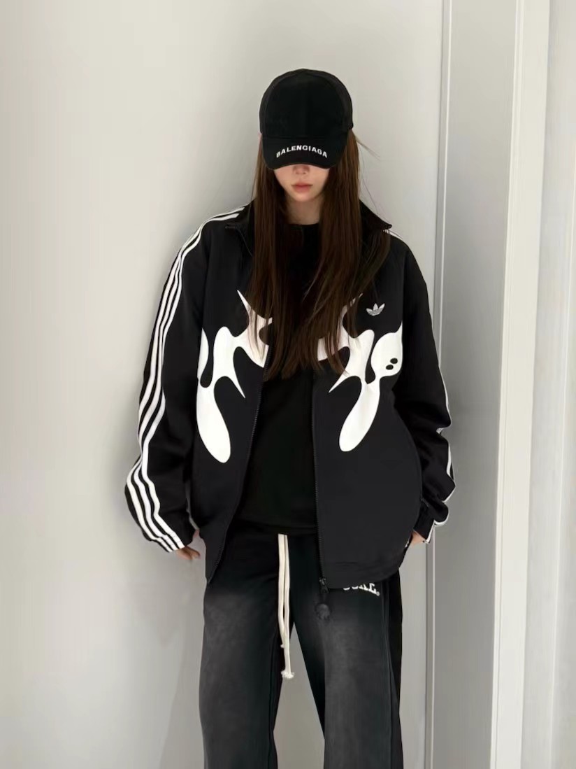 联名时尚印花运动休闲上衣外套,面料采用定制梭织面料,原版开模印花,面料柔软舒适,,又不会显臃肿,整件衣服原版剪裁设计非常个性,立领夹克的版型上身超酷,胸口刺绣logo搭配纯色整体,简约又不简单,下摆两侧都有口袋,定制拉链有三叶草logo,插肩袖的版型尽显复古风,男女同款上身效果百搭!