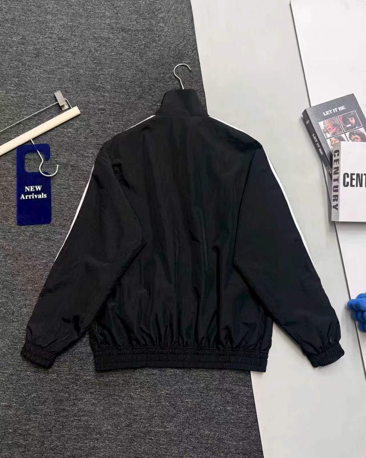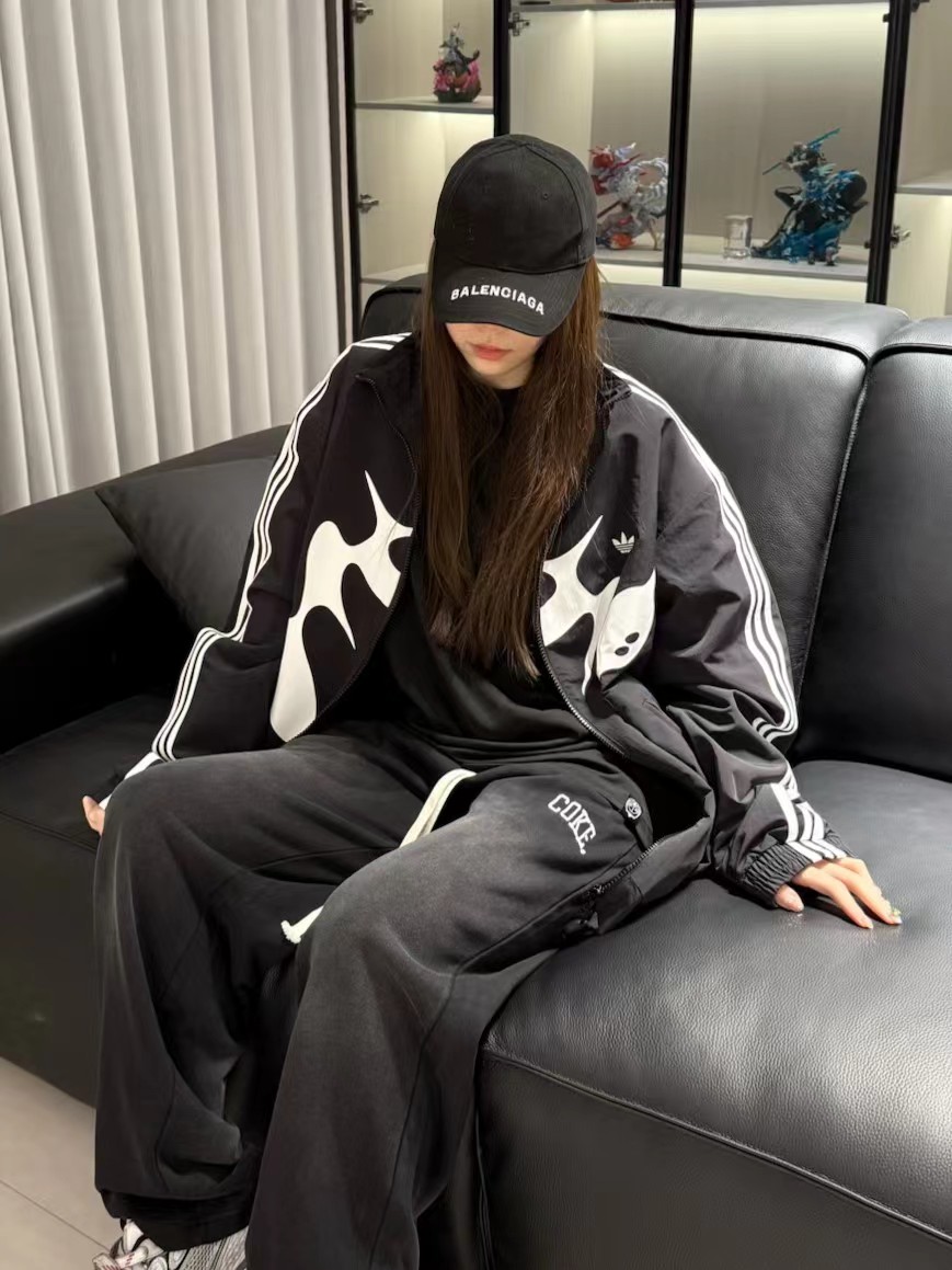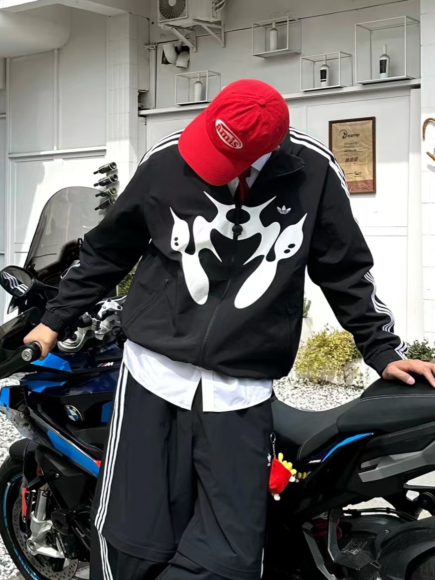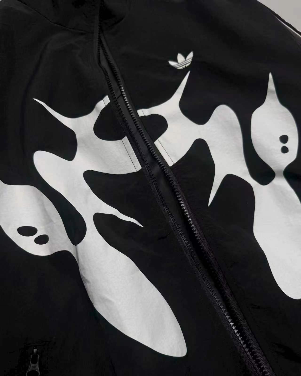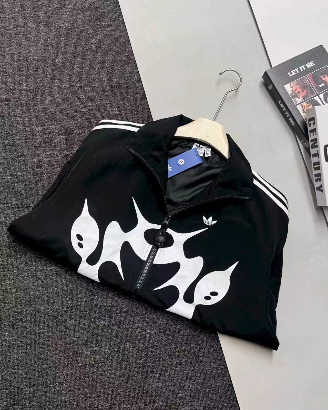 联名时尚印花运动休闲上衣外套,面料采用定制梭织面料,原版开模印花,面料柔软舒适,,又不会显臃肿,整件衣服原版剪裁设计非常个性,立领夹克的版型上身超酷,胸口刺绣logo搭配纯色整体,简约又不简单,下摆两侧都有口袋,定制拉链有三叶草logo,插肩袖的版型尽显复古风,男女同款上身效果百搭!