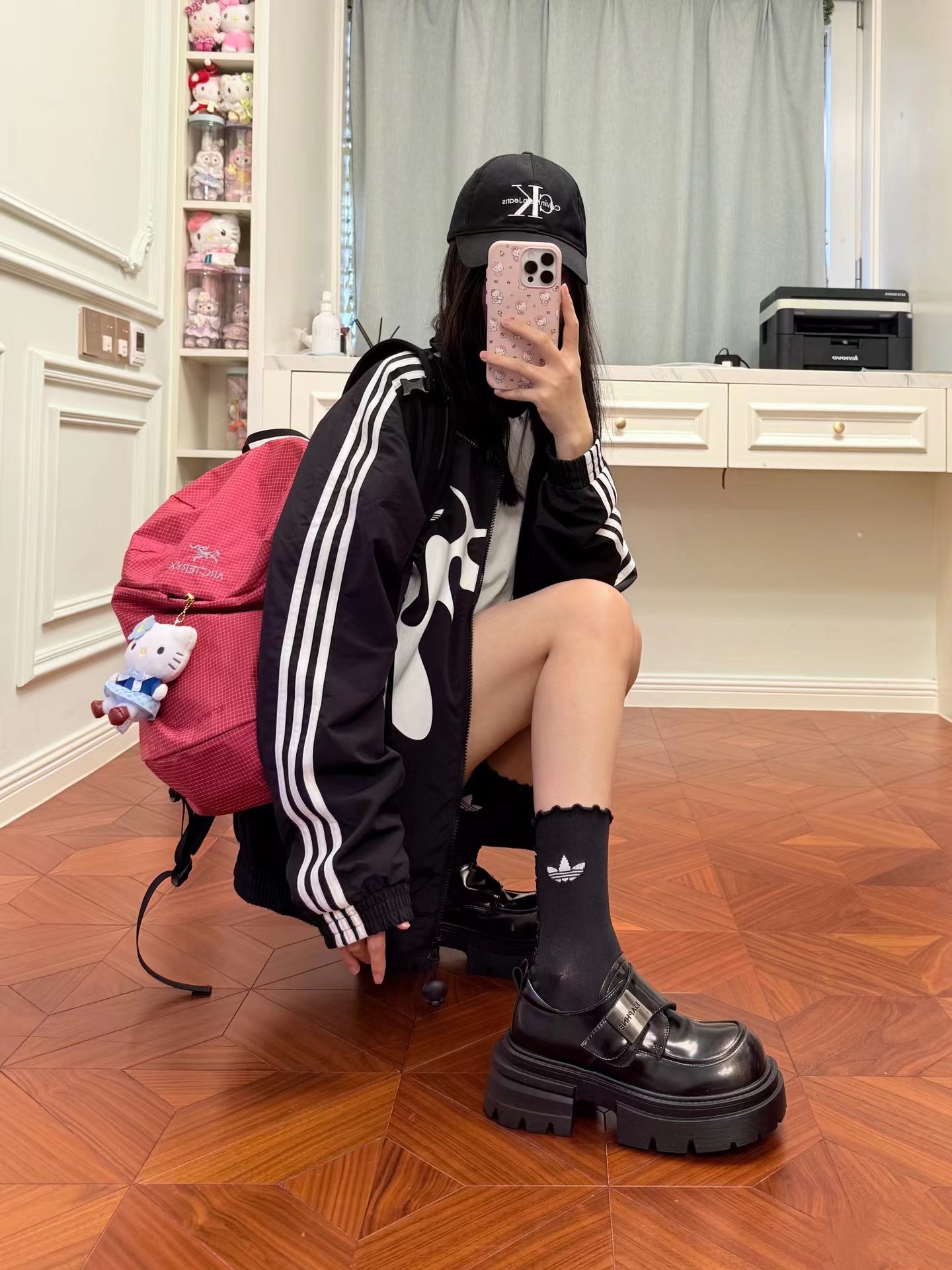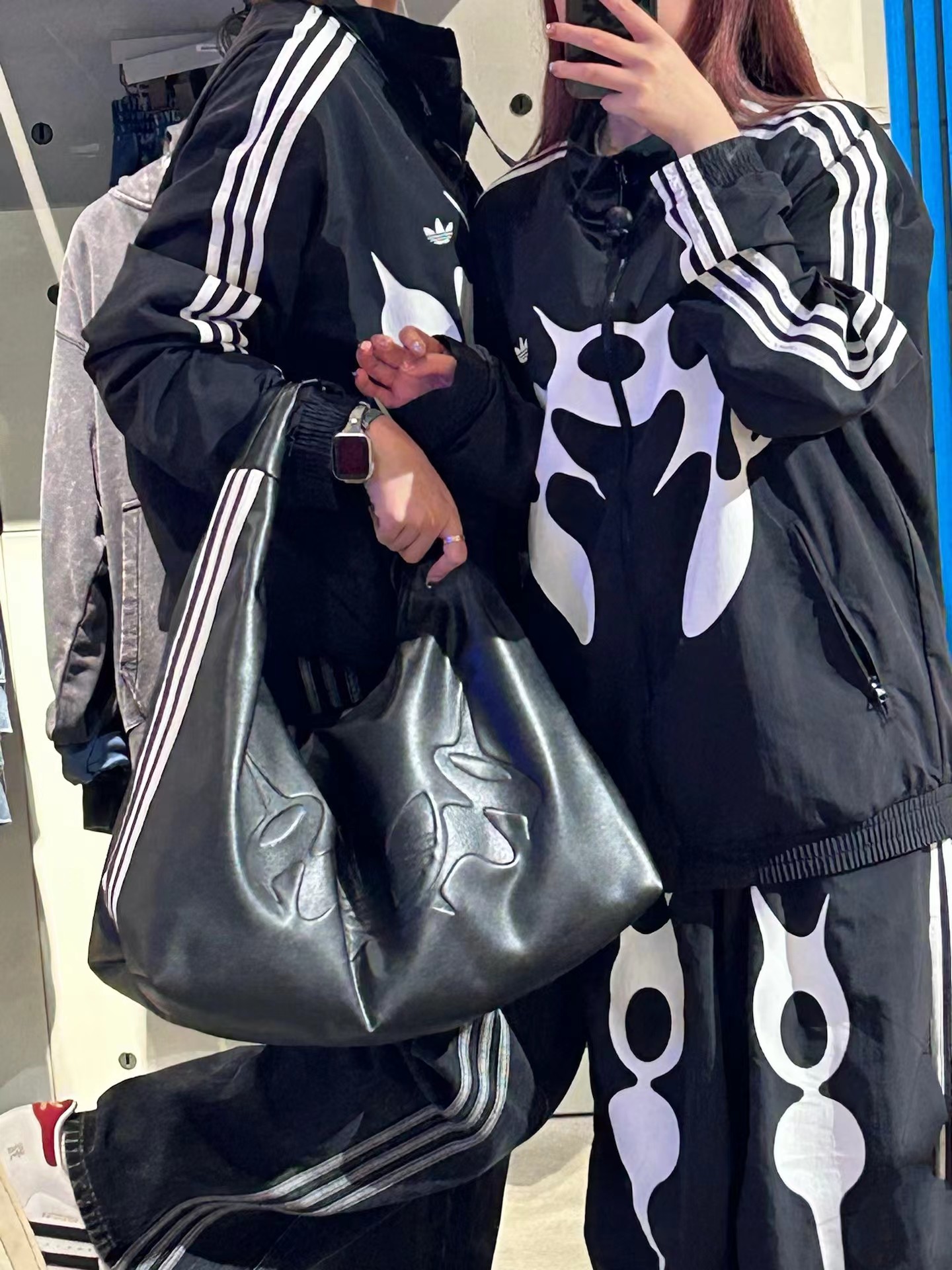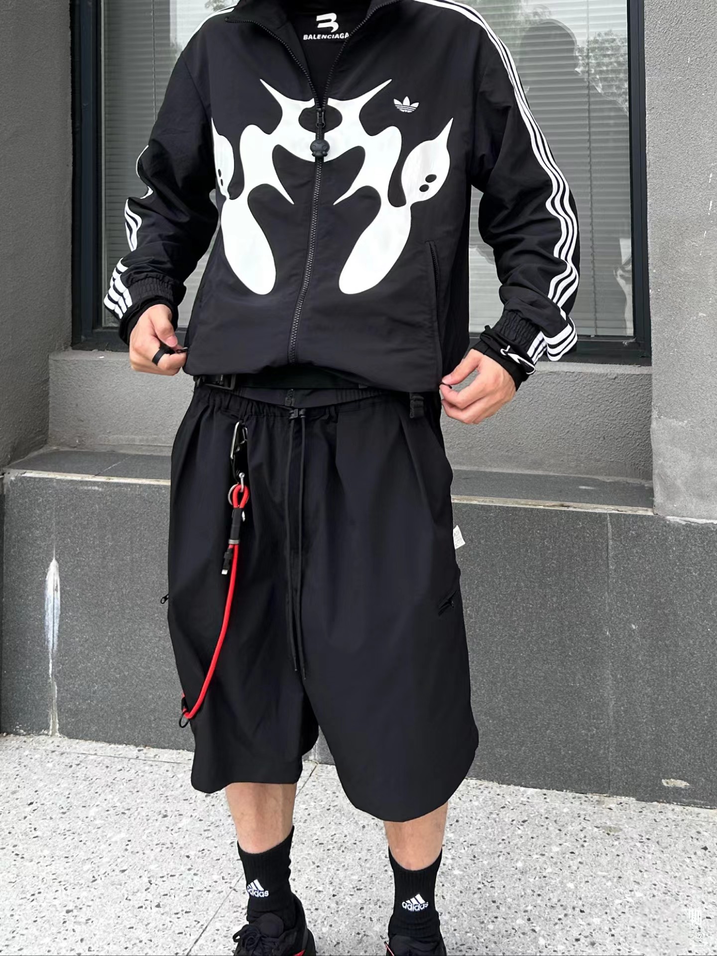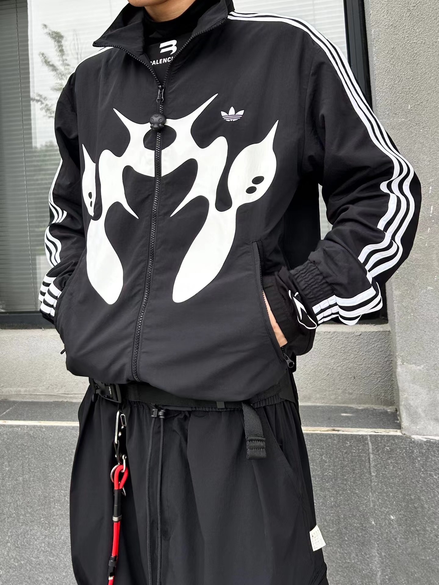 联名时尚印花运动休闲上衣外套,面料采用定制梭织面料,原版开模印花,面料柔软舒适,,又不会显臃肿,整件衣服原版剪裁设计非常个性,立领夹克的版型上身超酷,胸口刺绣logo搭配纯色整体,简约又不简单,下摆两侧都有口袋,定制拉链有三叶草logo,插肩袖的版型尽显复古风,男女同款上身效果百搭!