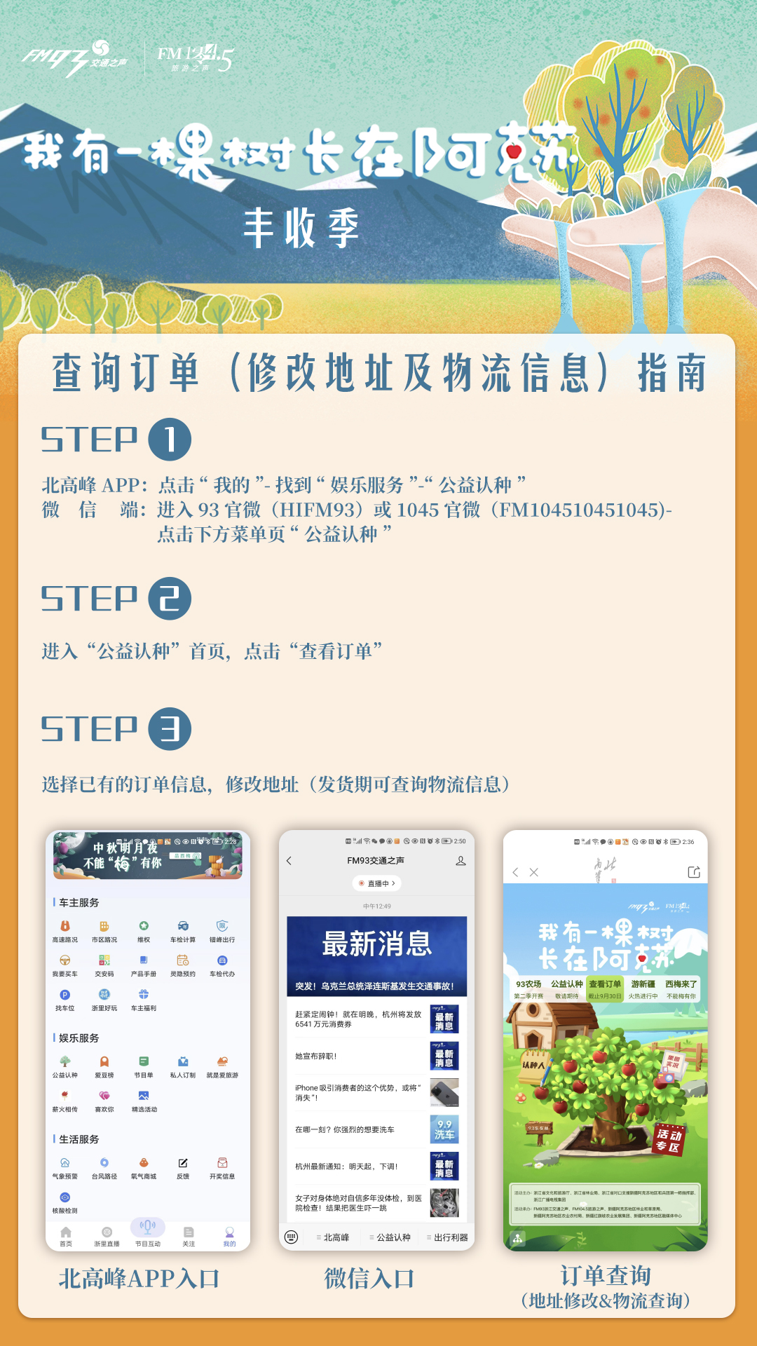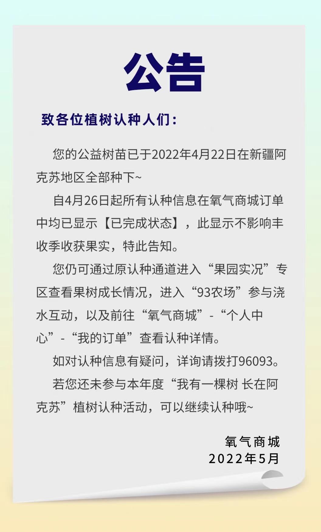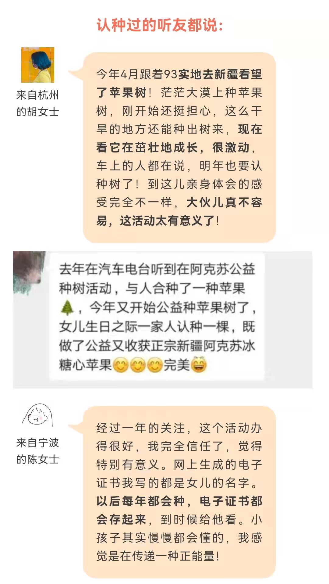 2020年"我有一棵树,长在阿克苏"——我为汽车种棵树大型公益活动启动,受到了全网1000万人的支持,大家纷纷参与认种,在柯柯牙地区初步形成占地10亩的"浙江听友爱心果园"。