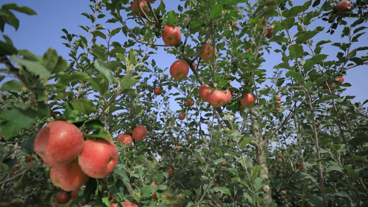 "一亩地大约能种120棵苹果树。三年挂果,五年丰产,一亩地产量可以达到5吨,300亩地能带来至少1500吨苹果!"