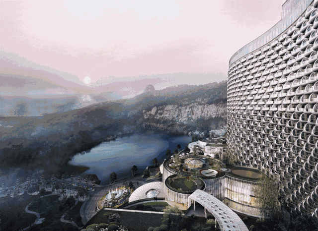 三面环山,腹拥湿地,面朝太湖,乐园建立在一片废弃矿坑山洼地上,晴天的日子,矿坑的水被太阳光映照得碧蓝沉静,山地高低起伏,树木参差错落,绿水青山造就金山银山,颜值这块,未来可期!