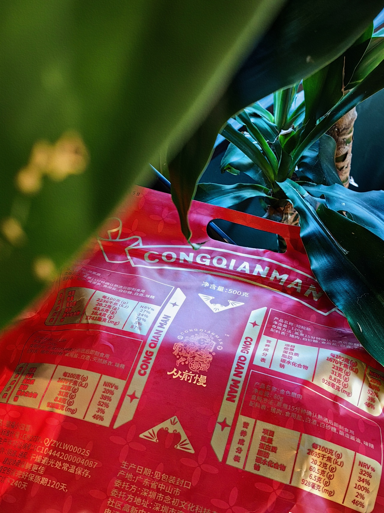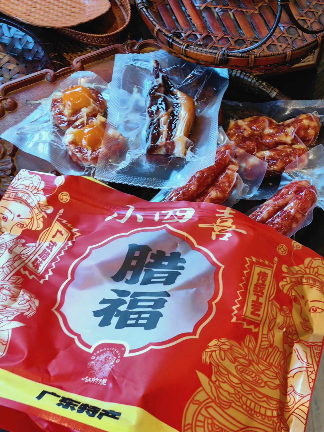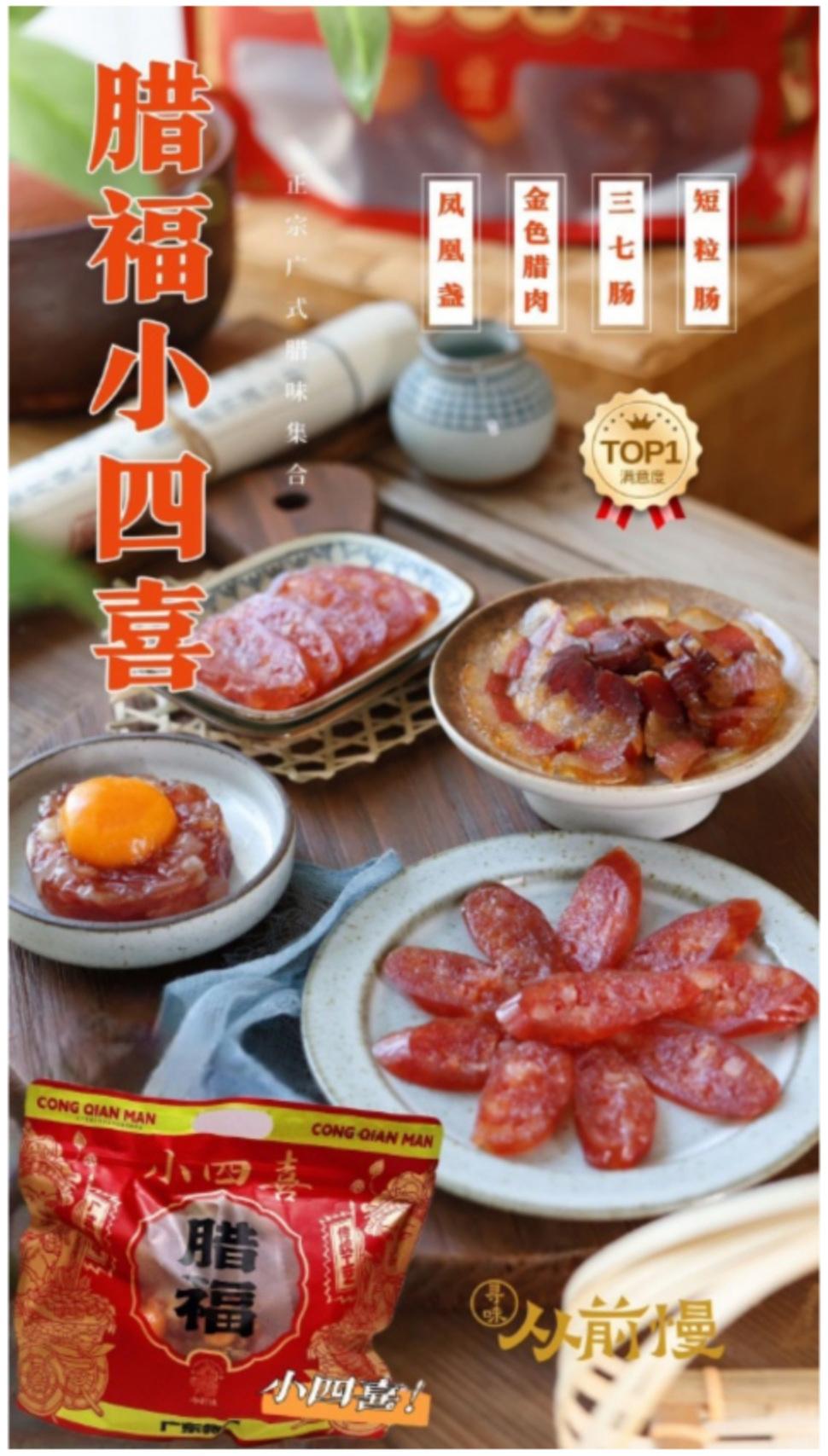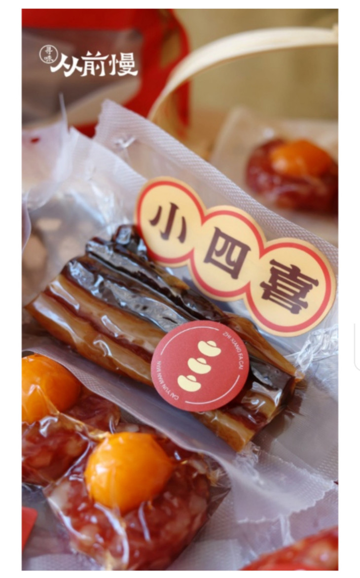腊福小四喜,内含三七肠220克、短粒肠120克、凤凰盏80克、金色腊肉80克。凤凰盏,是腊肉与咸蛋黄的完美结合,可以直接用来焖饭或清蒸,只要15分钟,就变成一道浓郁鲜美的硬菜;金色腊肉是用肥瘦均衡的五花肉为原料,蒸或炒都很有嚼劲,咬下去有种地道的油香,即使没有青菜搭配,也能轻松吃下两碗大米饭;短粒肠是低盐低糖的咸香微甜风味,还融入了广东独特的甜酒香,香气扑鼻,是独有的鲜美;三七肠,则是三分肥七分瘦的腊肠,咸香油润,随便炒菜,都美味极了!
