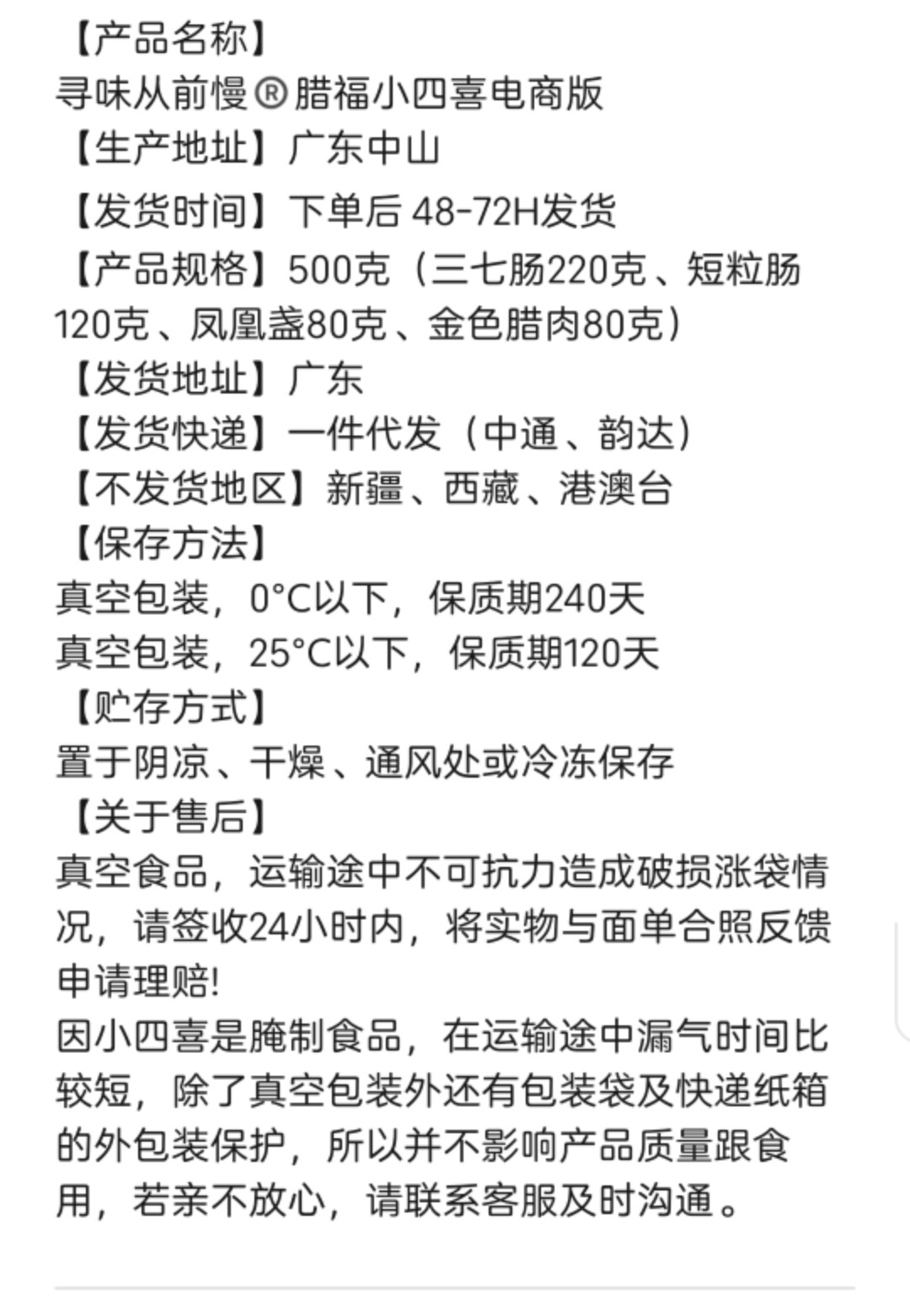 温馨小提示:食品类产品,不支持拒收、修改地址及7天无理由退换货。如因个人口味问题(认为不好吃、太甜、味道不好等)或主观认为分量少、分量不足的情况,均不在售后范围。对于真空食品,在运输途中因不可抗力造成的破损涨袋情况,请于签收24小时内,将实物与面单合照反馈给客服申请理赔。