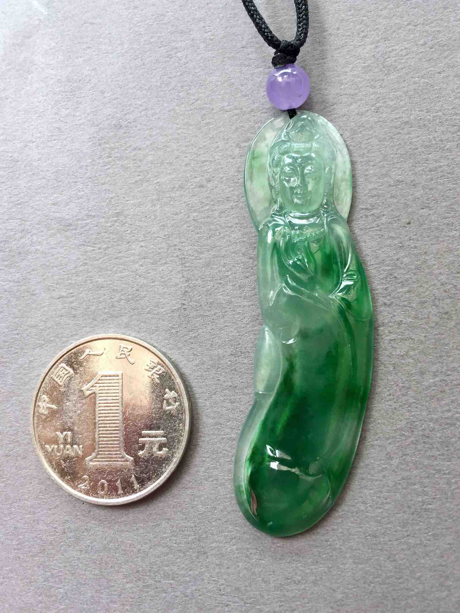 大尺寸的冰种阳绿翡翠观音,缅甸料,巧雕设计,自然与人工的巧妙结合,有一种流动的韵律之美,宝贝种水很透,起荧光,绿色浓郁,最难得的是尺寸这么大,太贵气了,推荐收藏,60.9×17.8×5.5mm