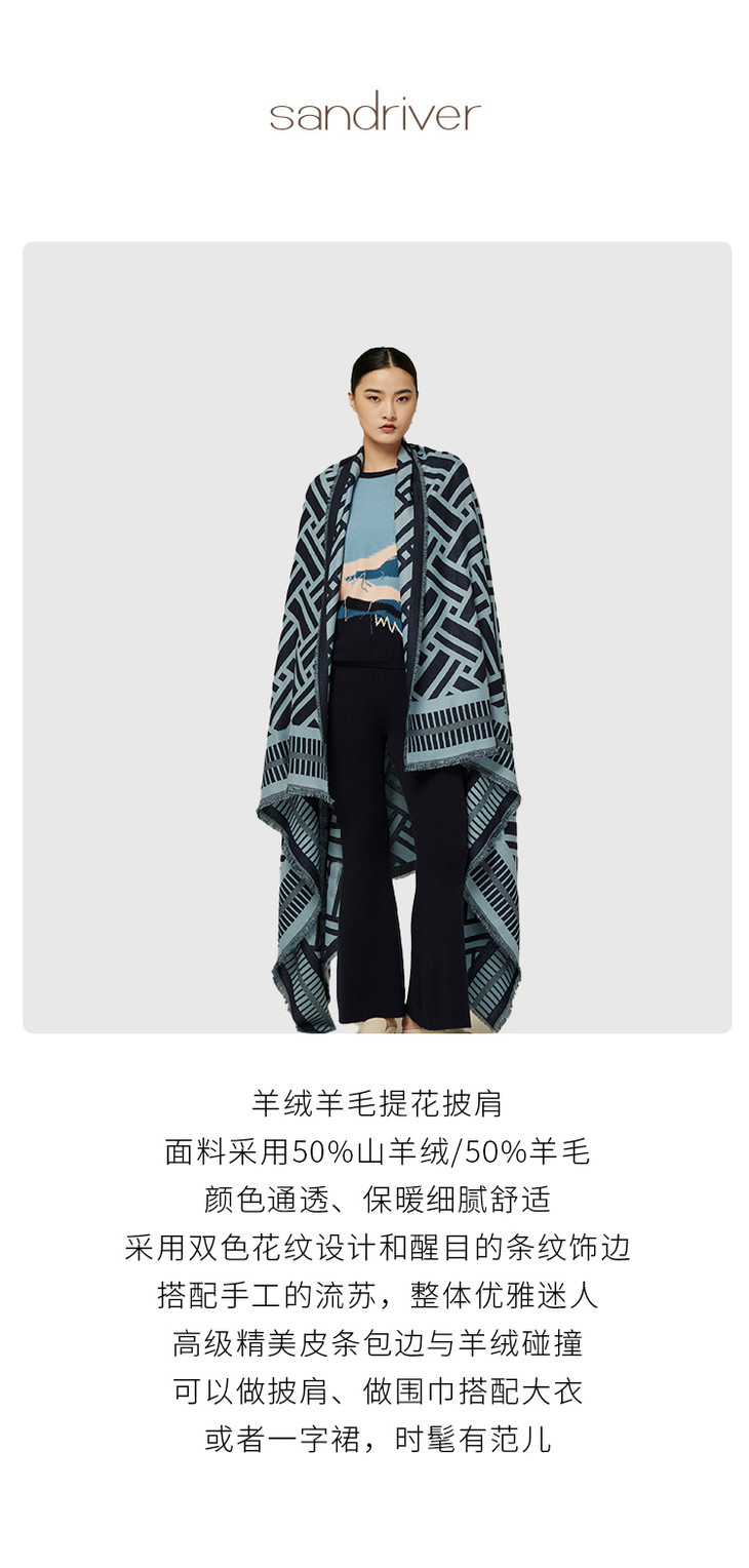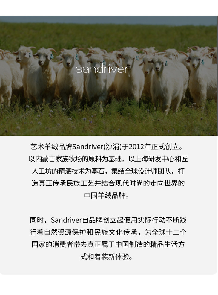 历年在巴黎时装周亮相,享誉世界的艺术羊绒品牌[Sandriver 沙涓]由羊绒布道者郭秀玲女士创立。阿拉善自有牧场纯种羔羊绒,日本国宝设计师小筱顺子,上海自有基地精工细作。承载羊绒情怀,坚持匠人品质。
