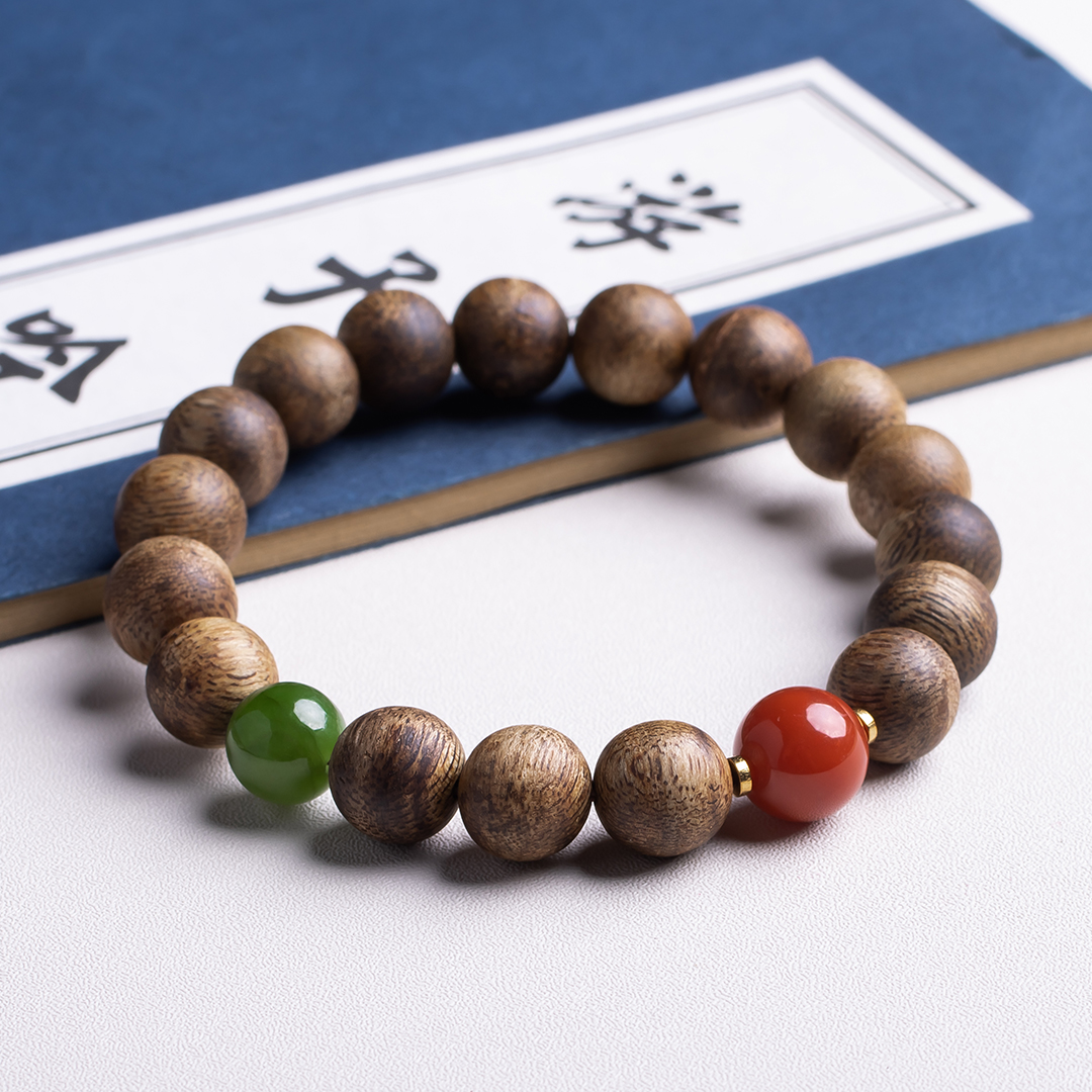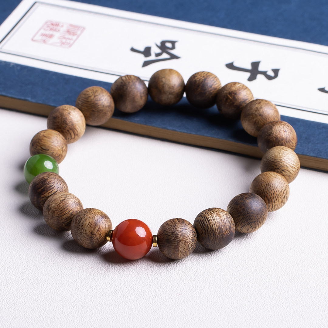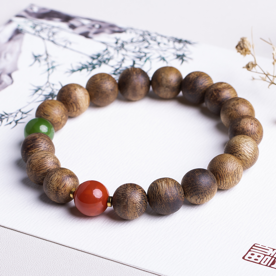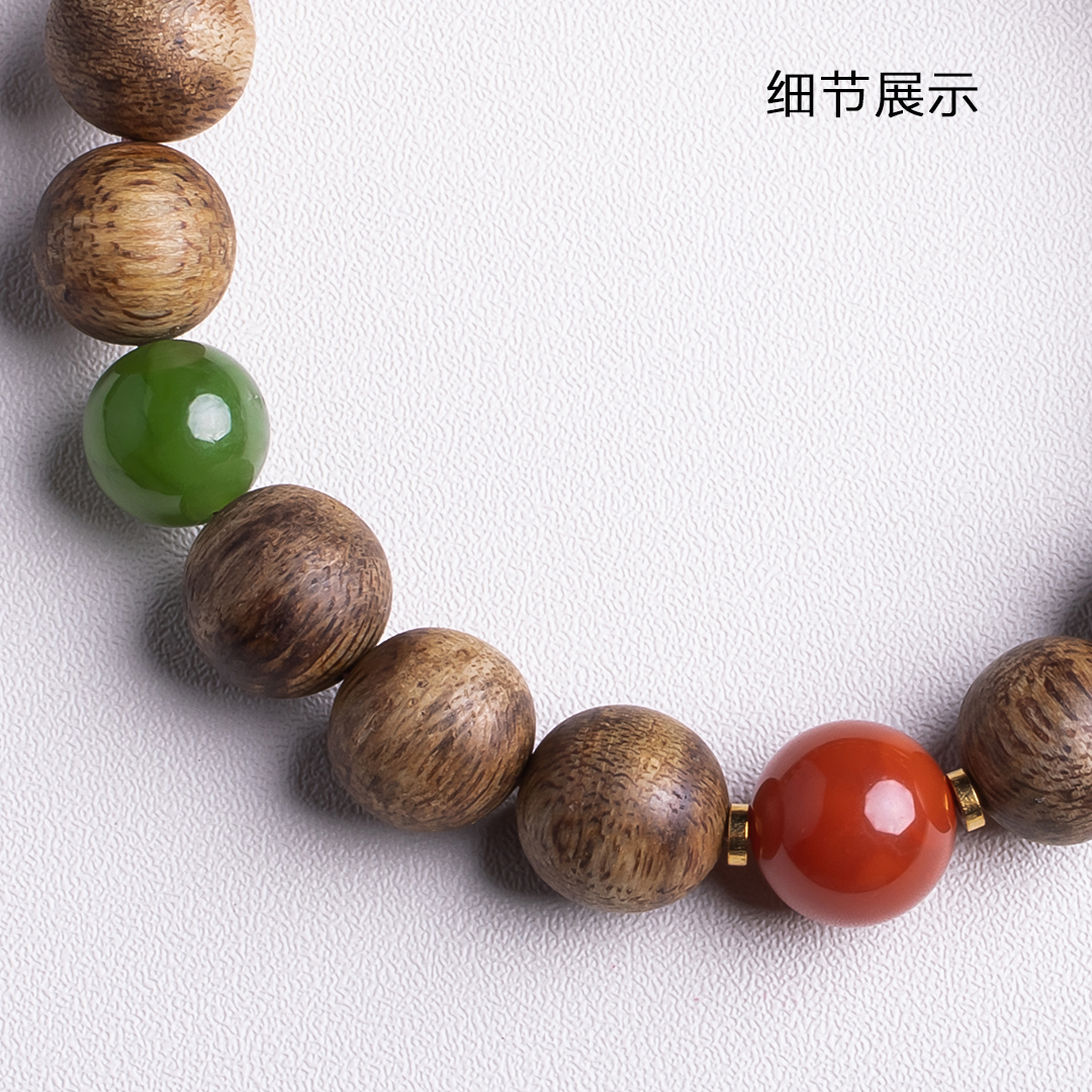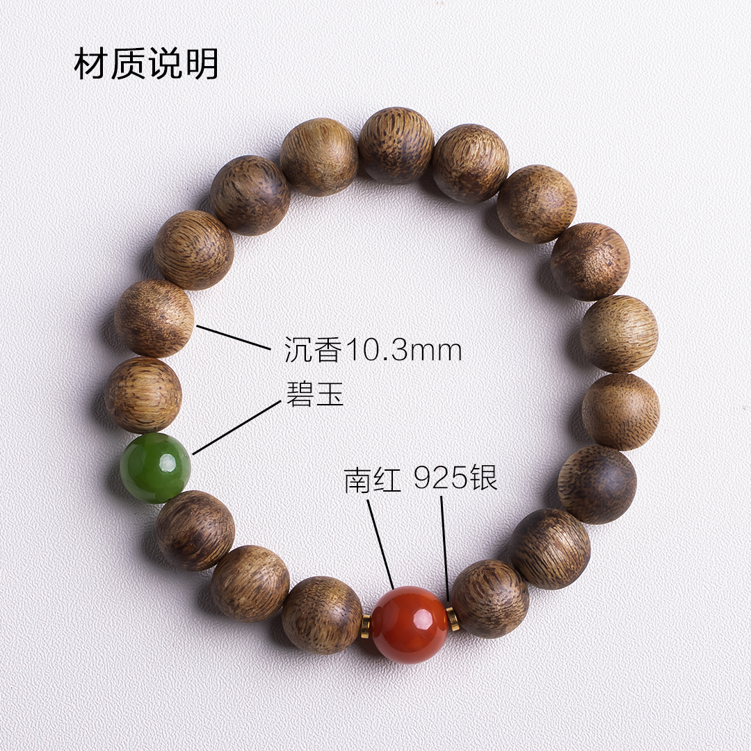 XY0323沉香+南红碧玉手串,天然沉香约10.3mm,原色原味,香味自然清甜,一颗全绿碧玉和一颗满色肉南红的搭配,温和典雅,吉祥端庄,更有鸿运当头带来好运。