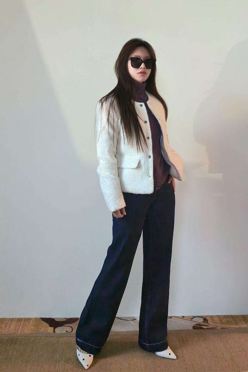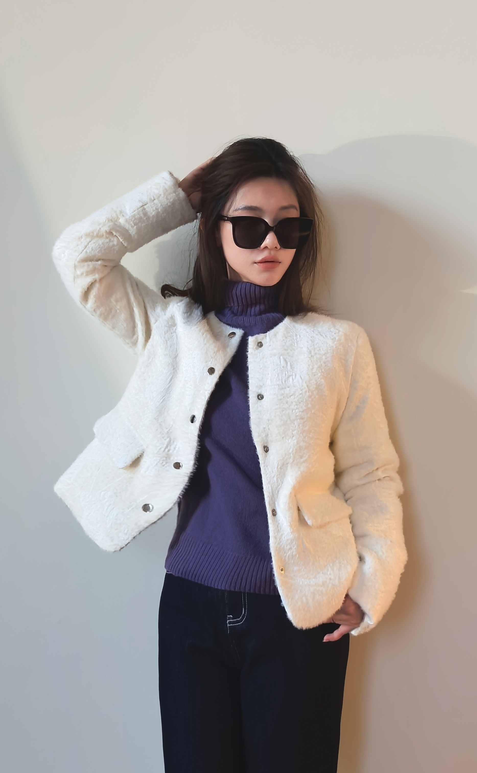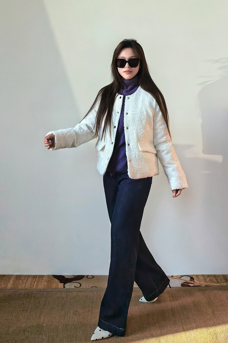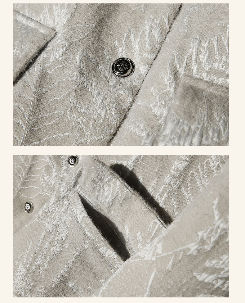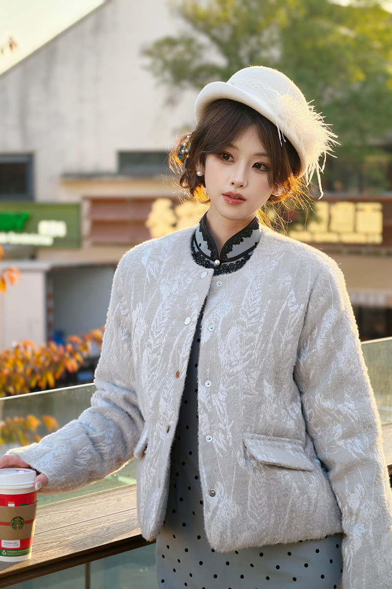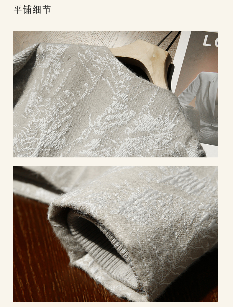 采用特殊的提花工艺,将纱线巧妙交织,仿佛将冬日晨雾揉进衣身~~