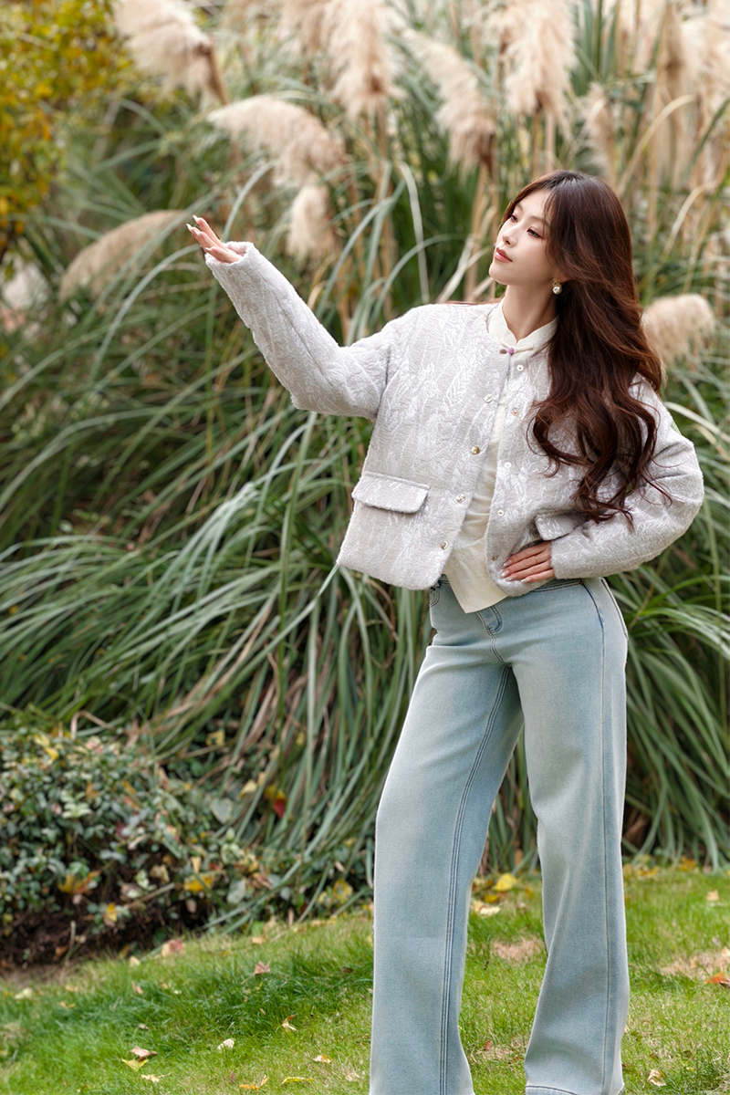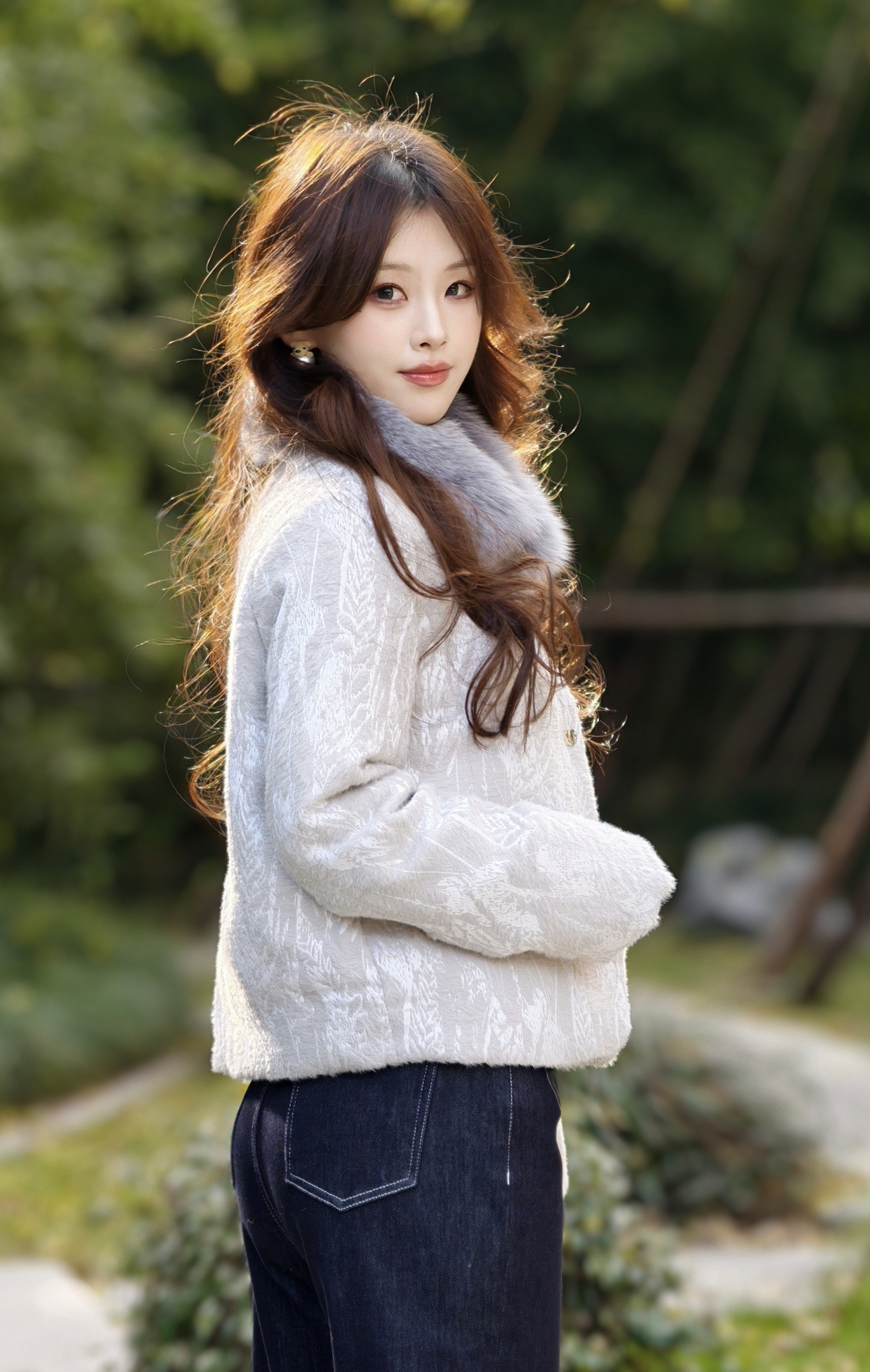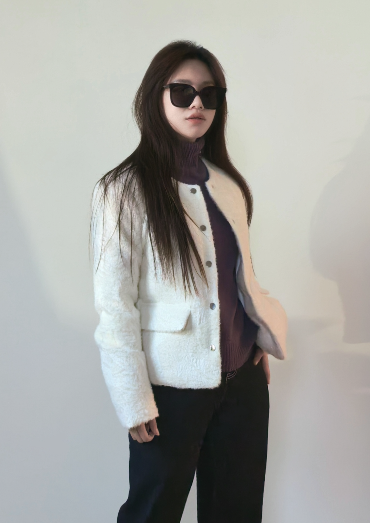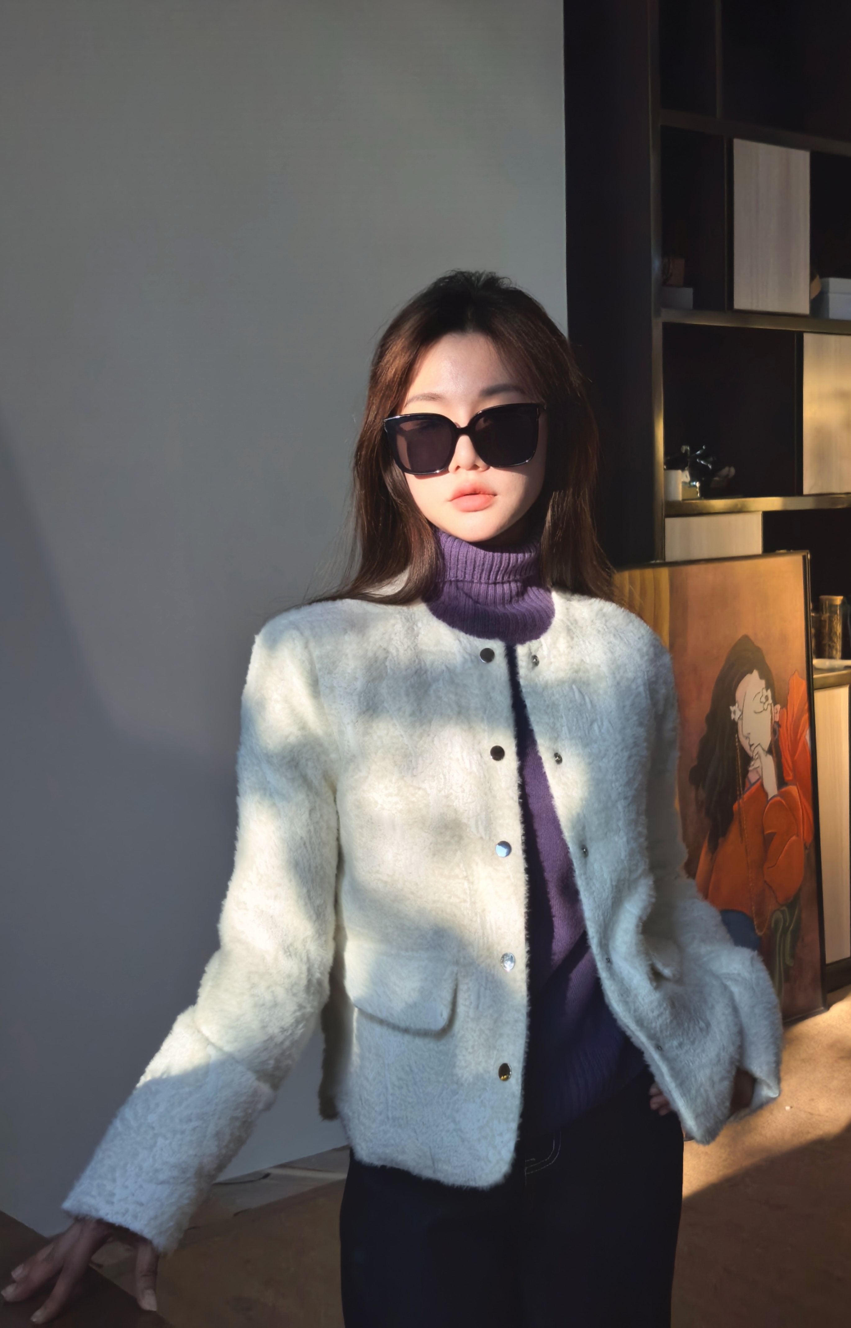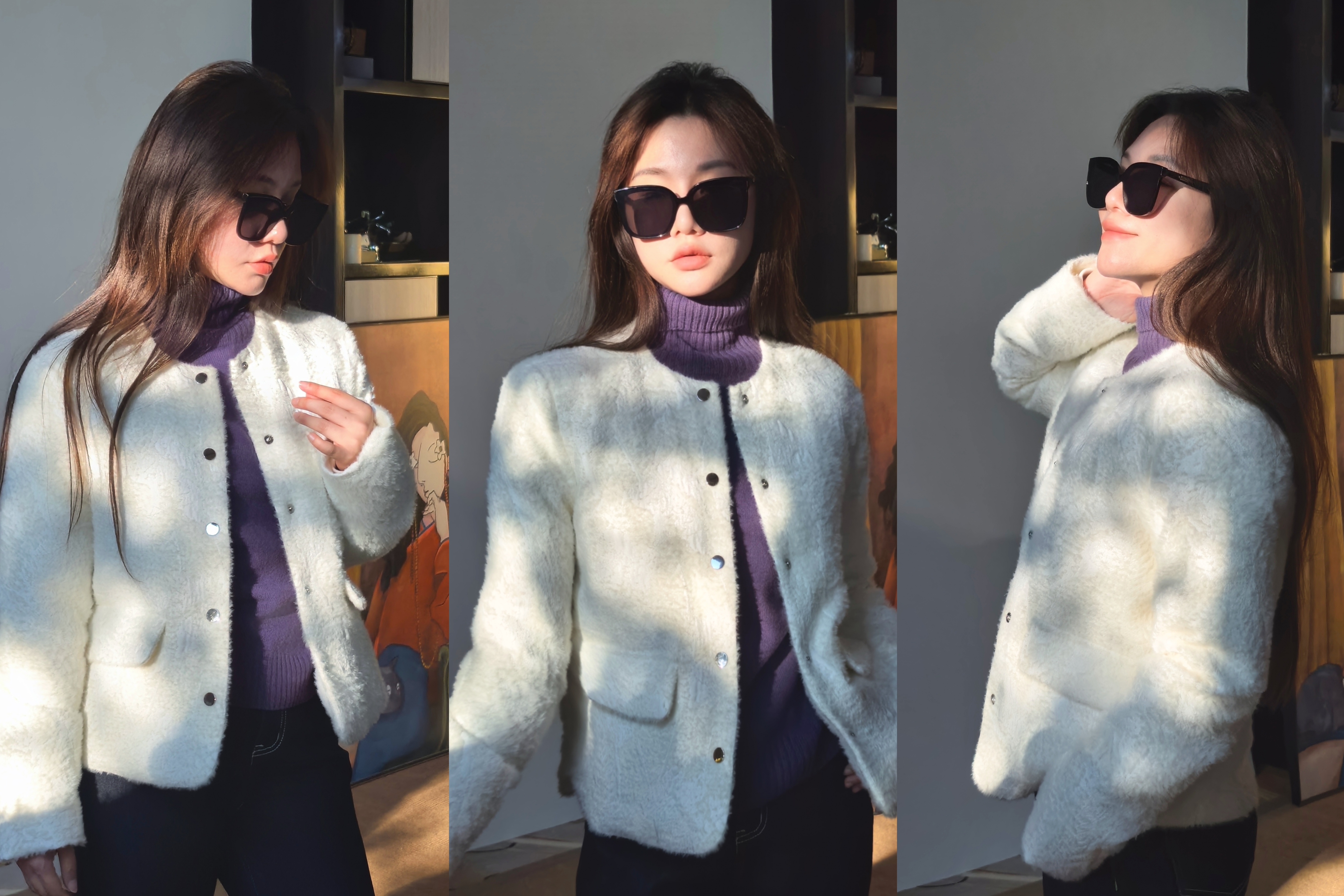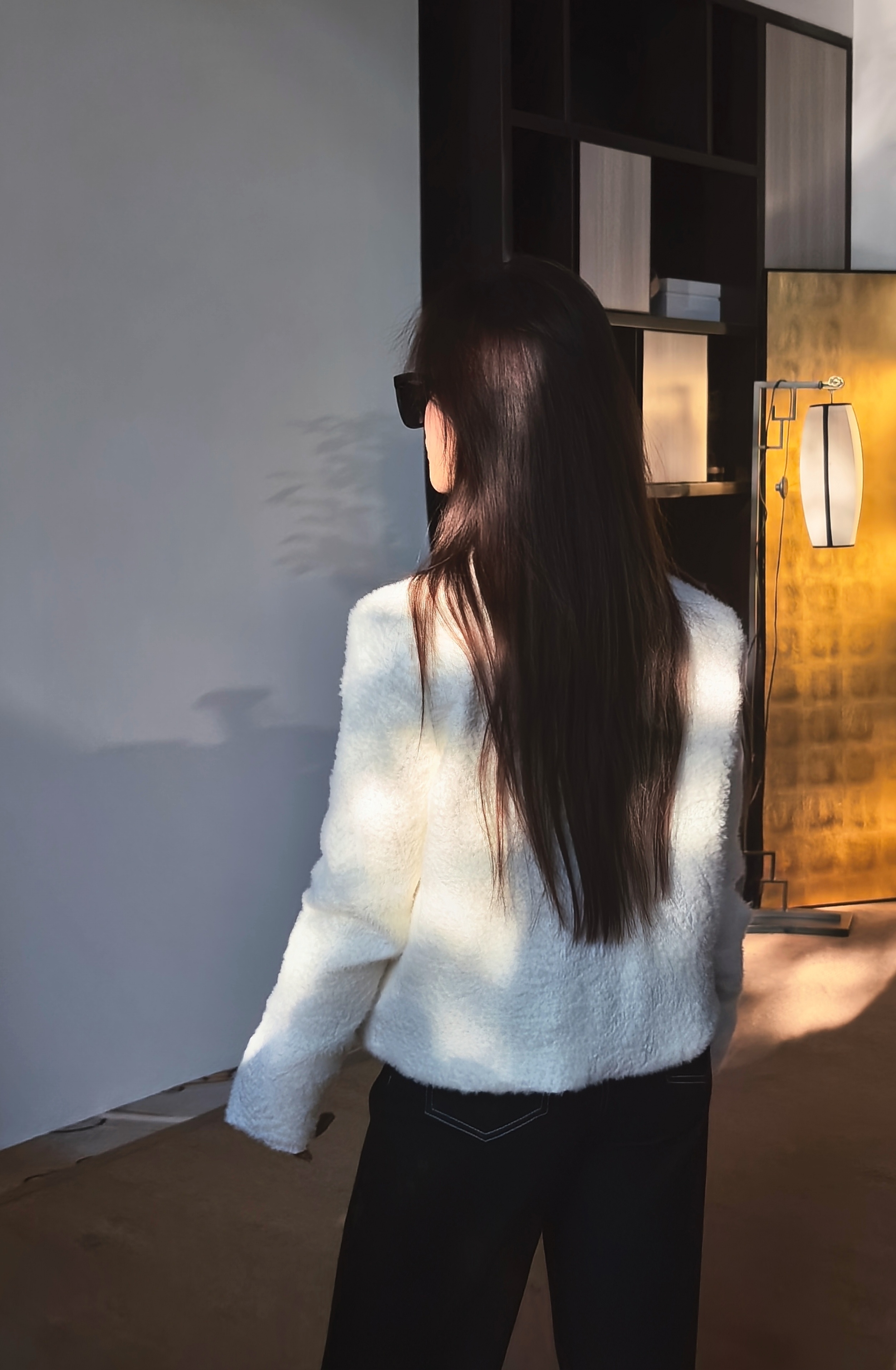 采用特殊的提花工艺,将纱线巧妙交织,仿佛将冬日晨雾揉进衣身~~