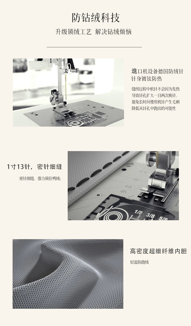 🪡1寸13针,密针细缝,强力锁住鸭绒;确保绒朵牢牢锁于衣内,温暖不“逃逸”~!