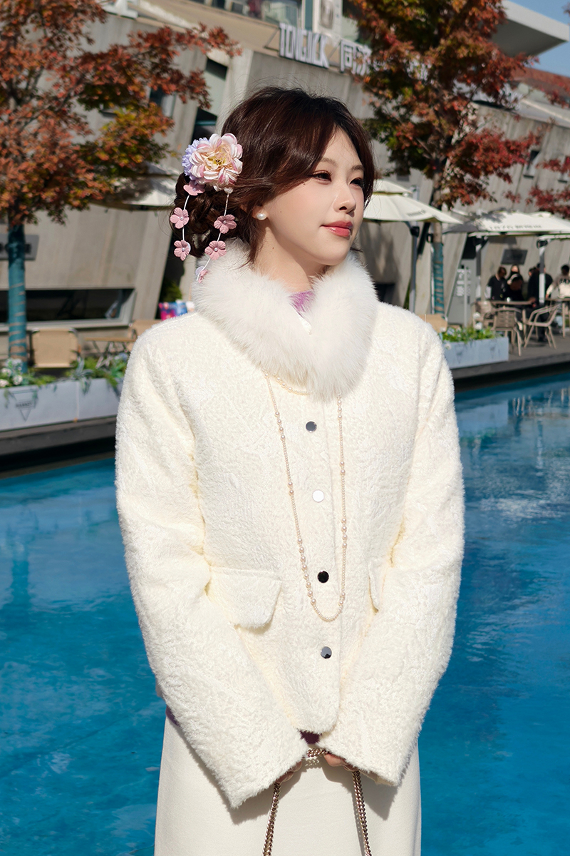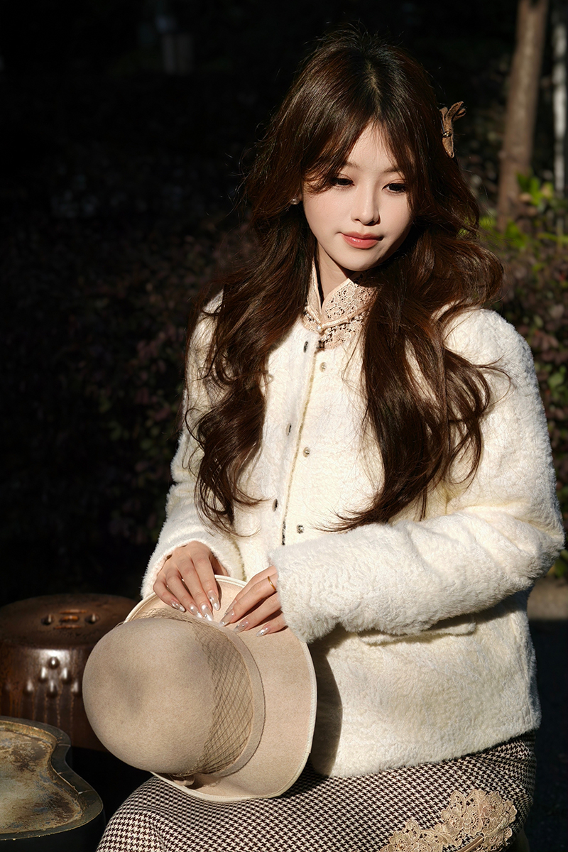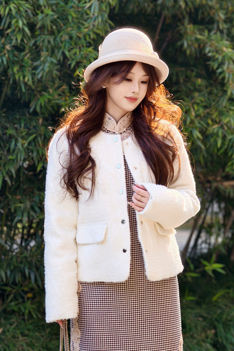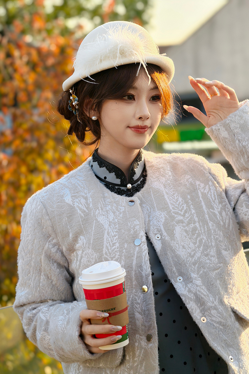 恰如其分地露出旗袍立领与盘扣,既不喧宾夺主,又能衬托颈间精致。